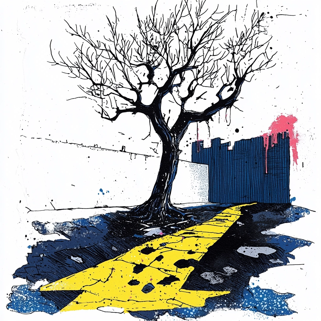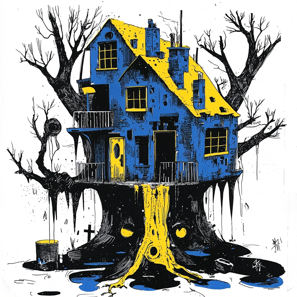 Sharp outlines dominate the spatial arrangement, simultaneously balanced by fluid, irregular textures. Lighting emphasizes stark separations between vivid yellows, inky blacks, and rich blues, creating striking focus points.