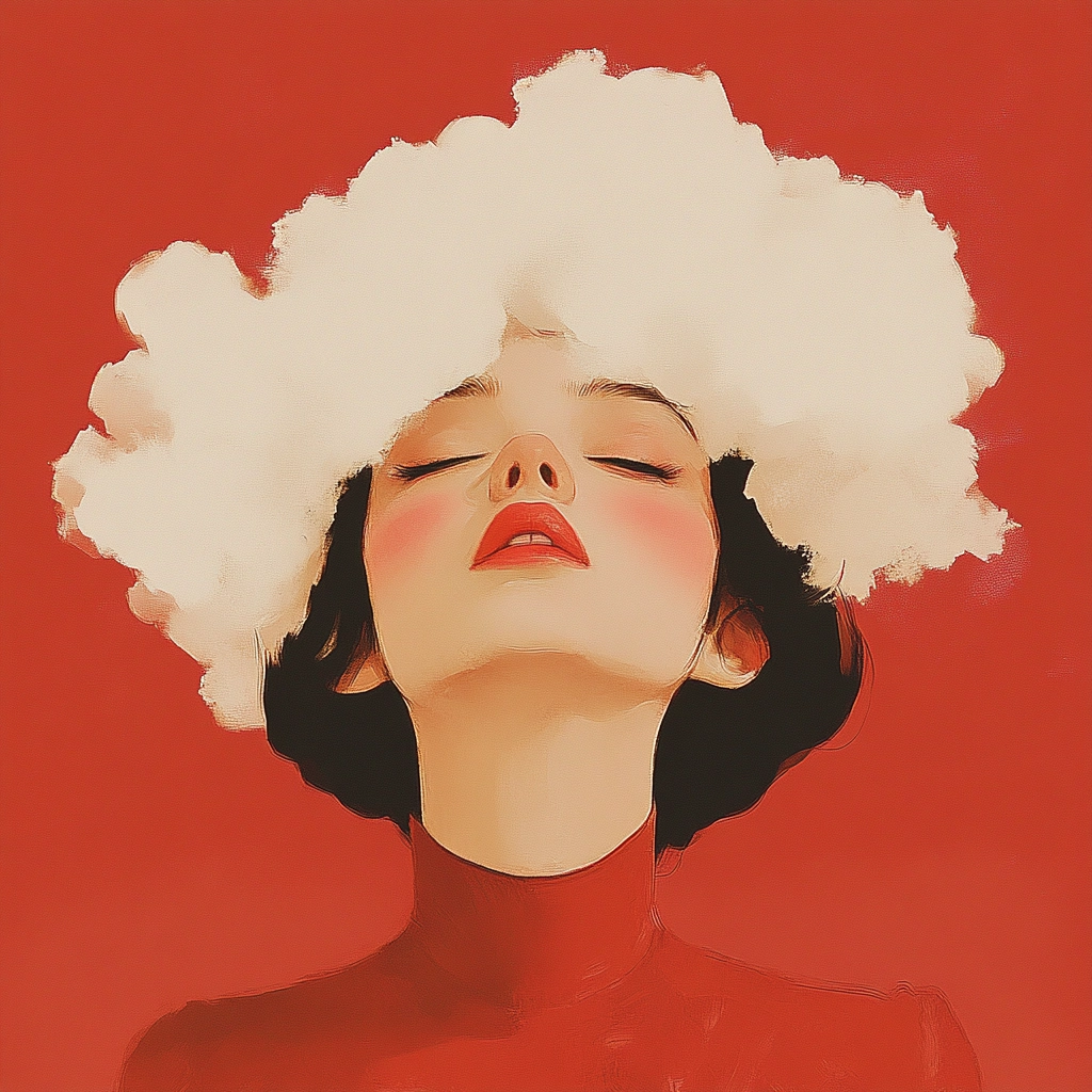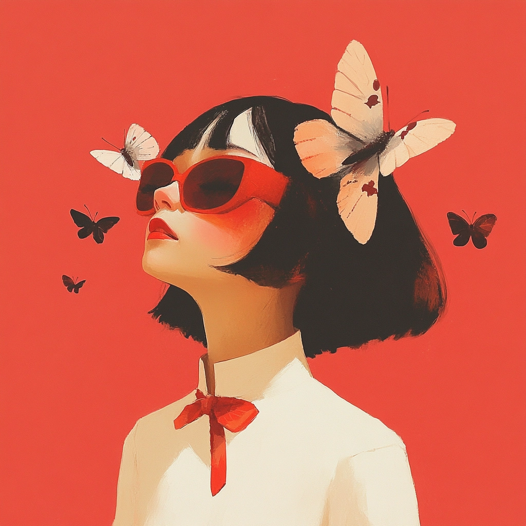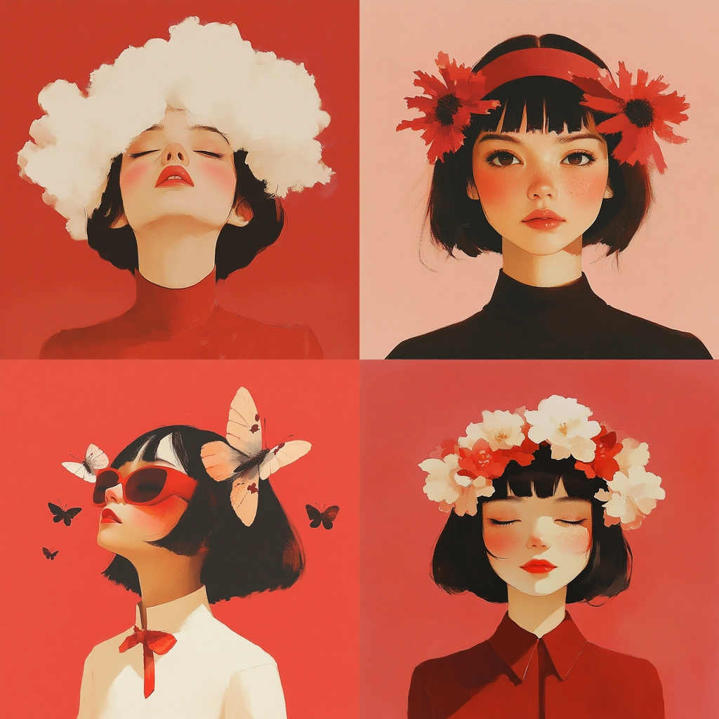 Highly contrasted compositions dominated by vibrant reds and deep blacks.