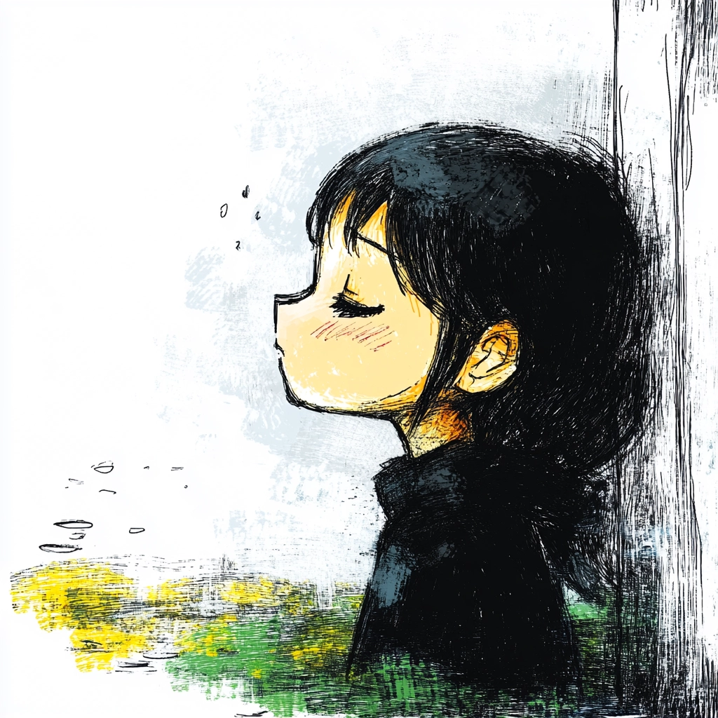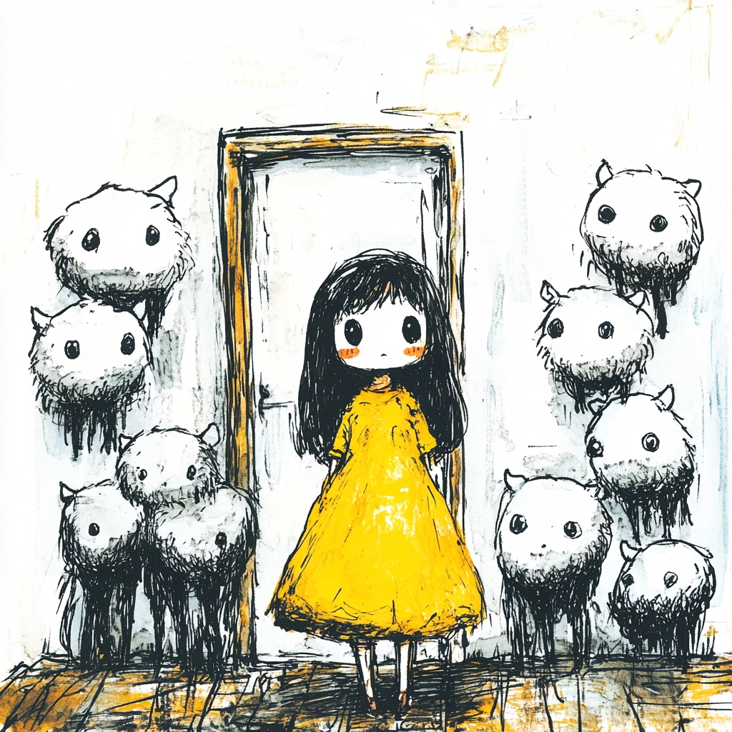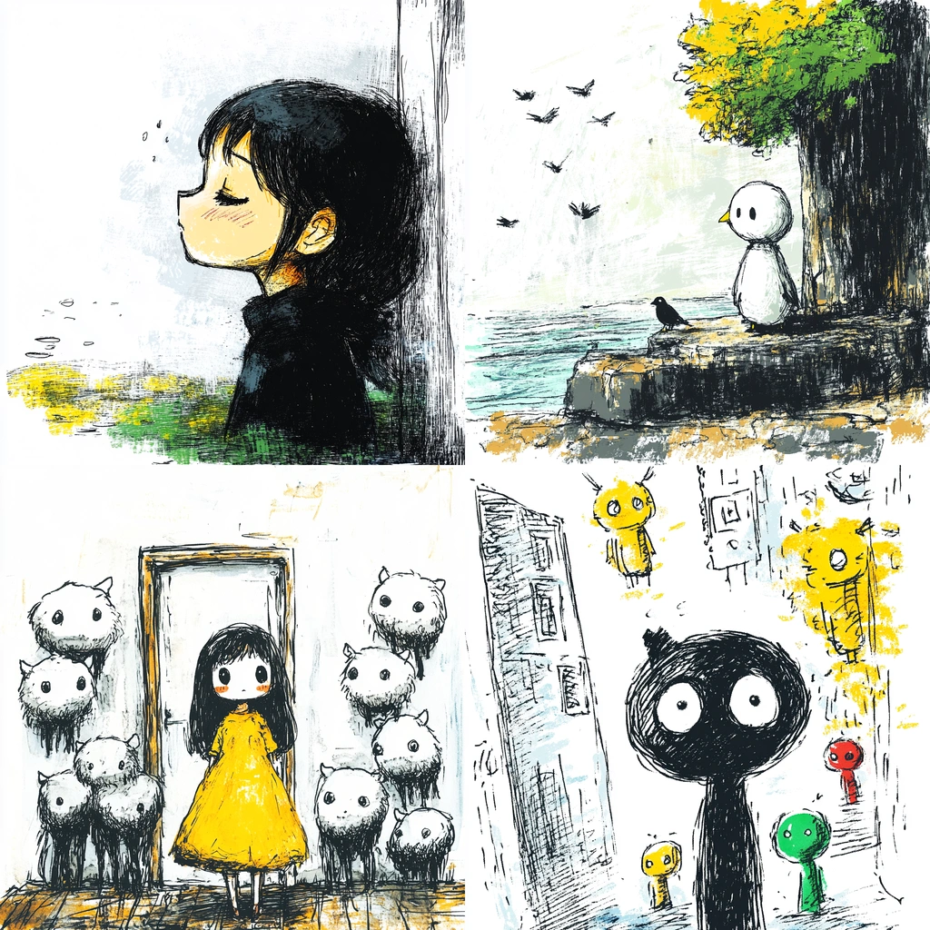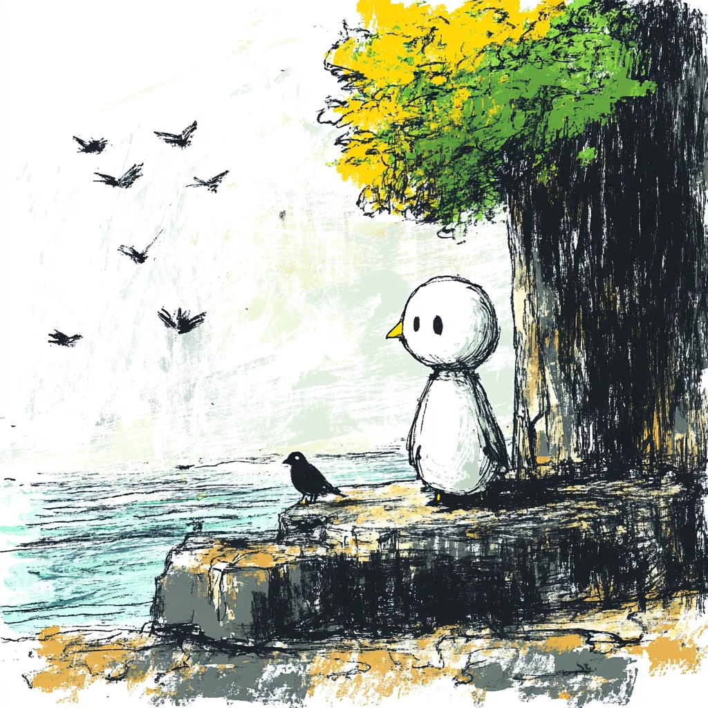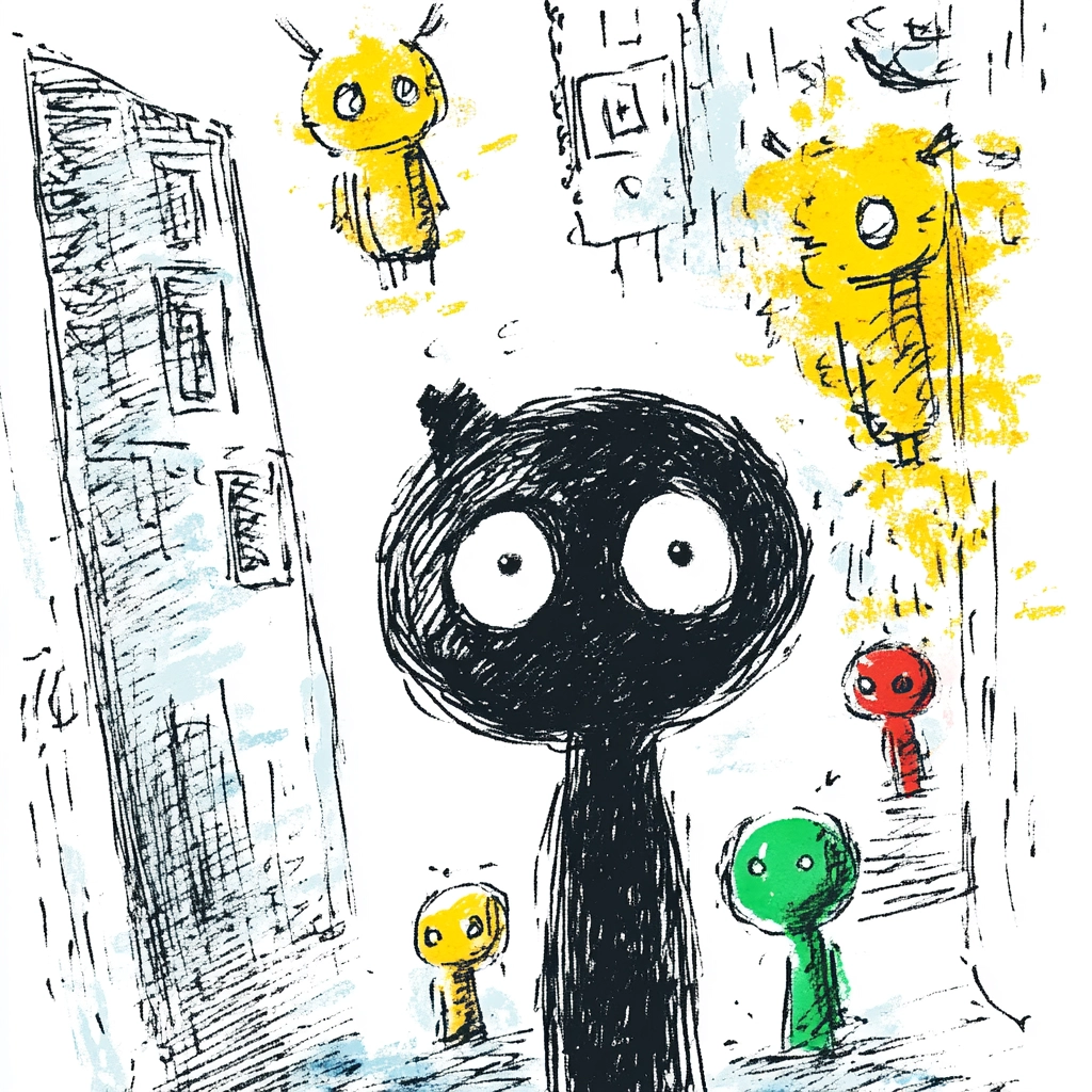 The lighting is flat, emphasizing the outlined form, while colors are muted and textured, enhancing a sense of naive simplicity and visual curiosity with a linear arrangement and sketch-like quality.