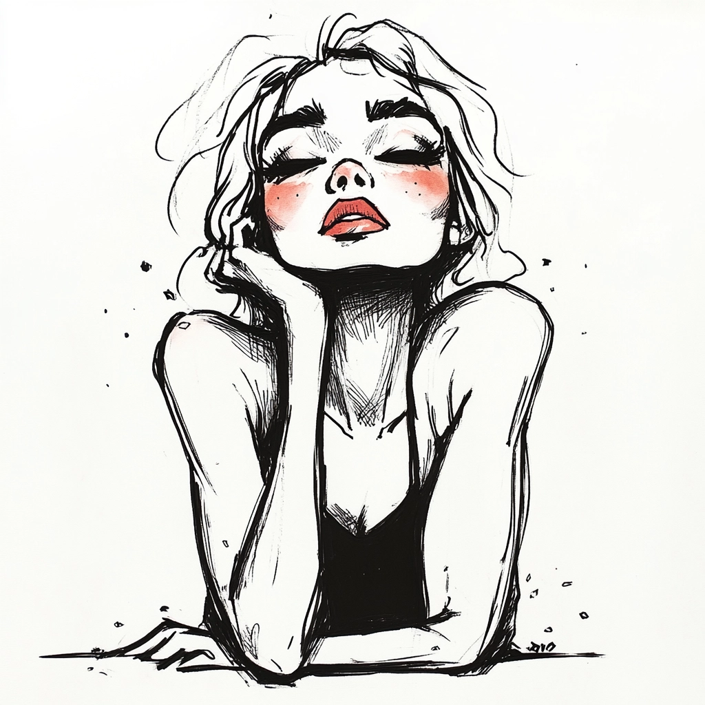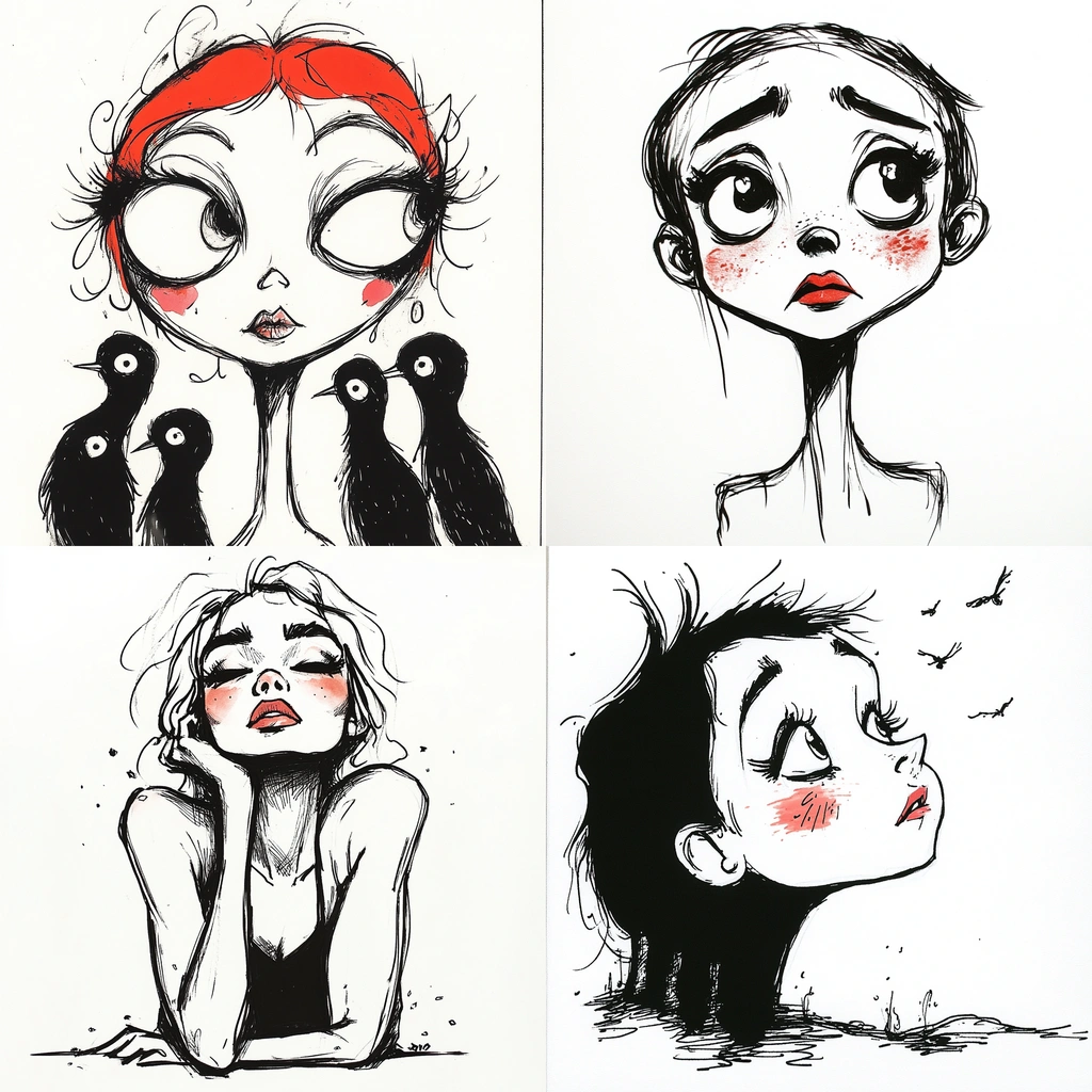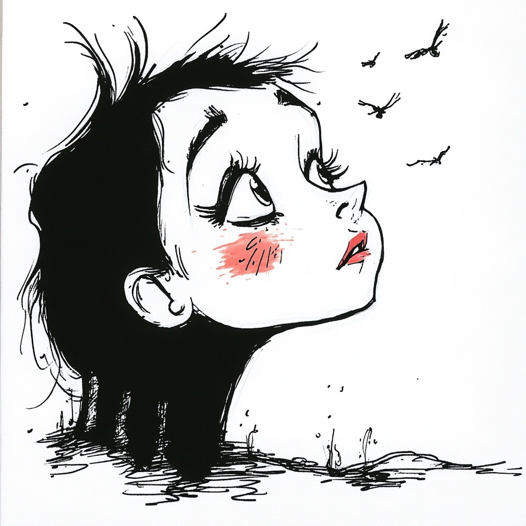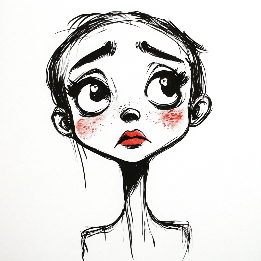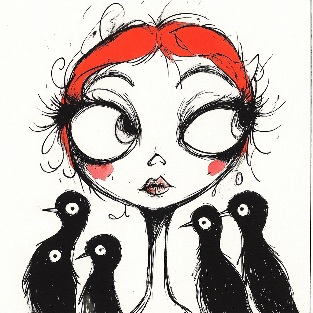 Uses thick black lines with striking red contrasts.