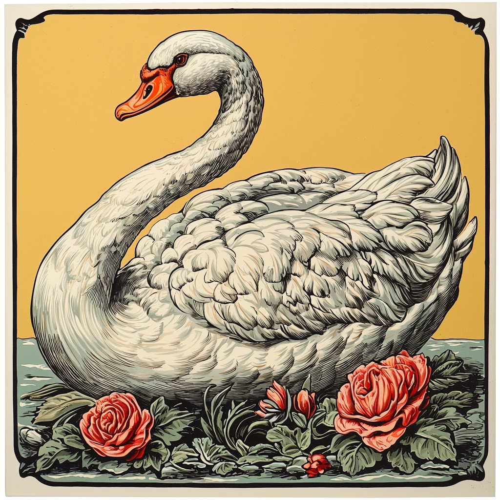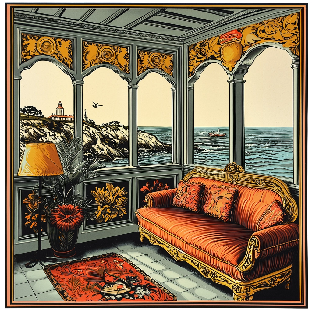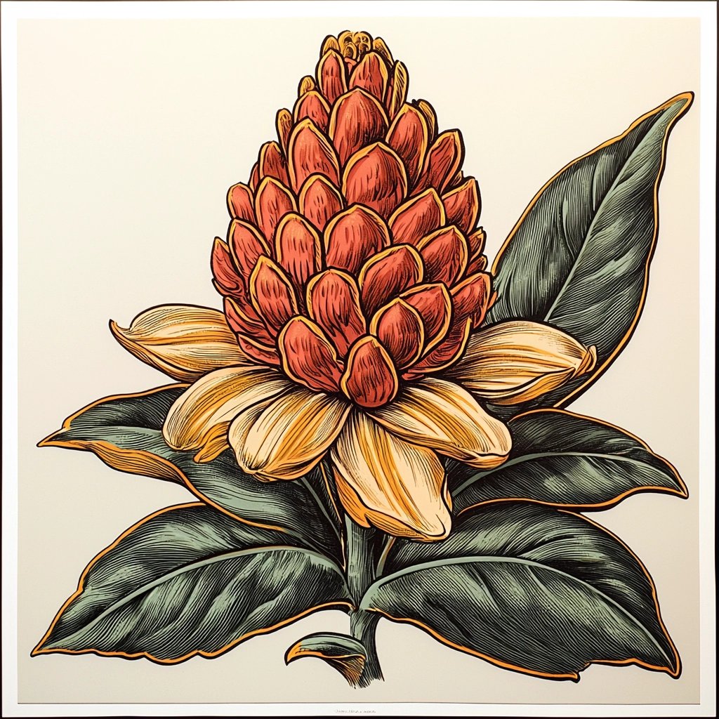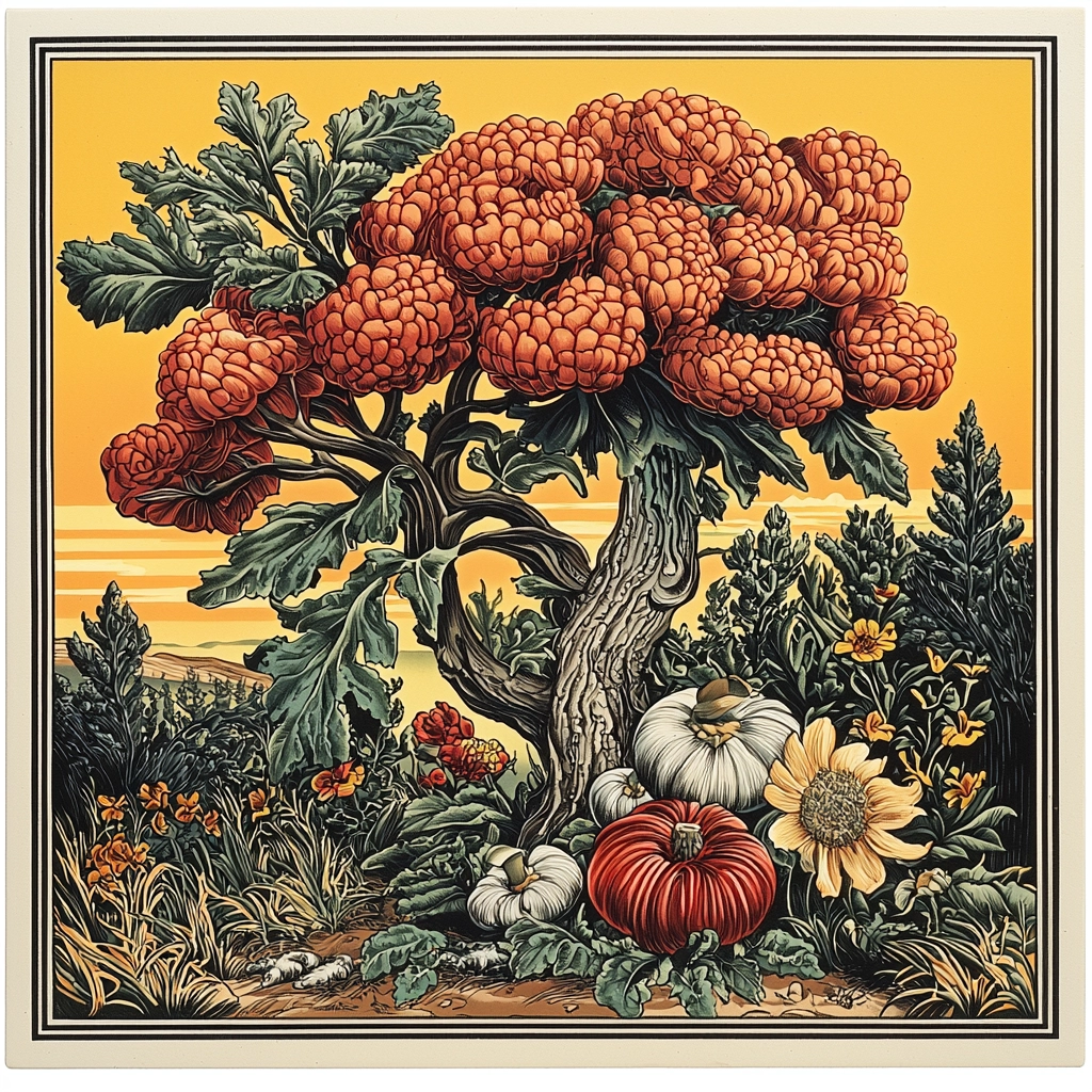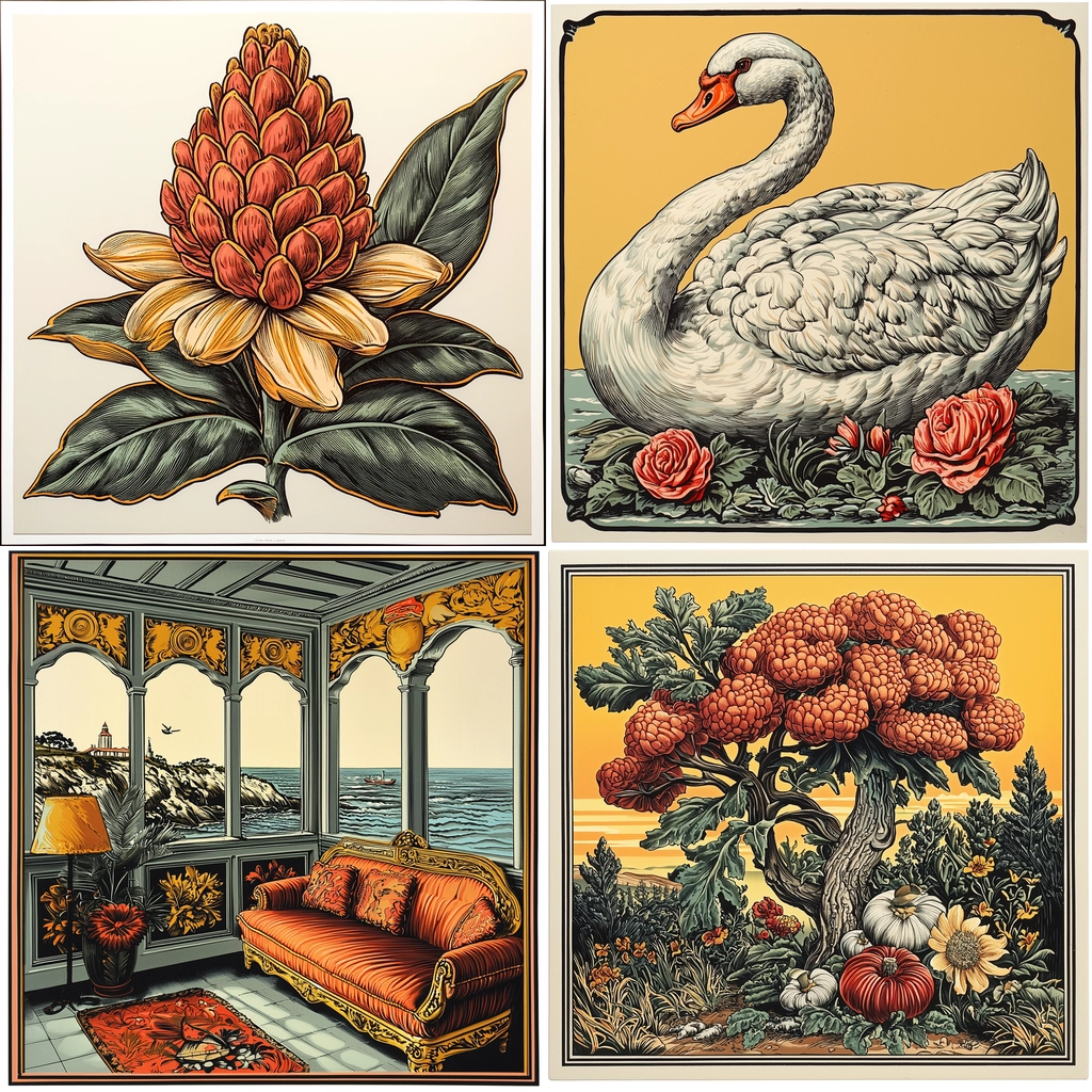 Distinctive, heavy lines enhance the definition of forms, while warm tones of orange, red, and yellow dominate each piece. The shading subtly suggests depth, and the textures capture fine details, adding realistic touches to stylized elements without overwhelming the clarity of the imagery.