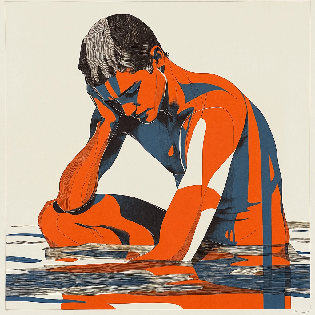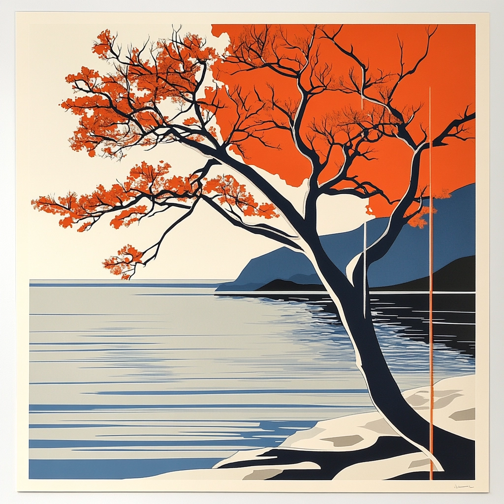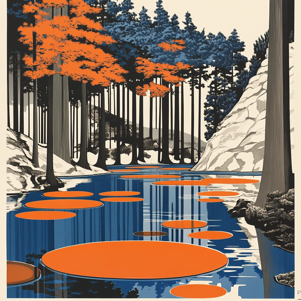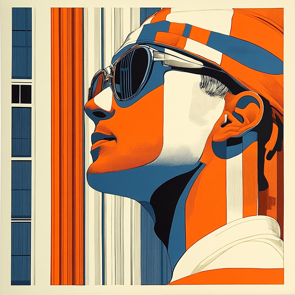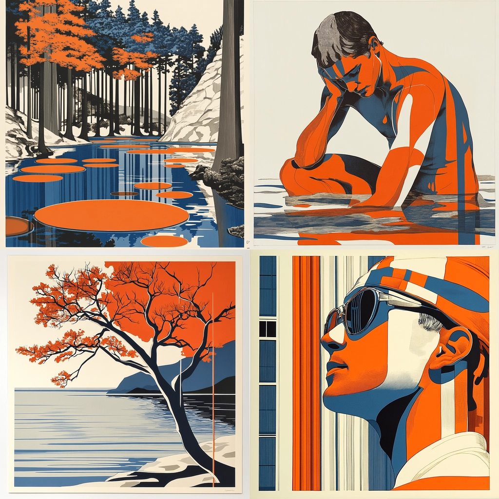 Sharp contrasts of bold orange and blue tones with strong linear compositions.