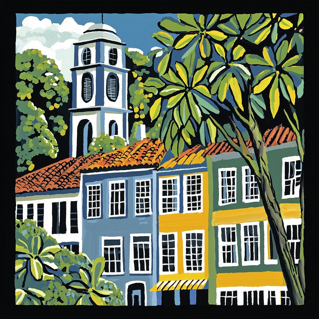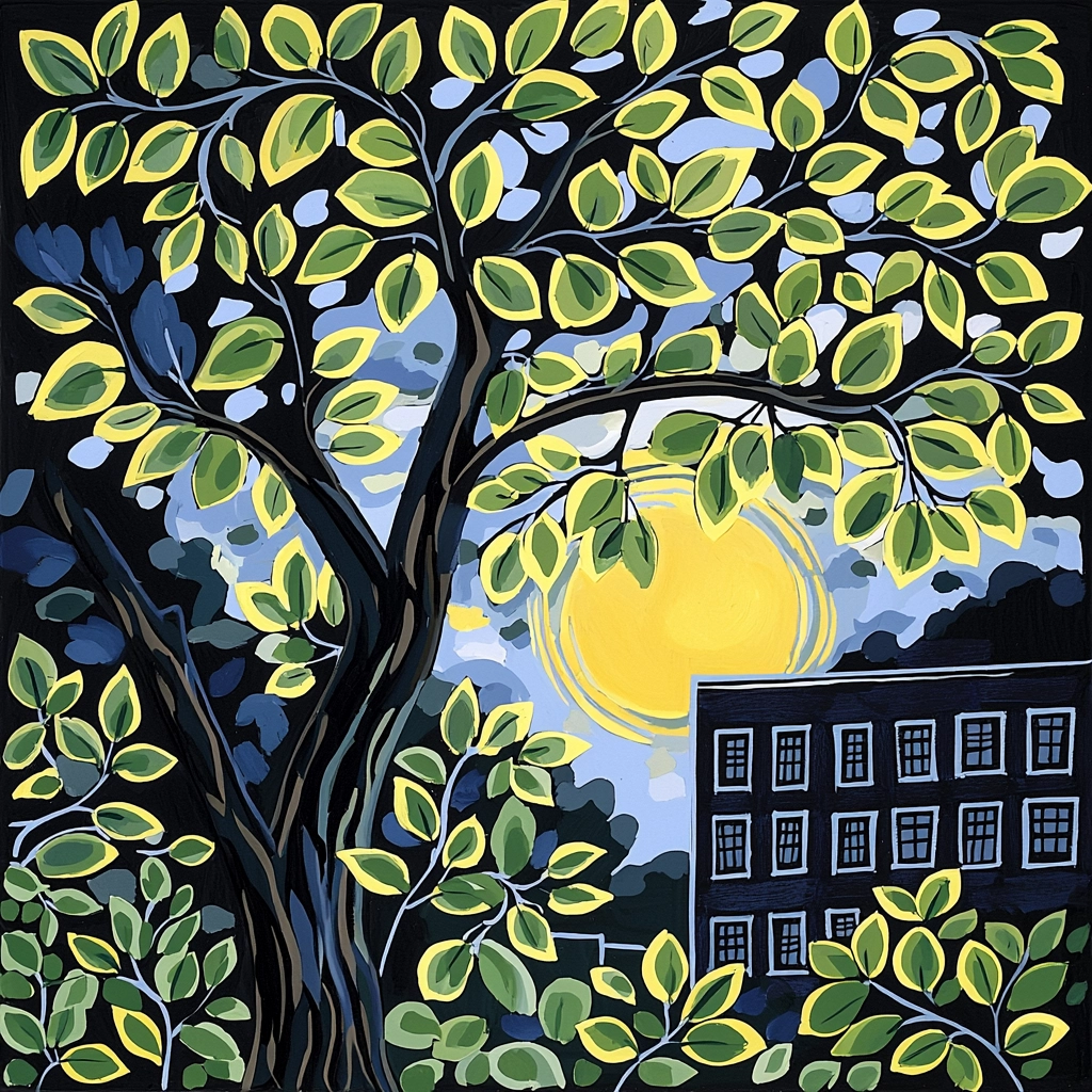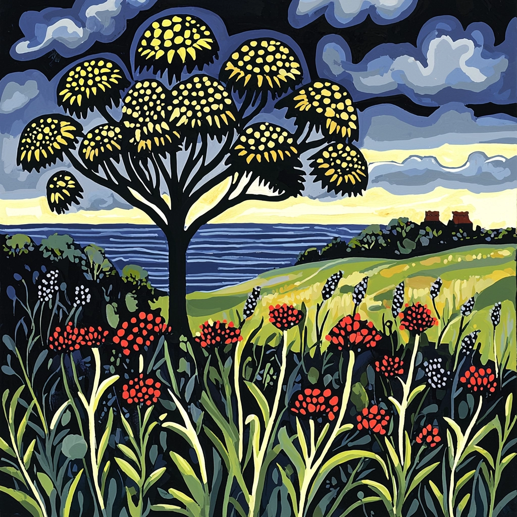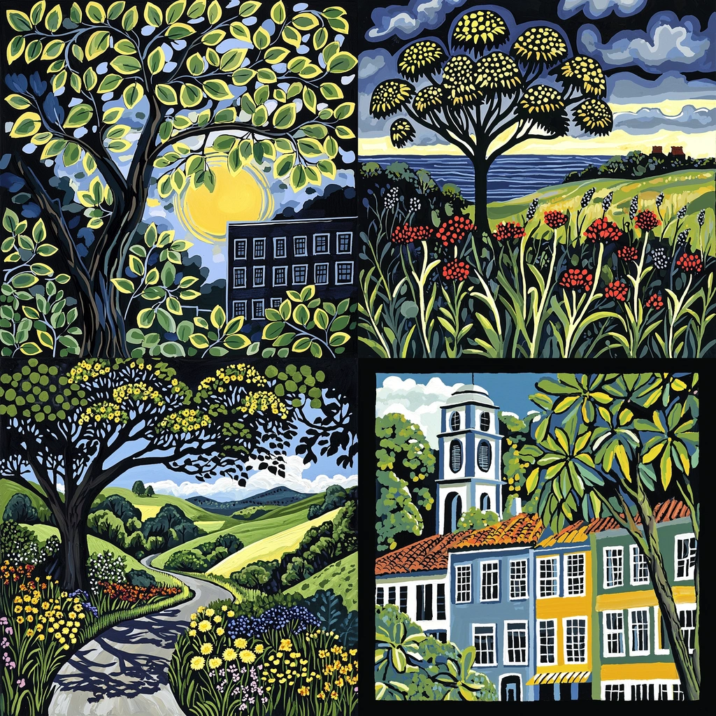 Vivid use of greens and yellows create a lively visual with dynamic compositions.