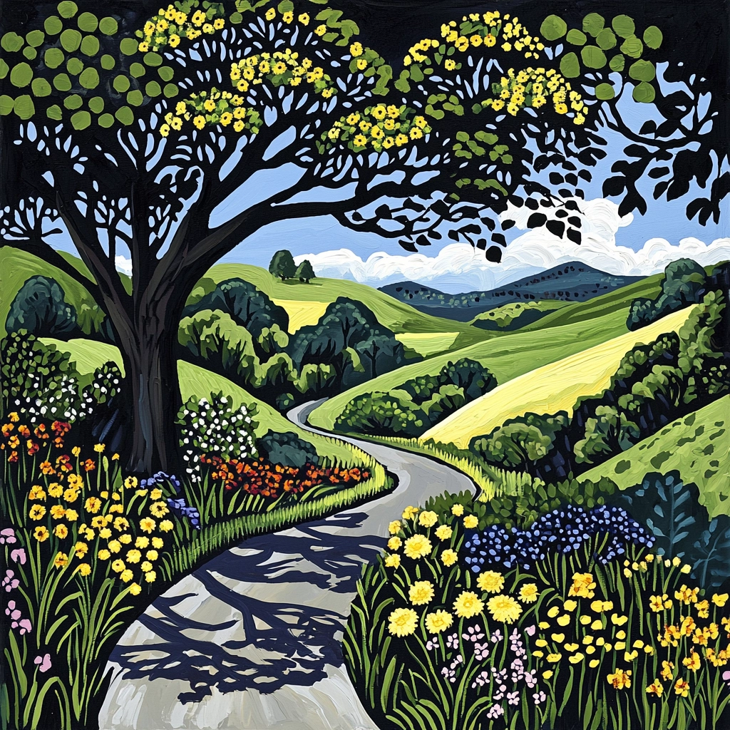 The lighting is vibrant, casting playful shadows and highlights. The colors are bold and sharply defined, emphasizing depth and movement. The texture is smooth yet layered, enhancing the sense of verdancy.