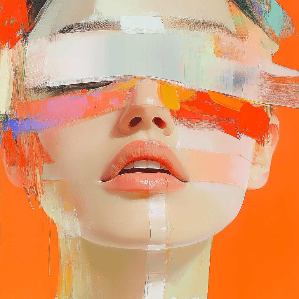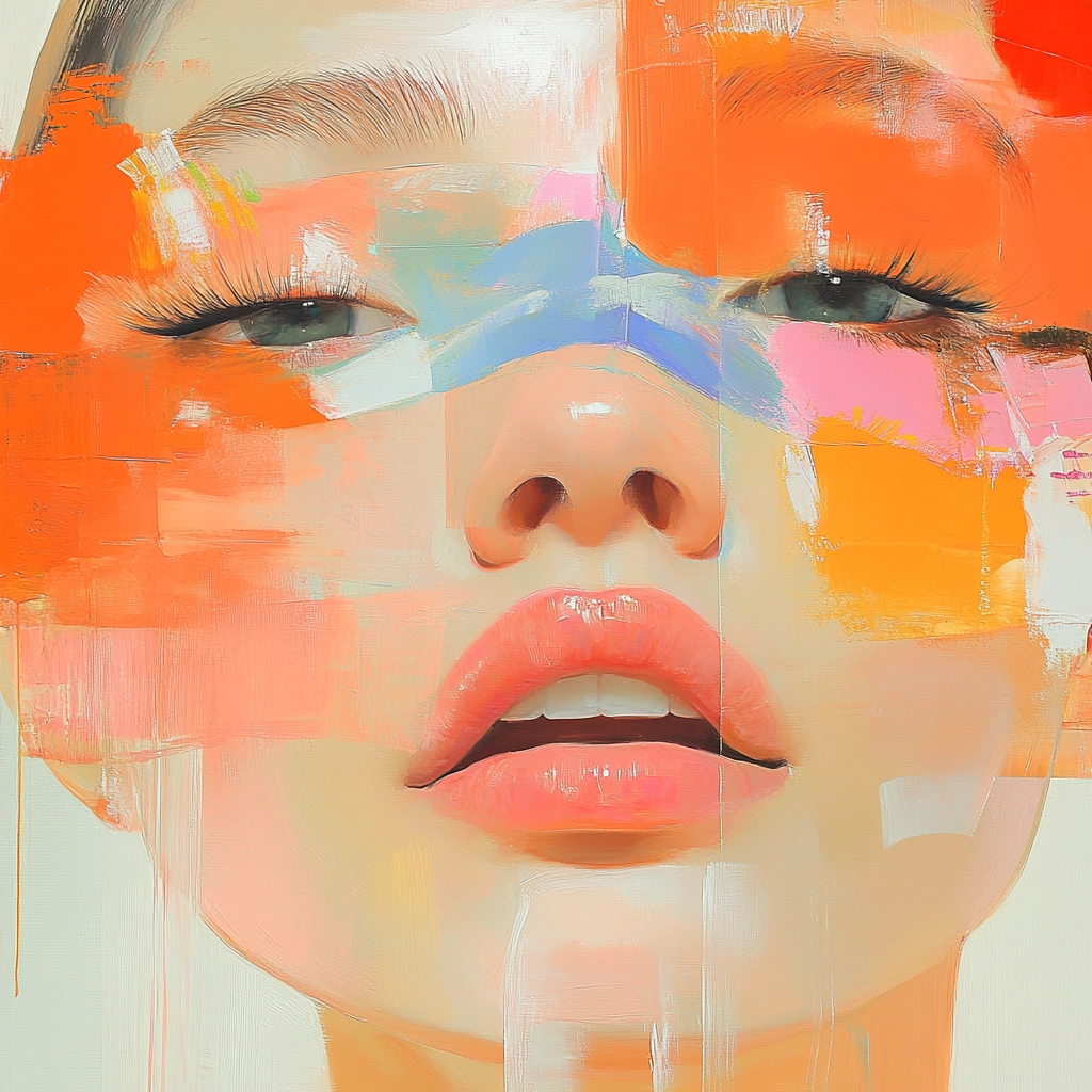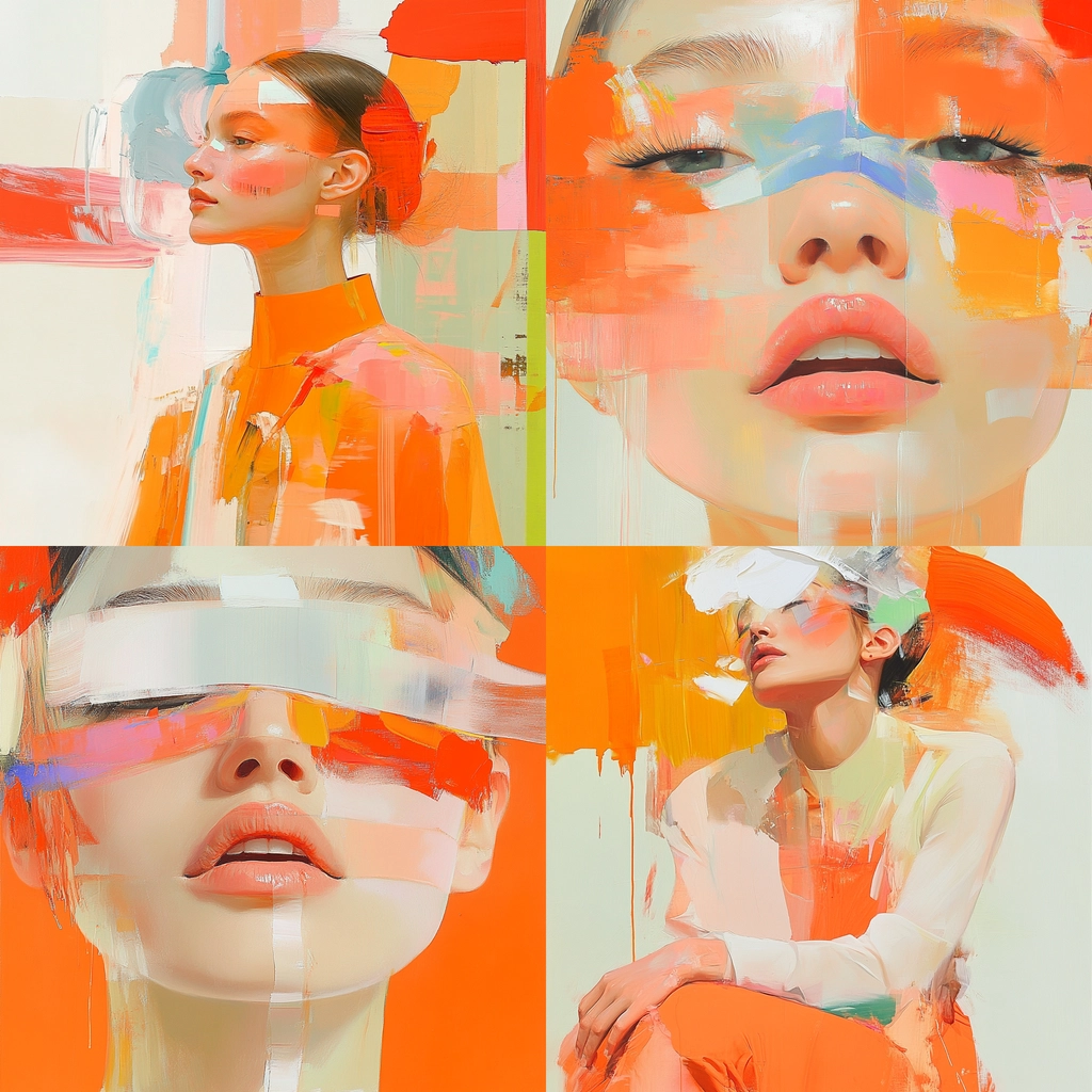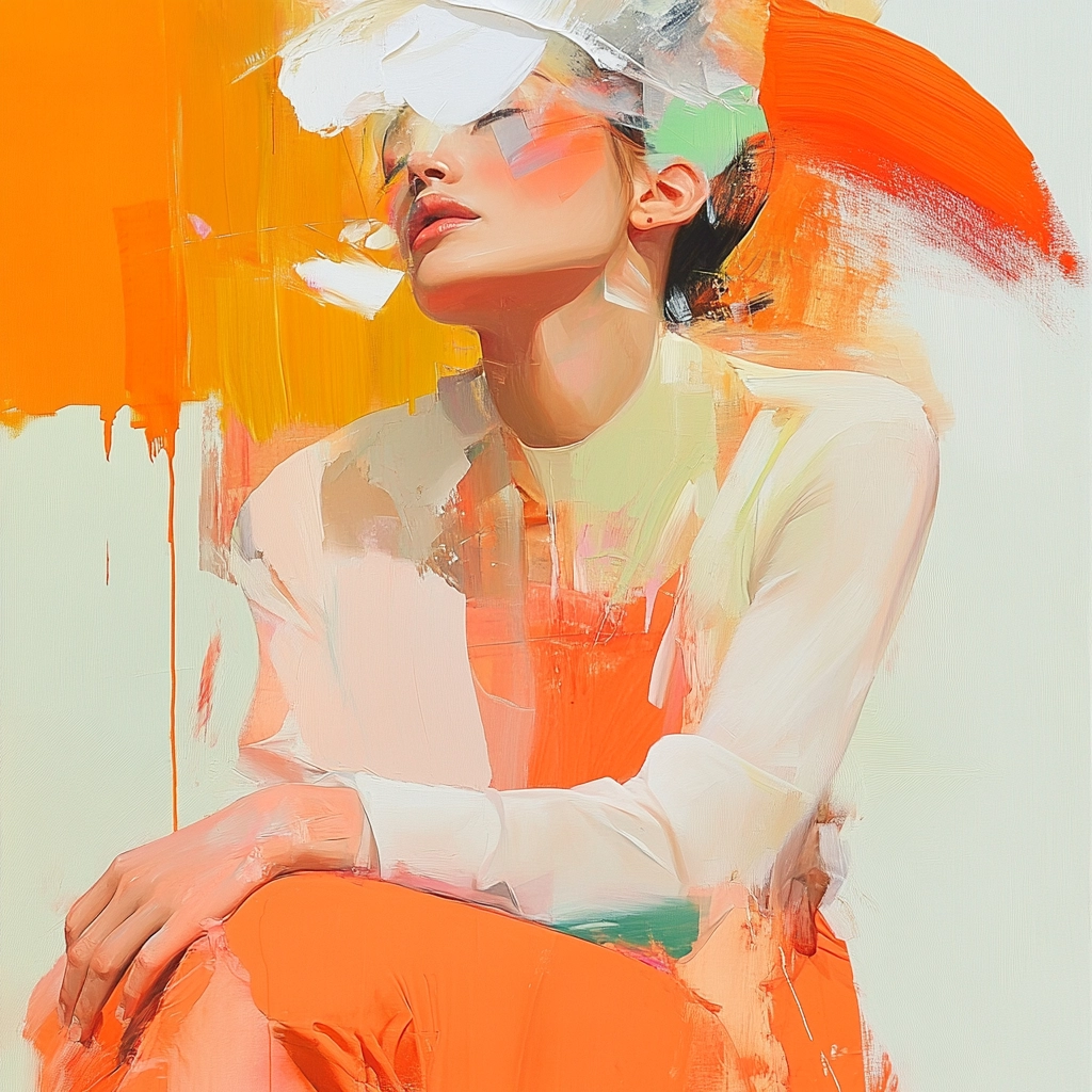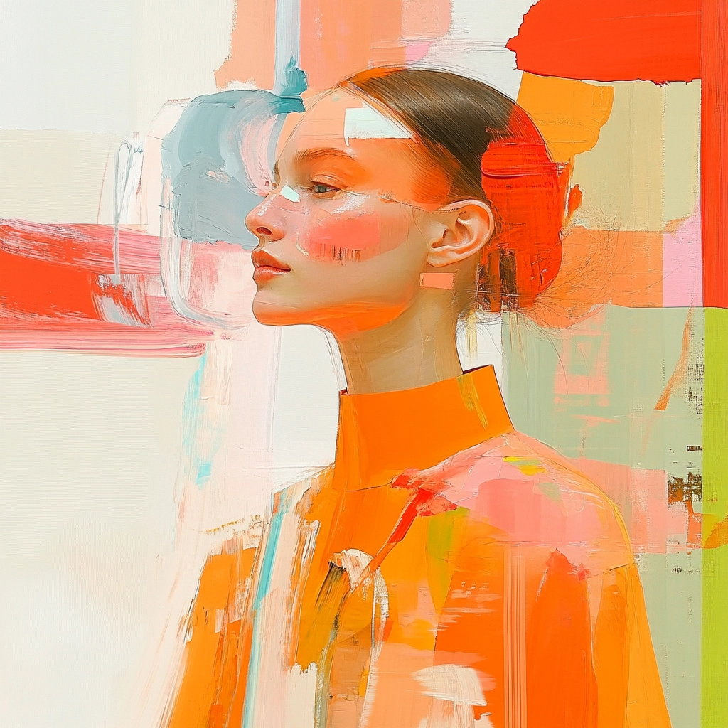 The lighting highlights bright oranges, creating energetic contrasts against lighter background shades. Brushstrokes offer rich textures that emphasize depth, while spatial arrangements introduce movement and strong visual interest.