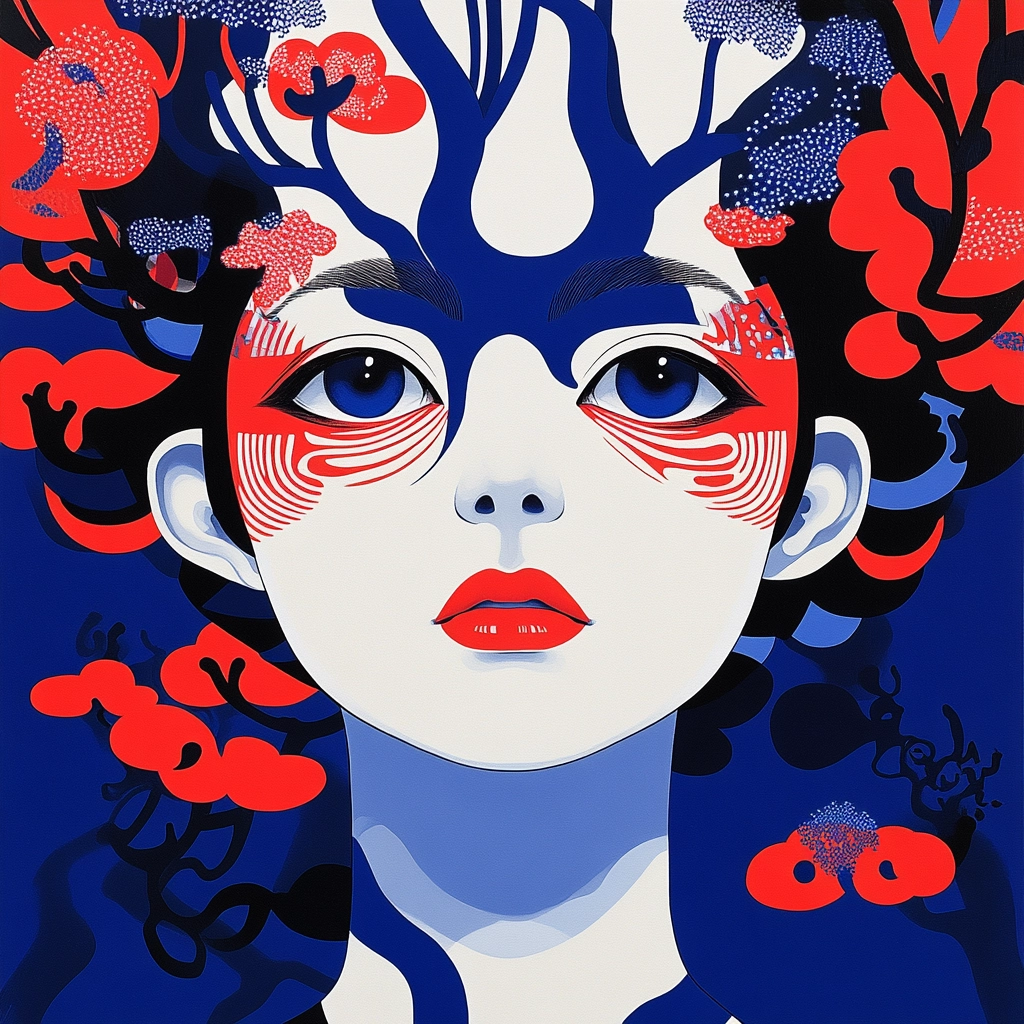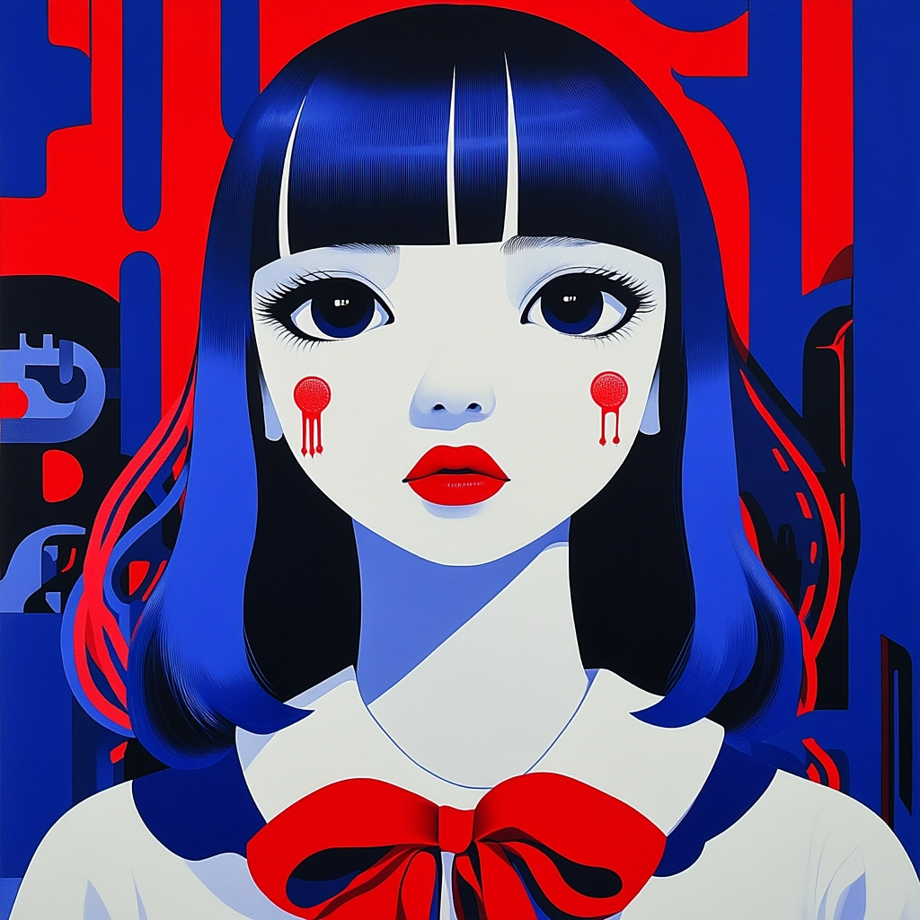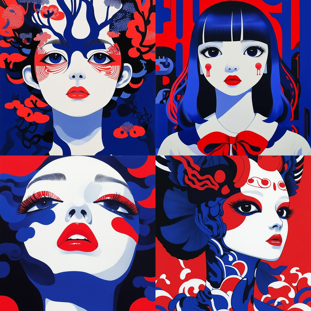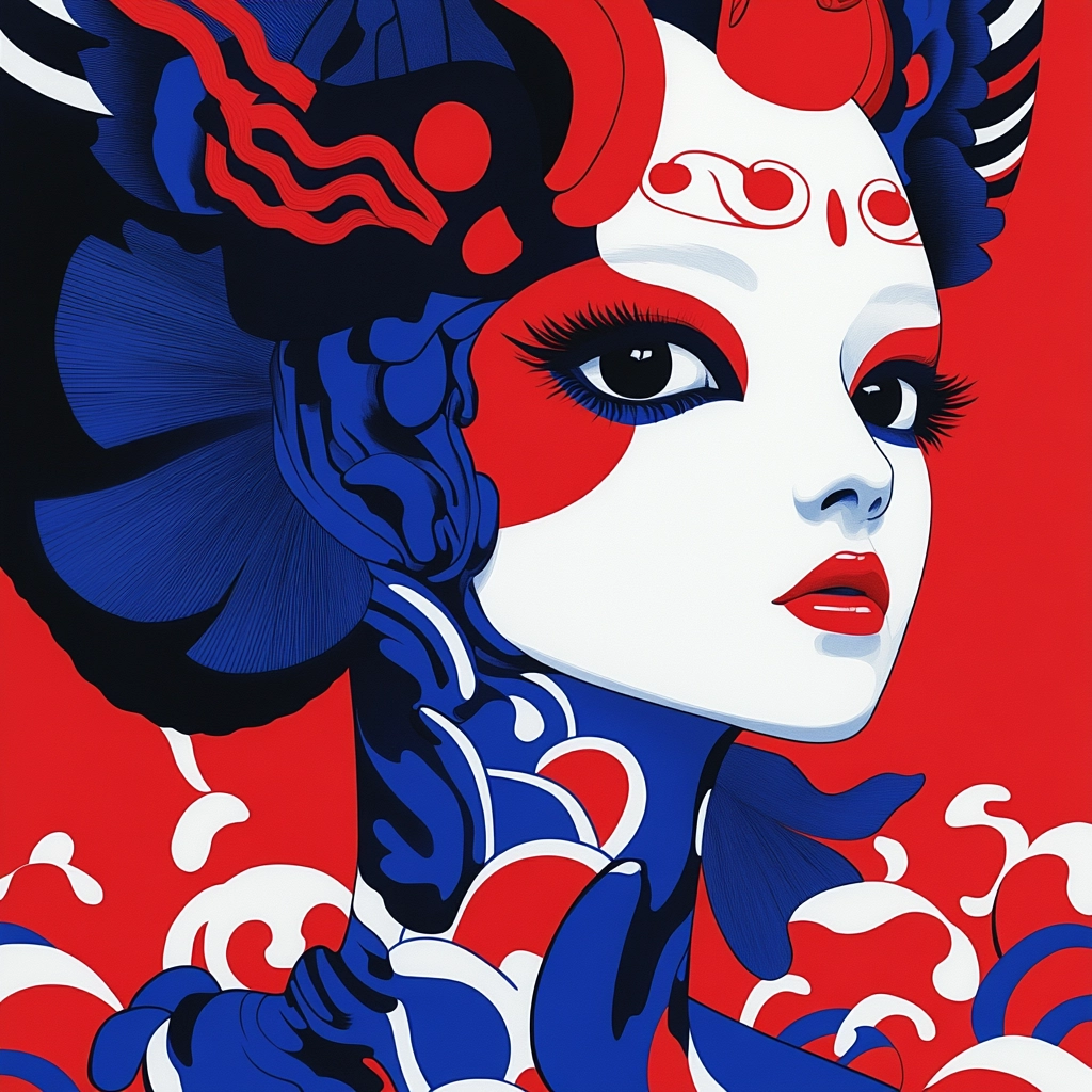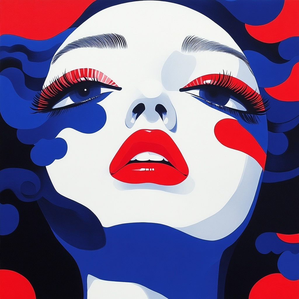 The lighting is flat, enhancing the stark contrast between bold red and rich blue, with sharp outlines creating a defined space and a smooth texture that emphasizes clarity and form in the composition.