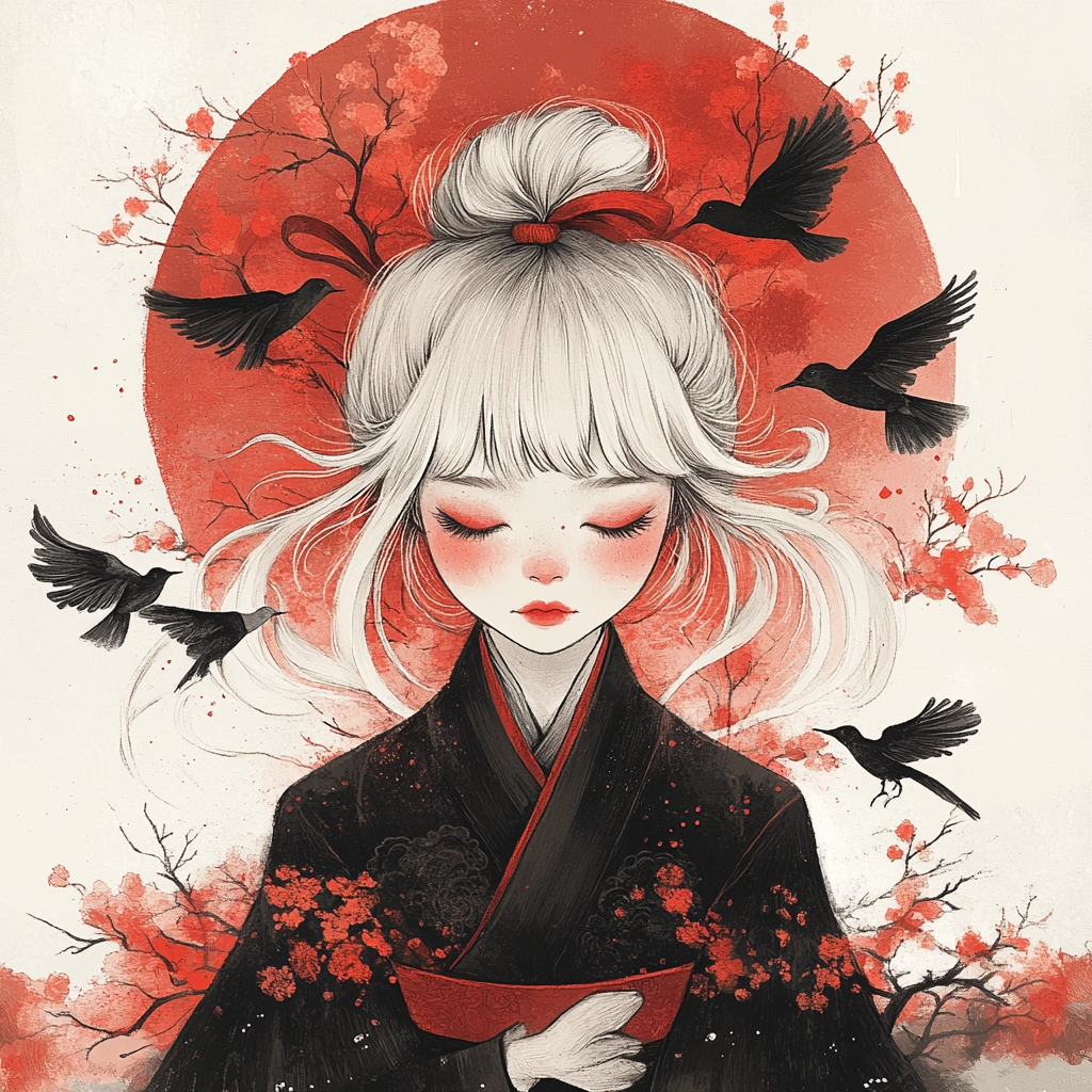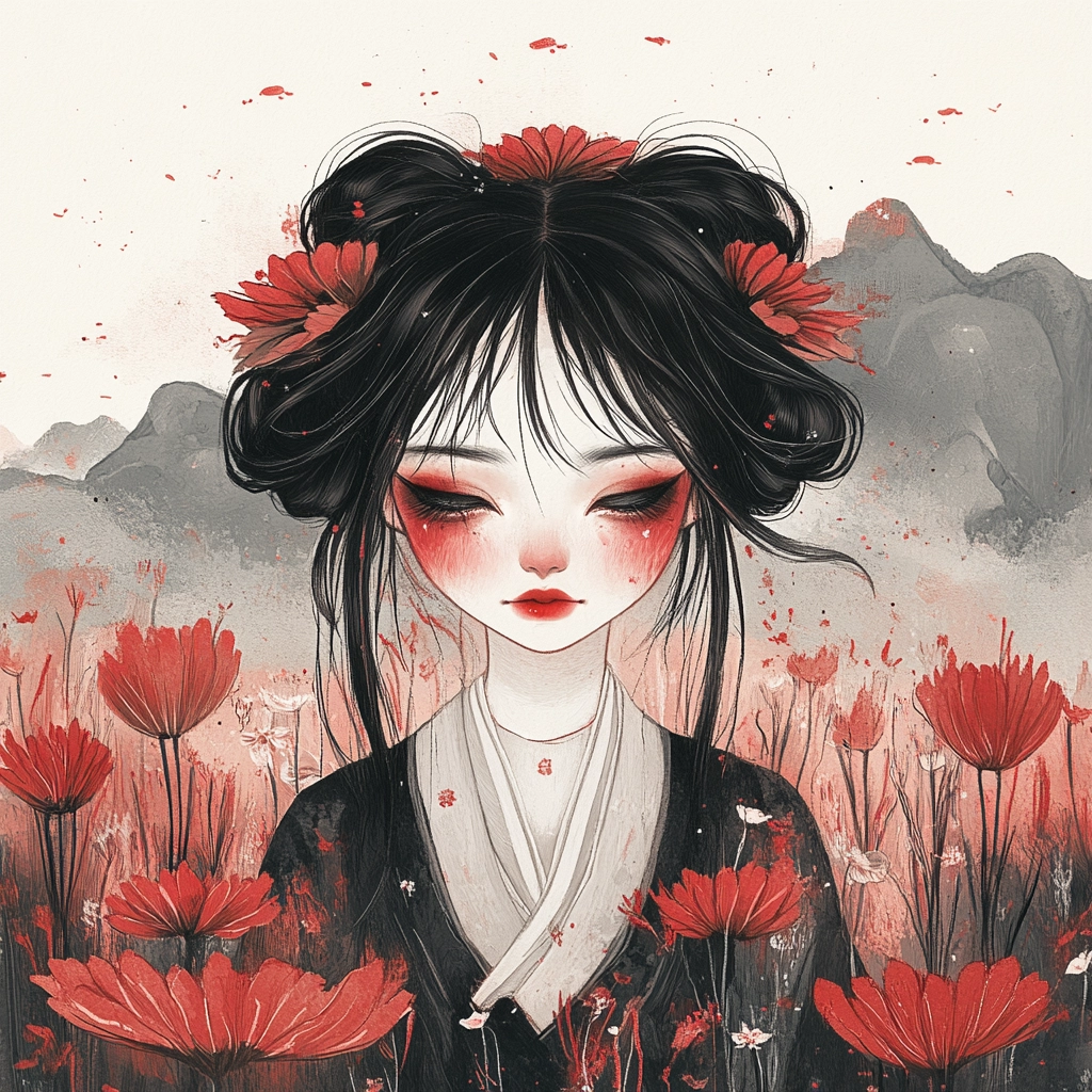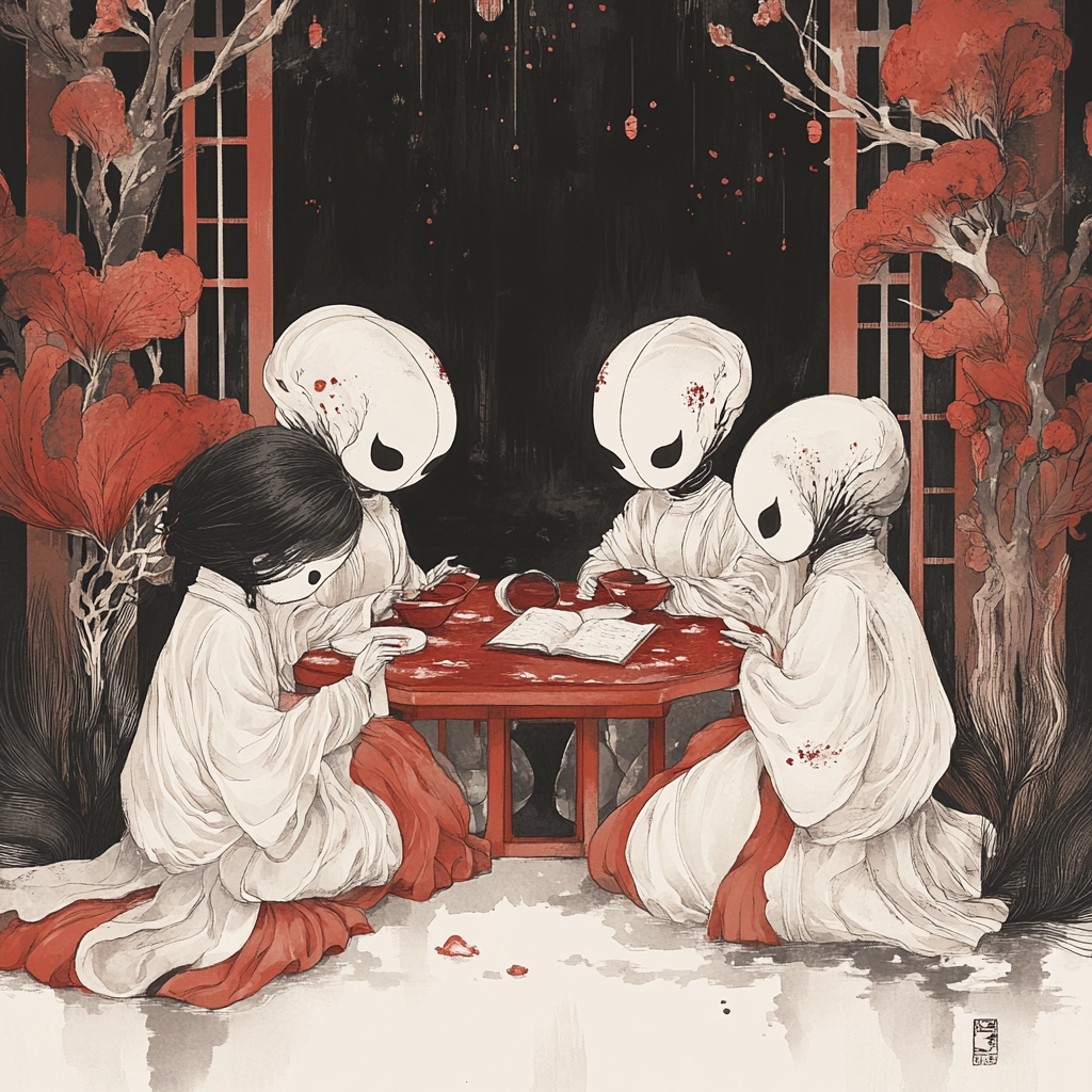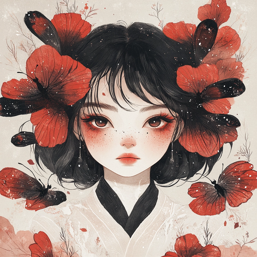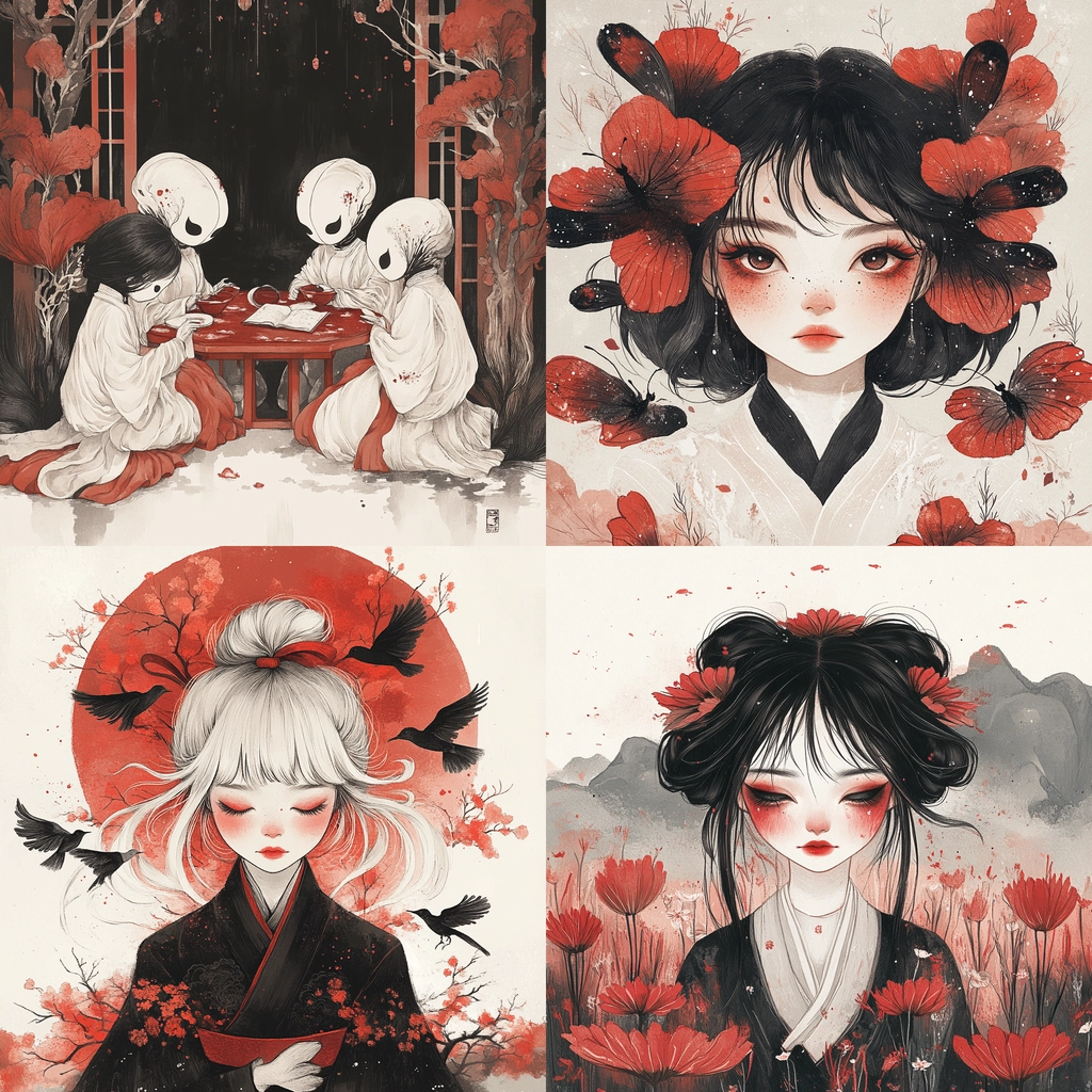 The lighting has a flat effect, emphasizing the sharp and defined linework. Strong contrast between red and black colors is used to create depth and focus. The spatial arrangement appears flat, yet the intricate line details and textured elements provide a sense of delicacy and movement.