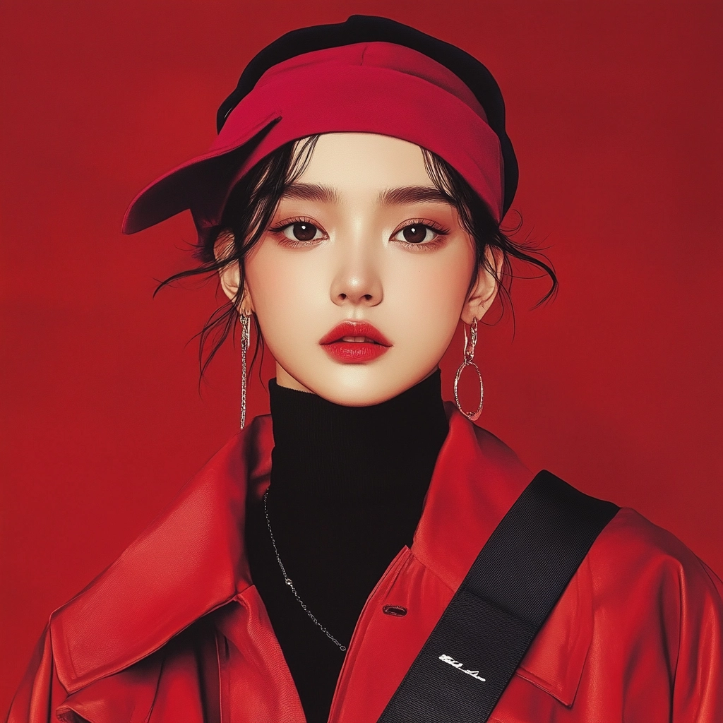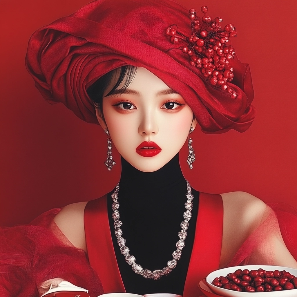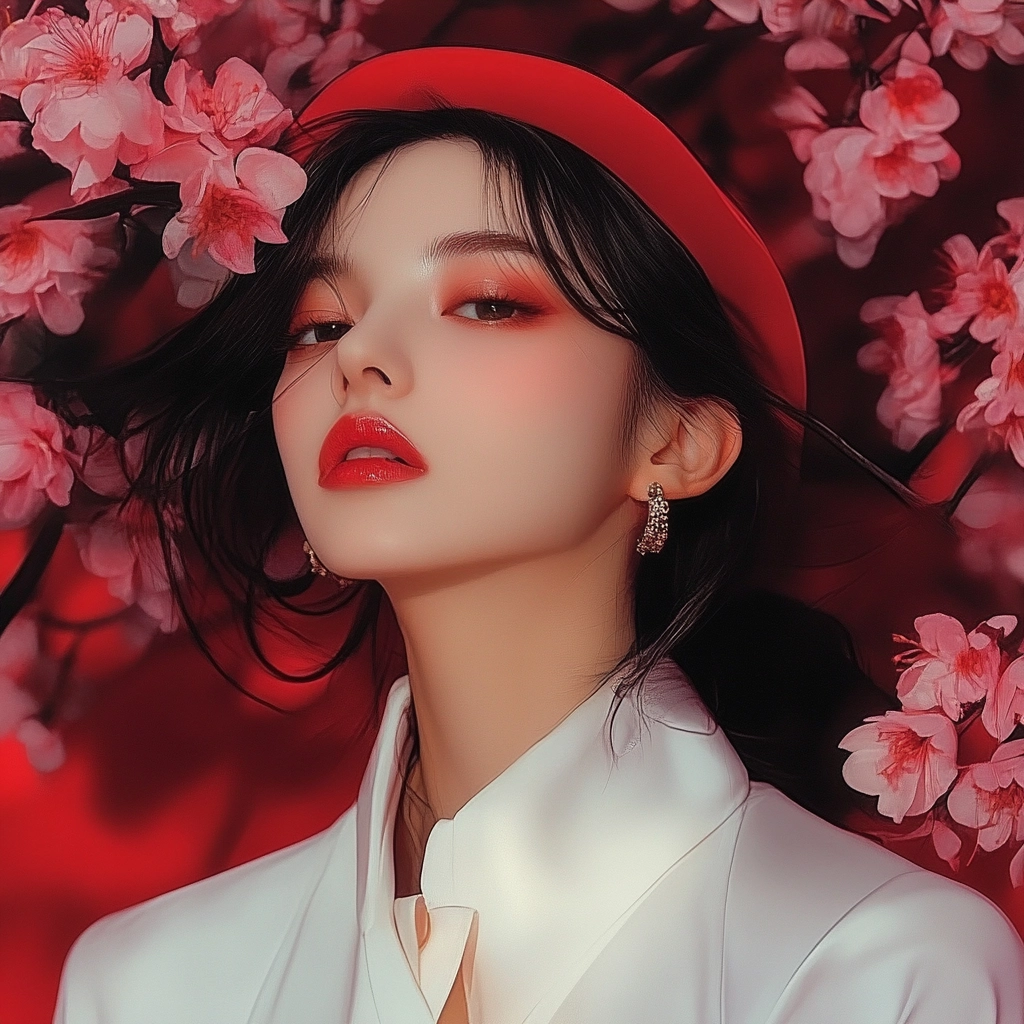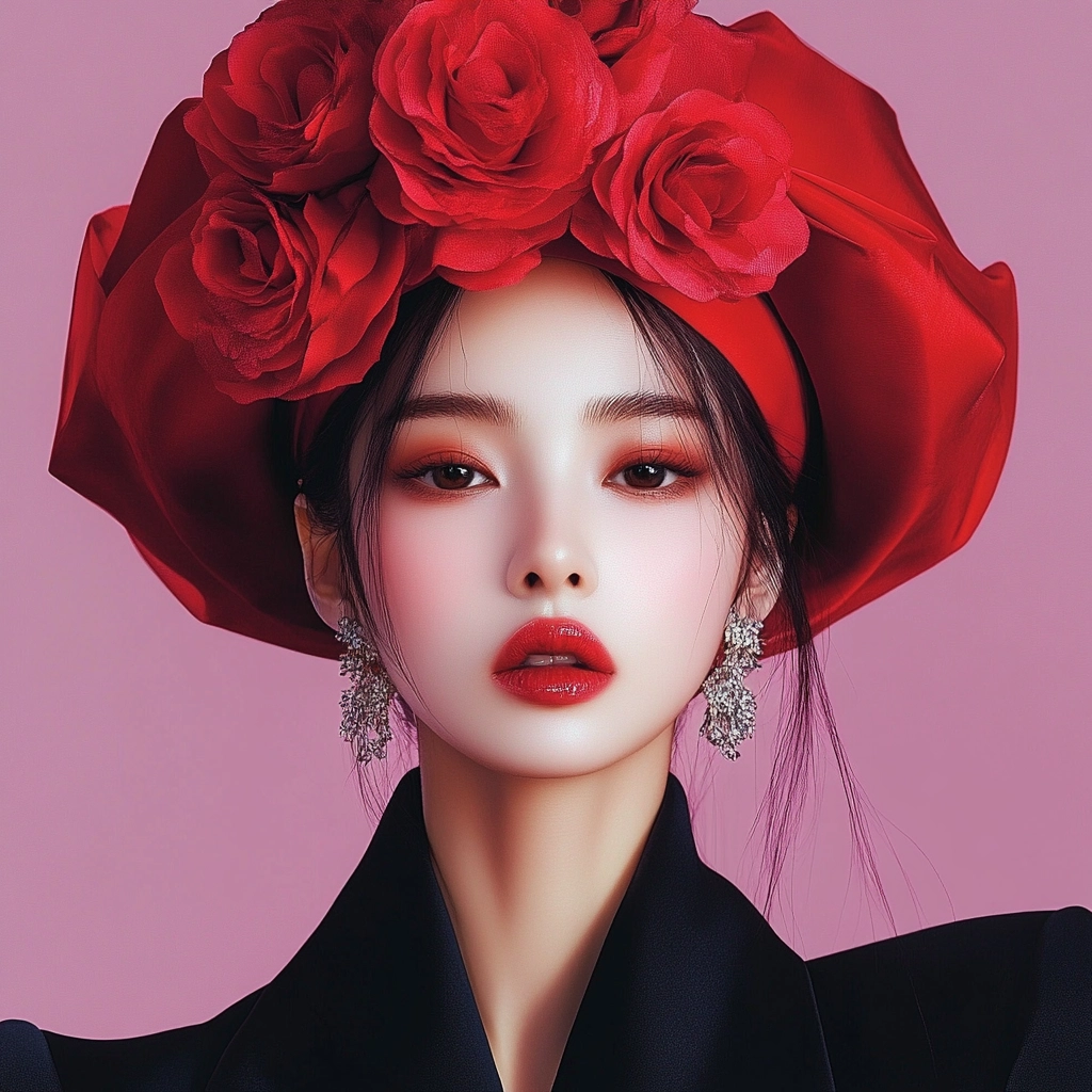 The use of bold reds and pinks highlights intricate textures, with floral elements adding depth and dimension. Lighting creates a smooth, refined appearance, contrasting the dark attire against vivid backgrounds. The spatial arrangement emphasizes luxury and elegance through well-defined shapes and contours.