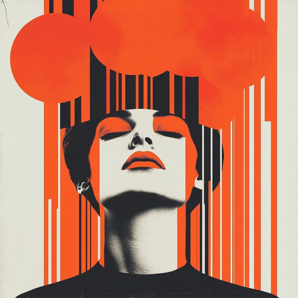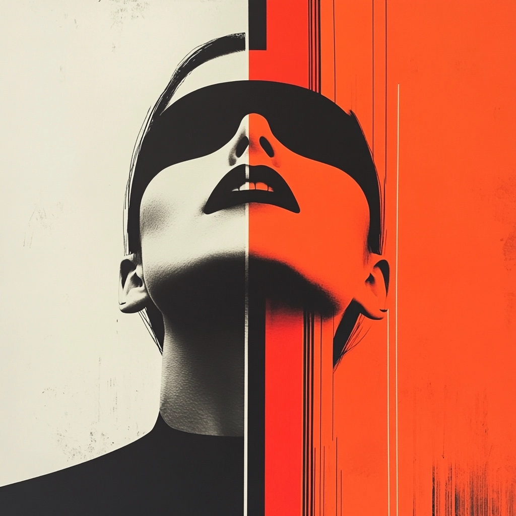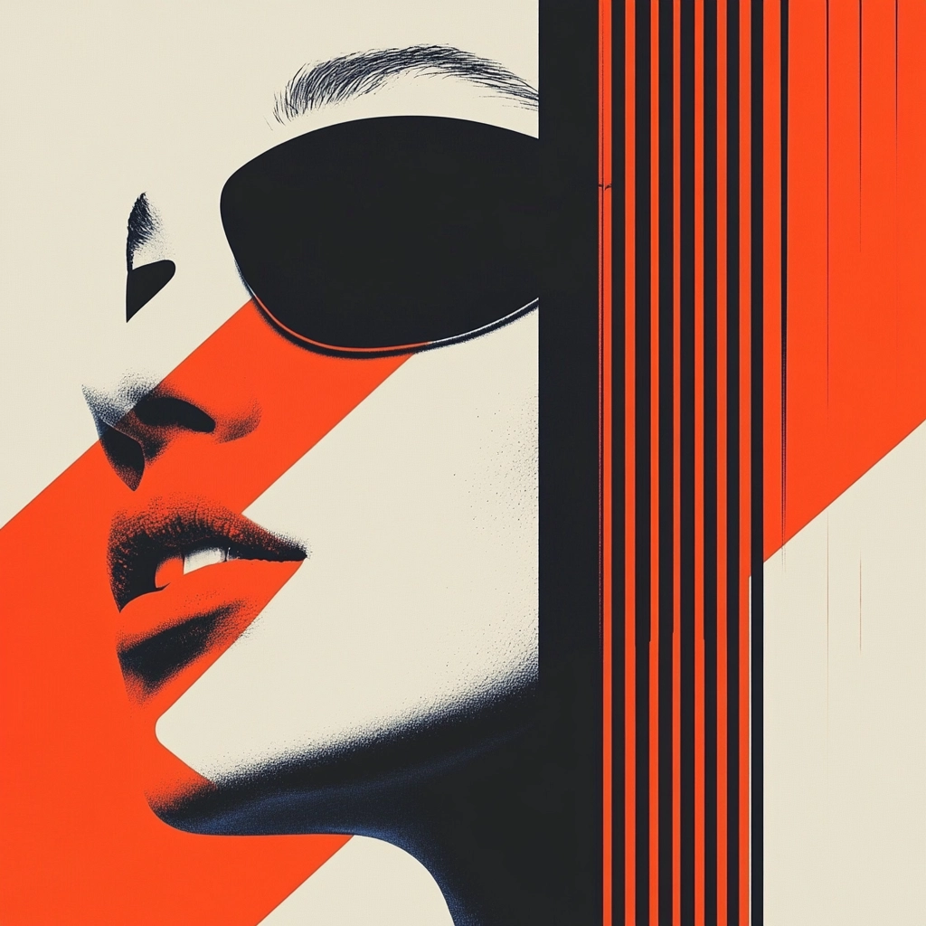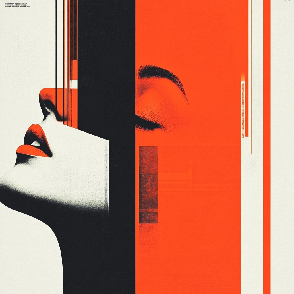 Bold use of red and black set against crisp white, creating a striking geometric composition.