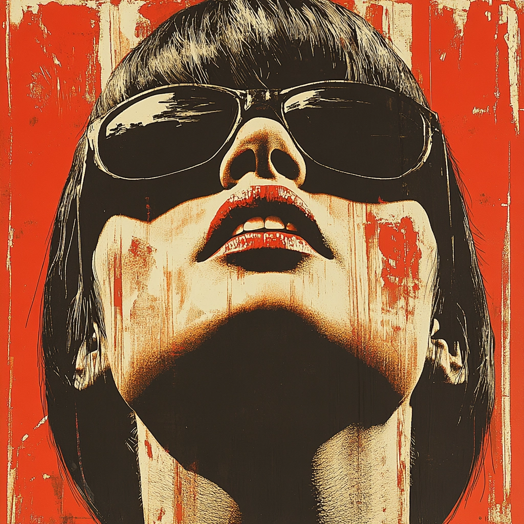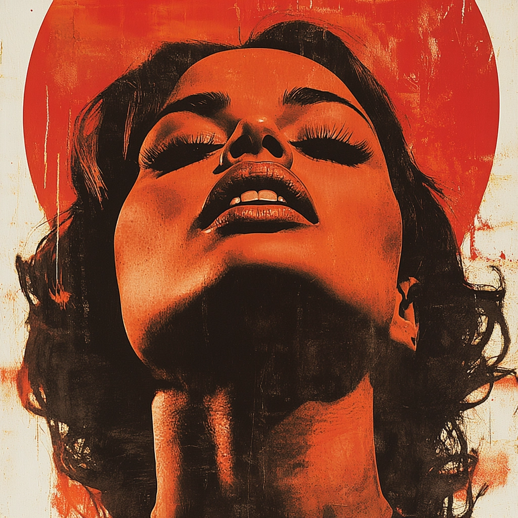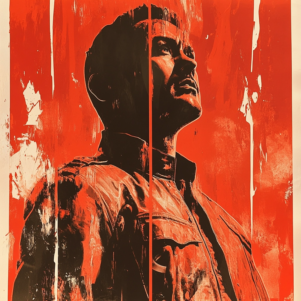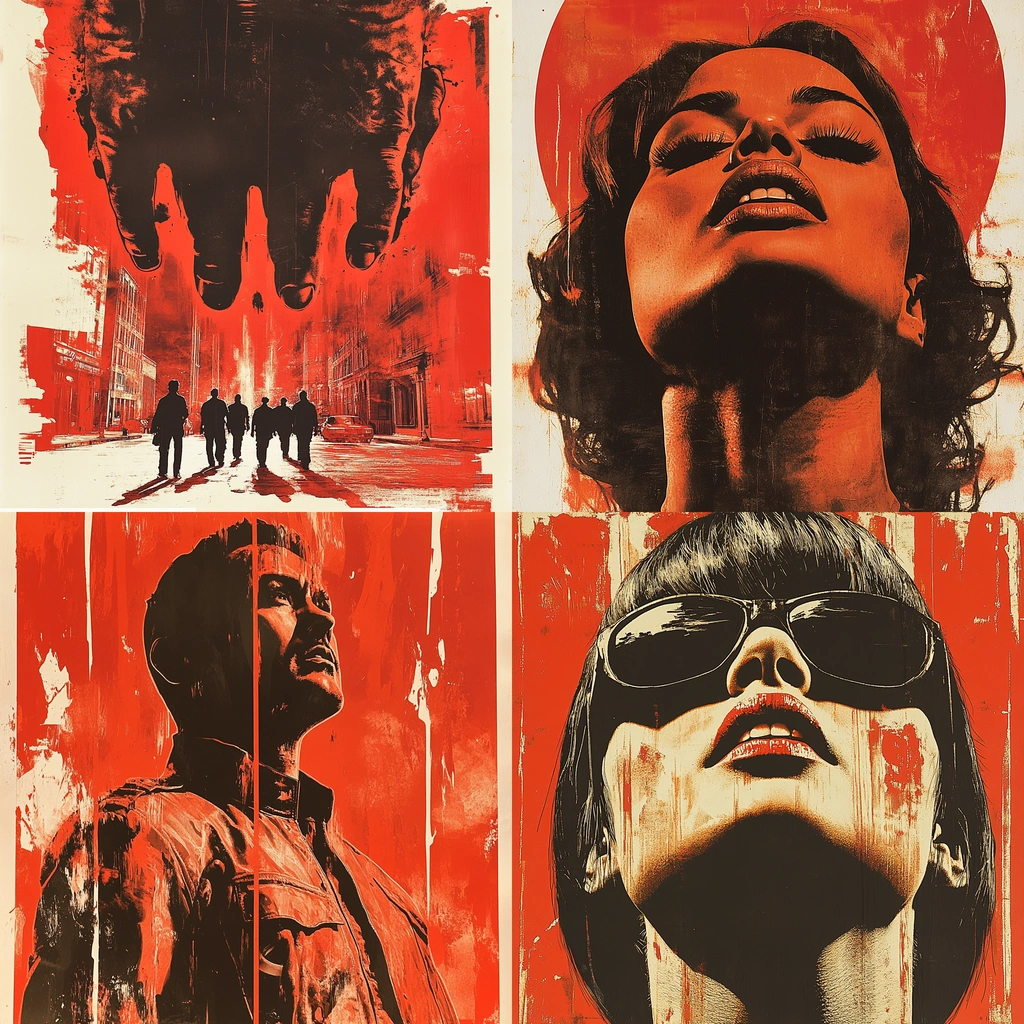 Striking red dominates with contrasting black and white silhouettes, creating powerful and deep visual impact.