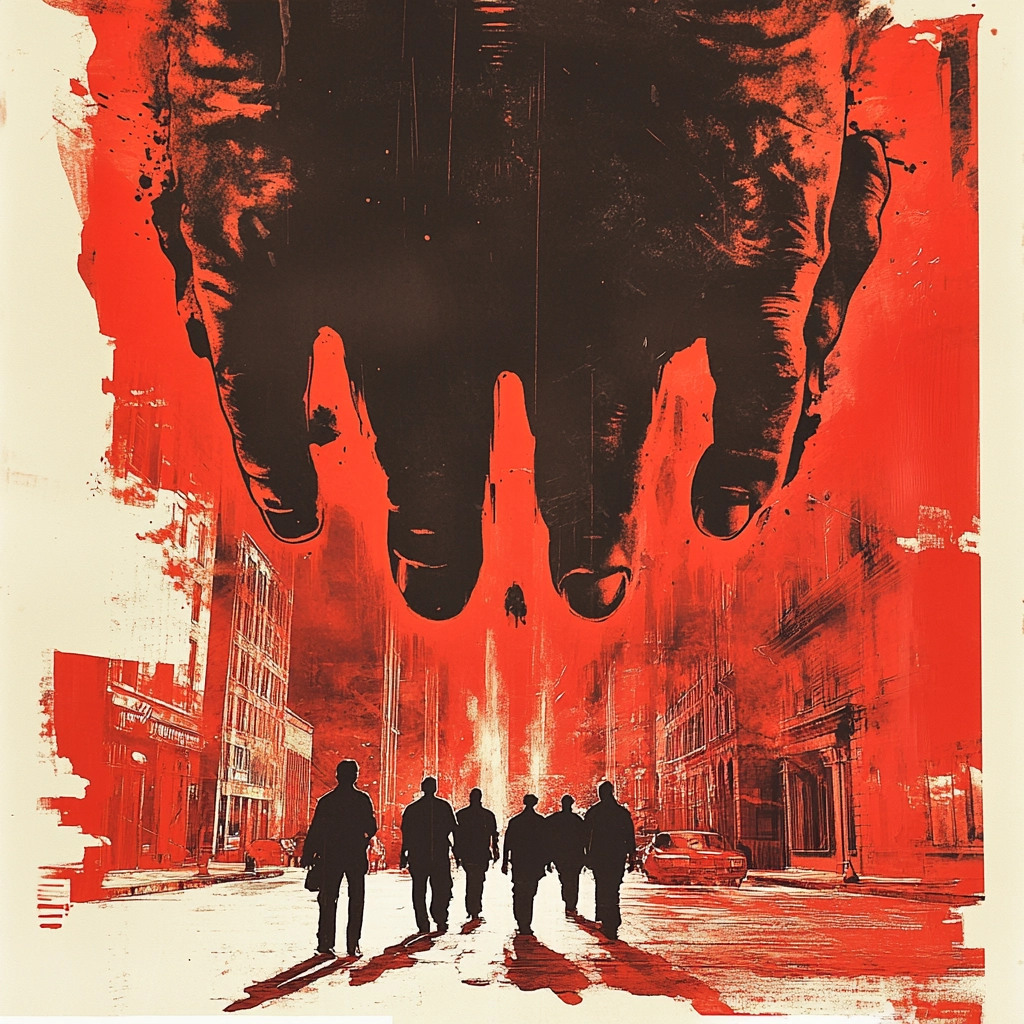 Intense red forms a vivid backdrop, enhancing the drama of the black silhouettes and shadows. The recurring linear details create depth, while the contrast with white spaces emphasizes bold outlines.