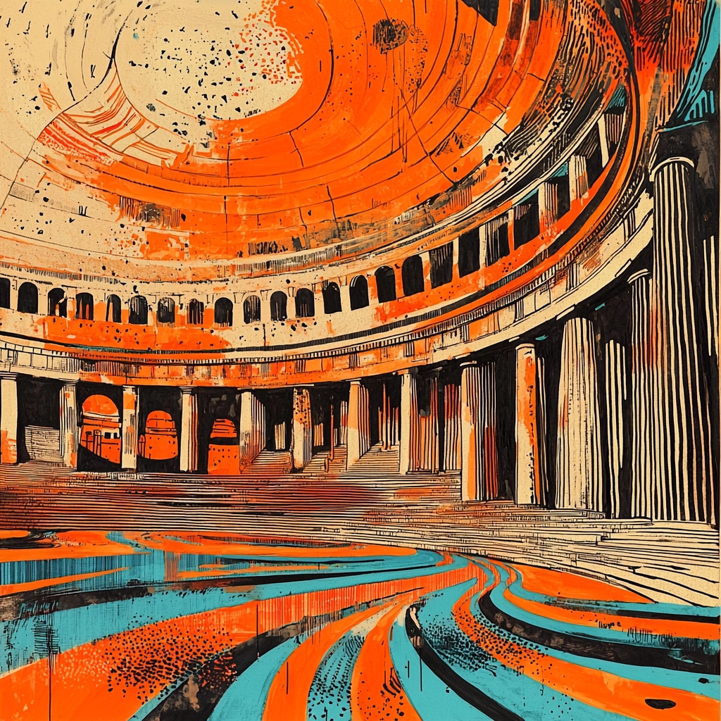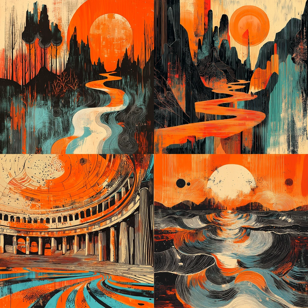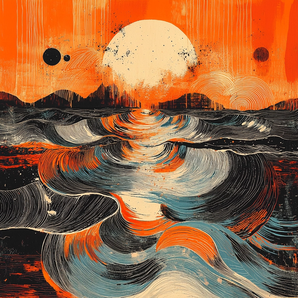 Contrasting lighting effects highlight intricate line textures, creating layers that suggest depth and movement. The color palette features bold oranges and deep blues, countered by stark black shadows, enhancing the graphic quality.