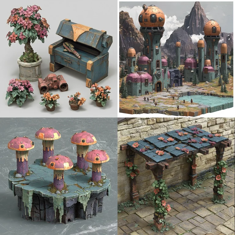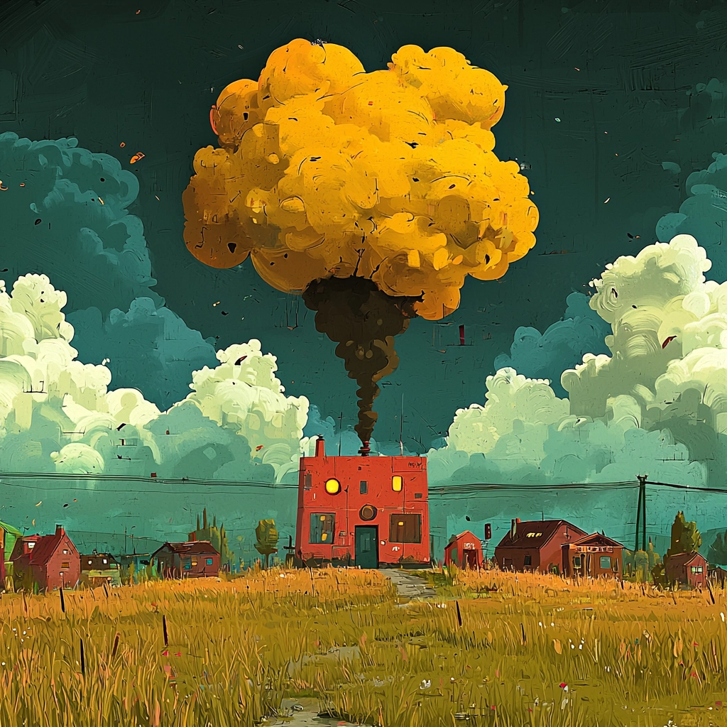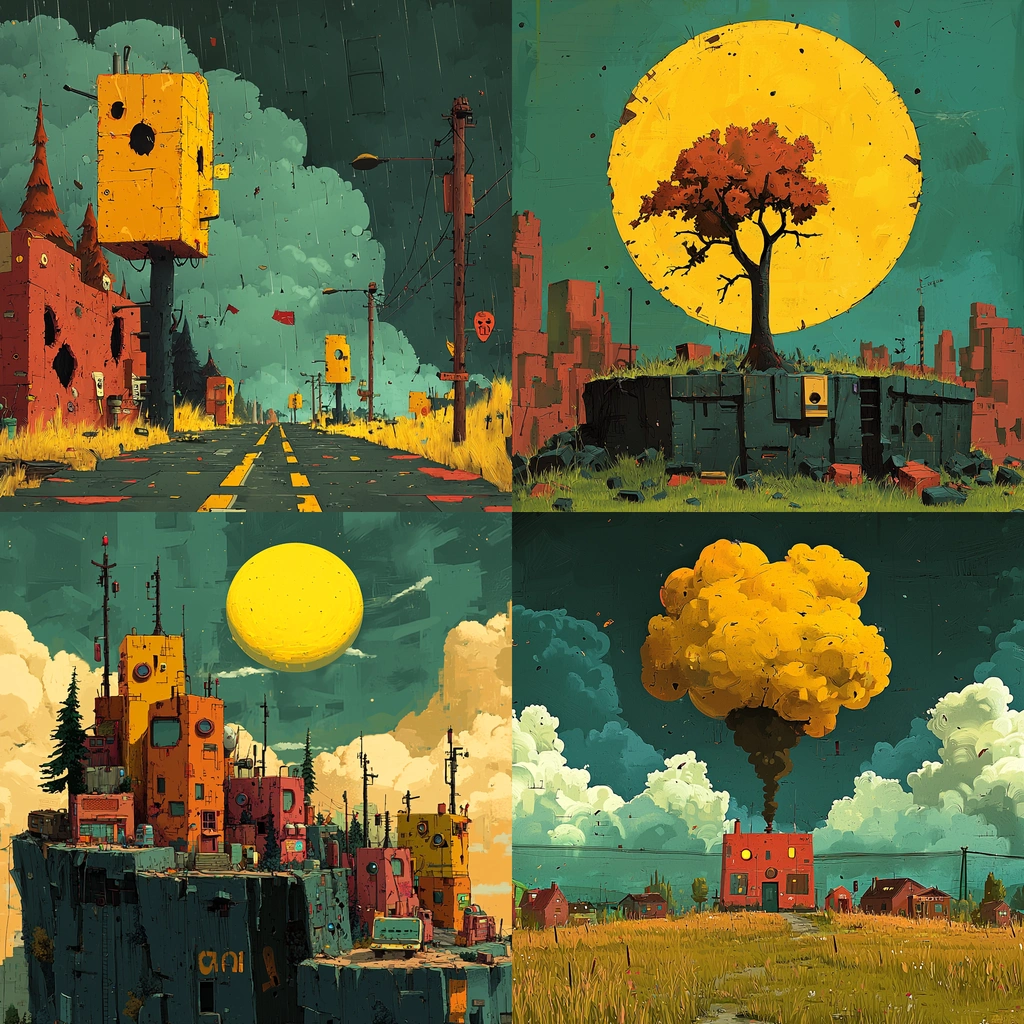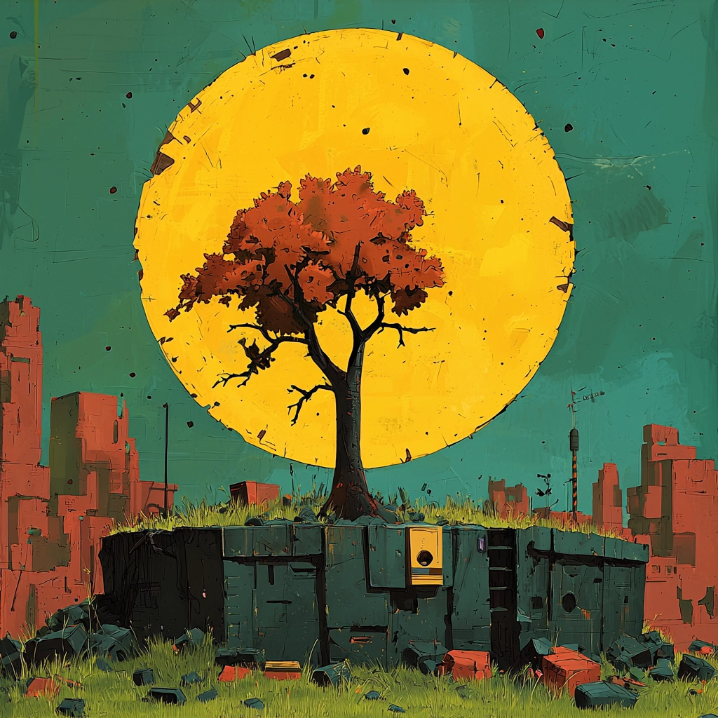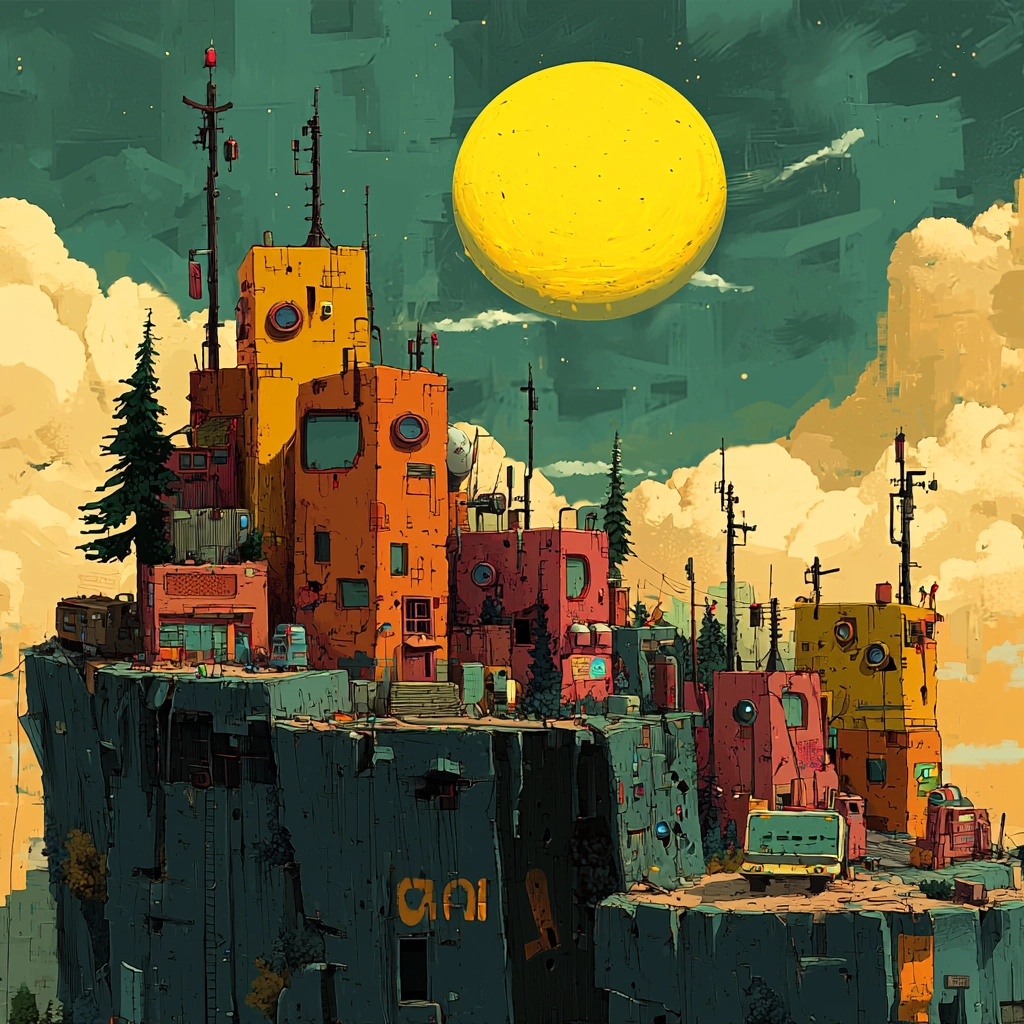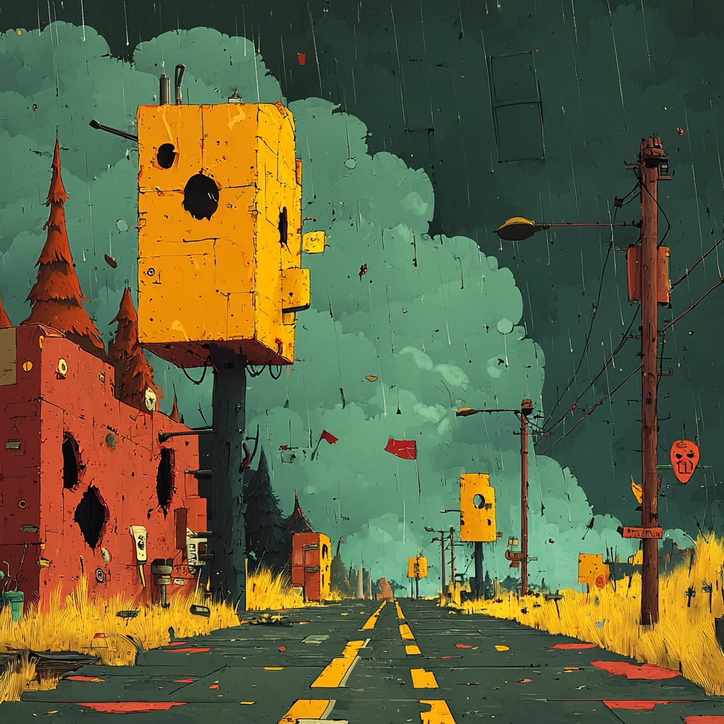Strong color contrasts emphasize the urban setting with rich textures and striking lighting effects that create a dynamic spatial sense, enhancing bold outlines and vibrant composition.