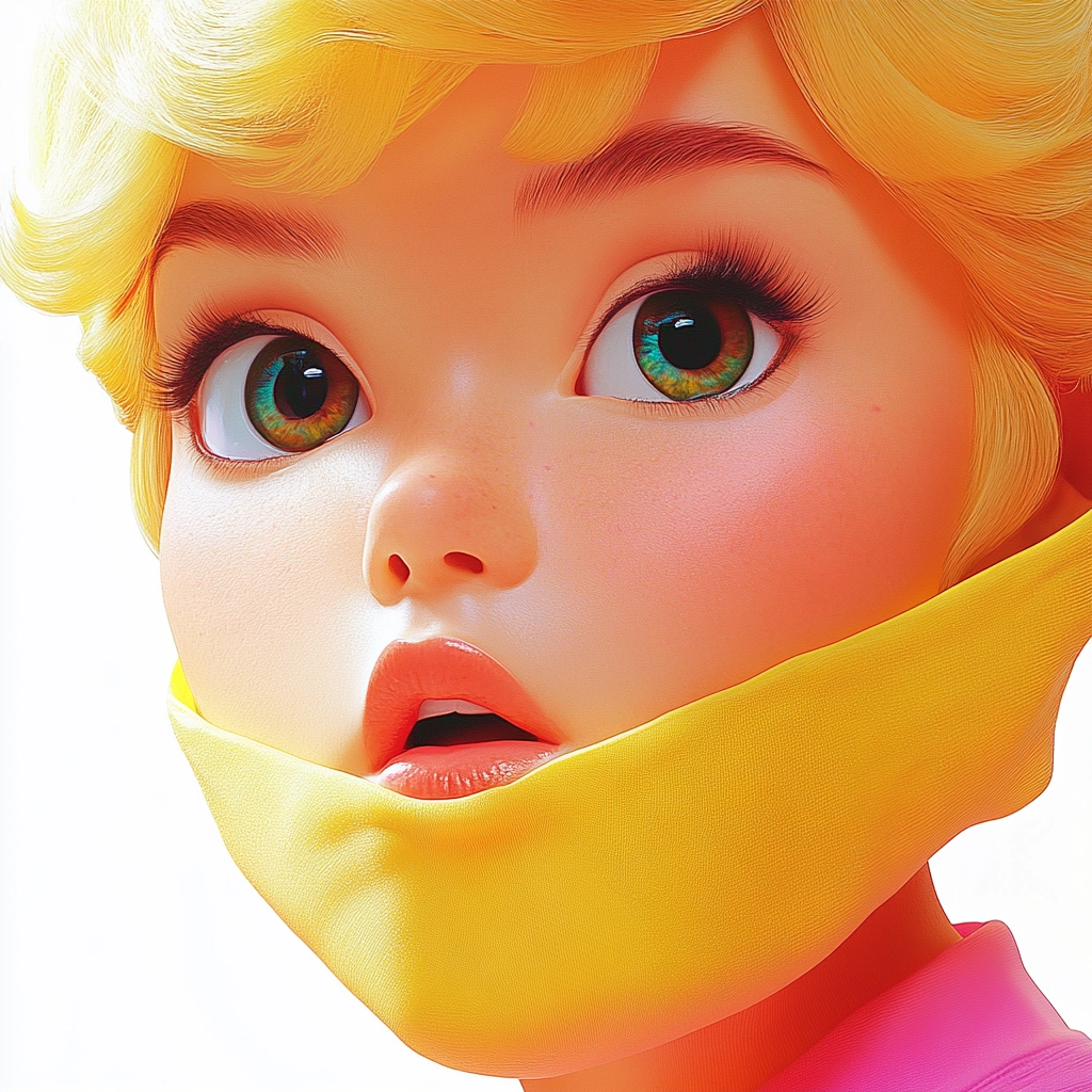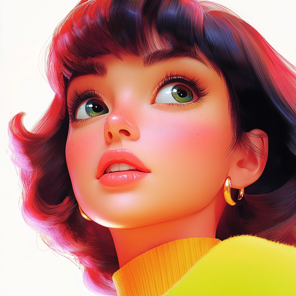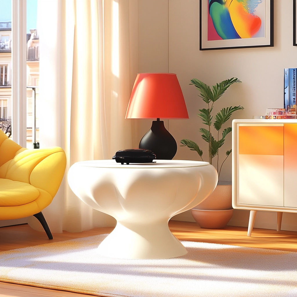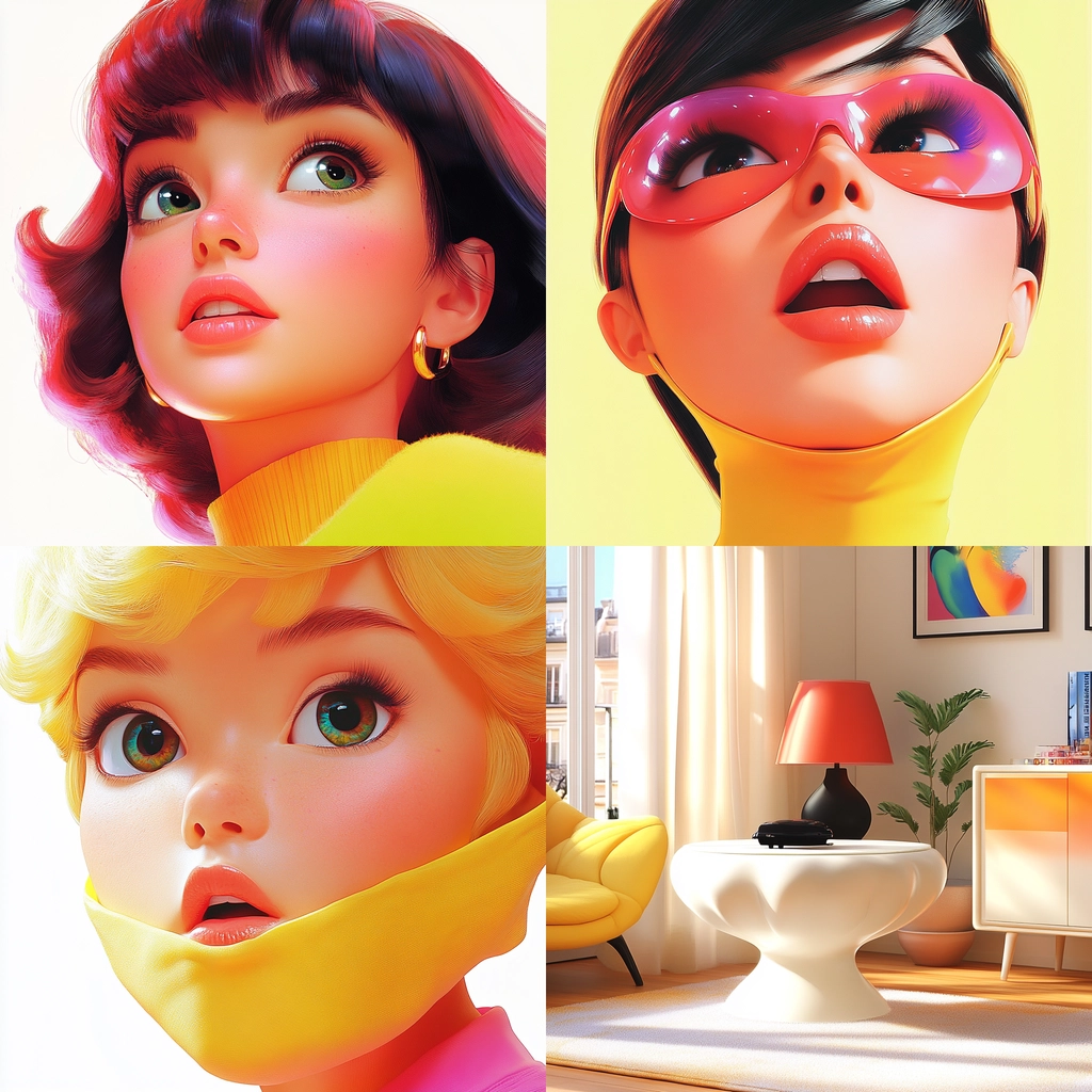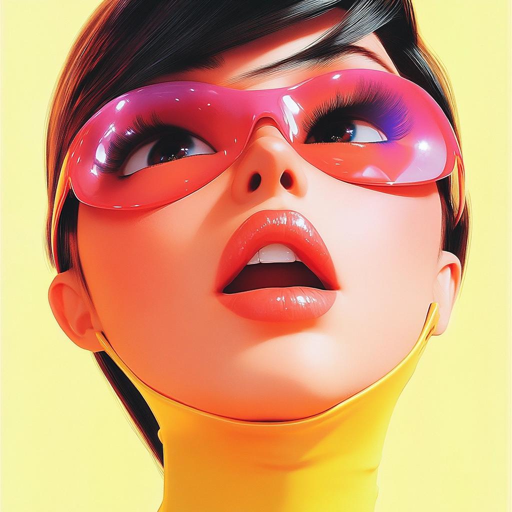 Intense lighting gives an energetic feel, while the vibrant red and yellow hues dominate the composition. The smooth textures and well-defined spatial areas combine to create a bold, lively aesthetic.