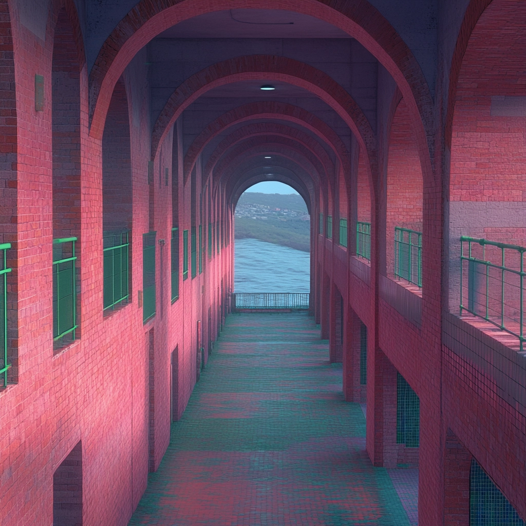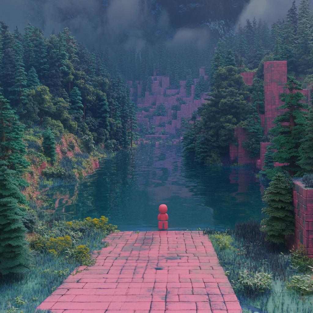 Bricks exhibit a rough texture contrasted by smooth bodies of water and lush greenery, displaying precise lighting that emphasizes depth and clarity. The spatial arrangement is balanced, allowing architecture and nature to coexist in a cohesive visual narrative.