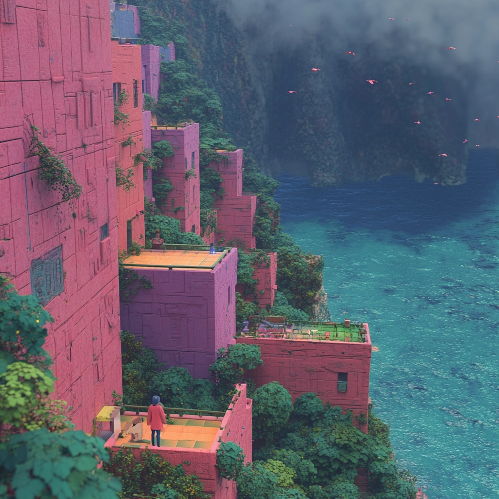 Vivid color contrasts with architectural and natural elements blended harmoniously.