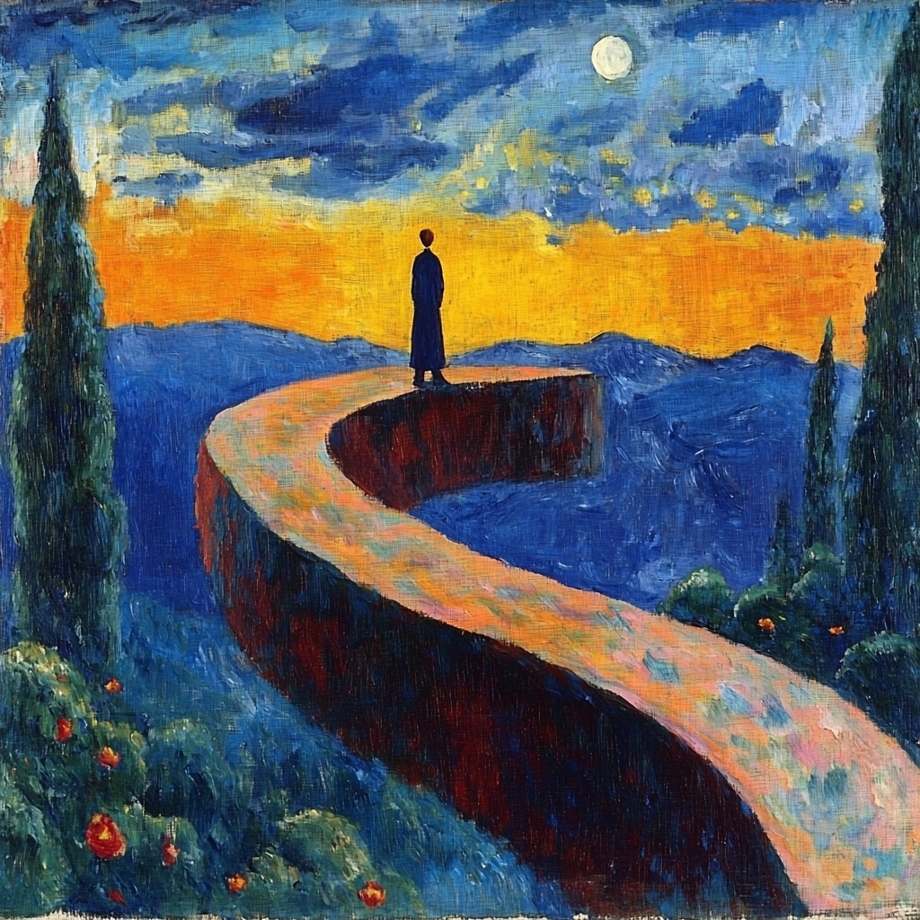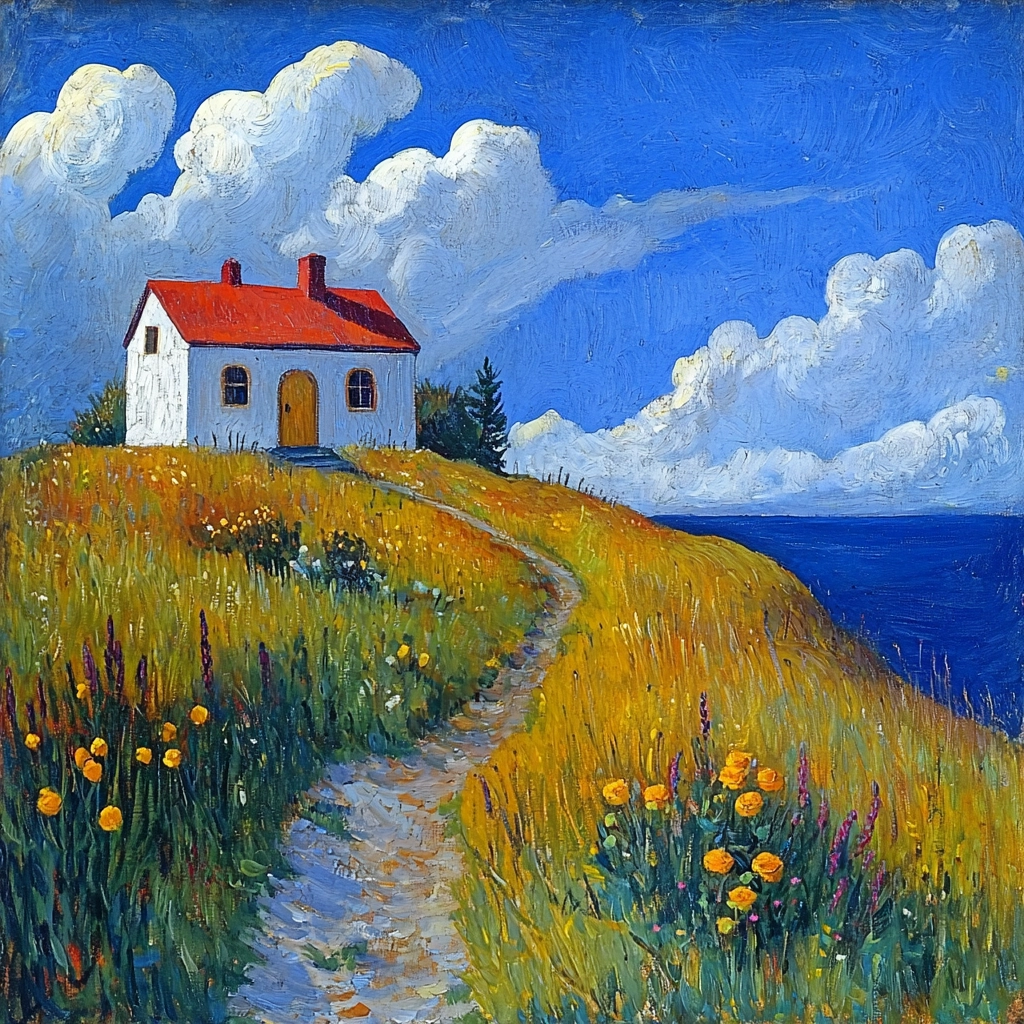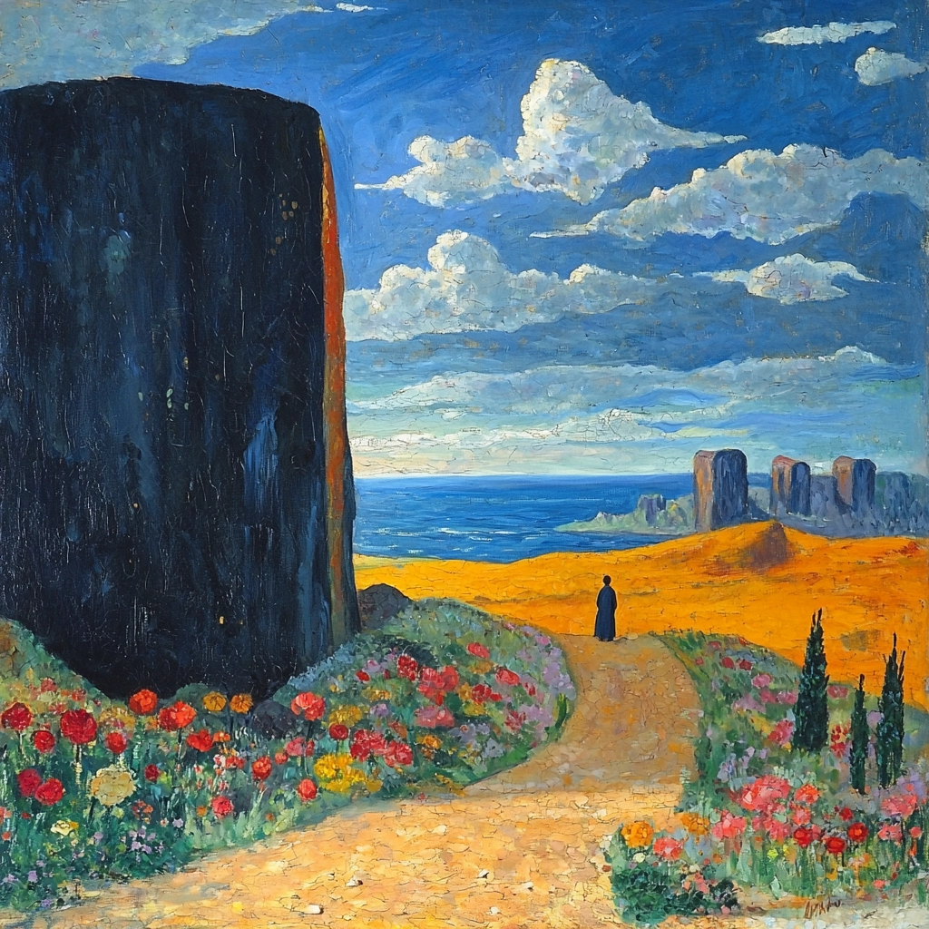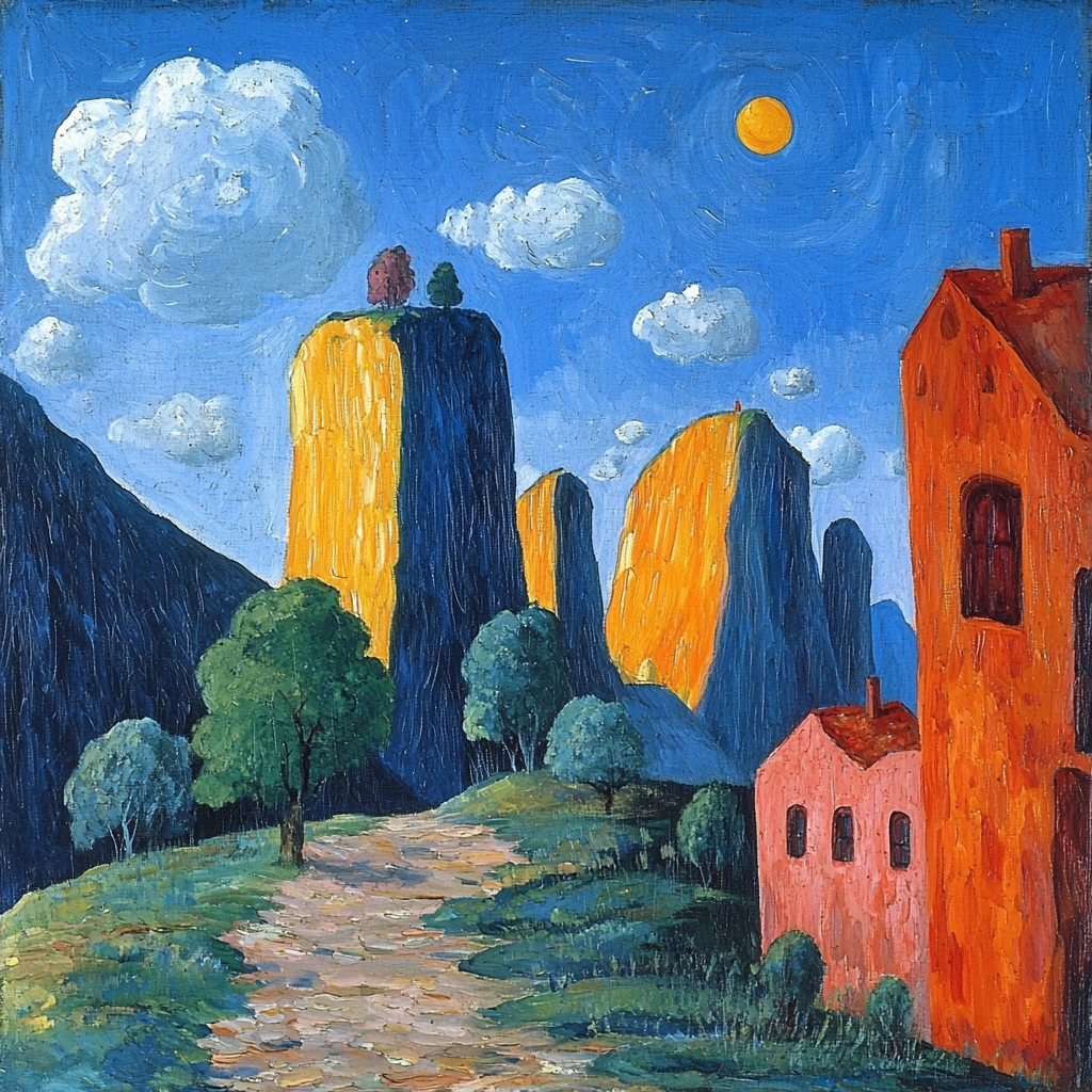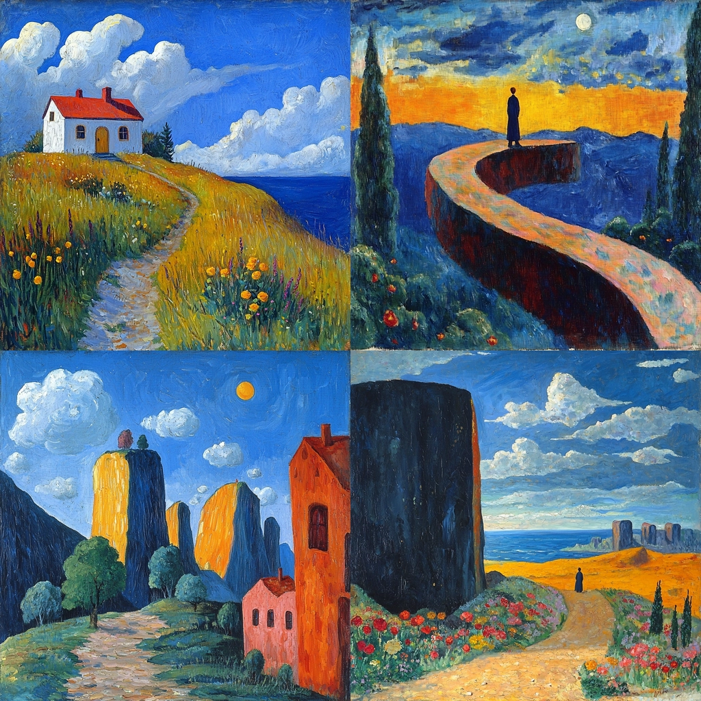 Strong lighting effects emphasize colors; yellow and blue create vibrant landscapes, while red accents add warmth. Texture is rendered through visible brushstrokes, enhancing the dynamic feel. Effective spatial use and composition guide the viewer's eye through each scene.