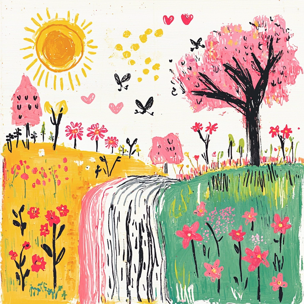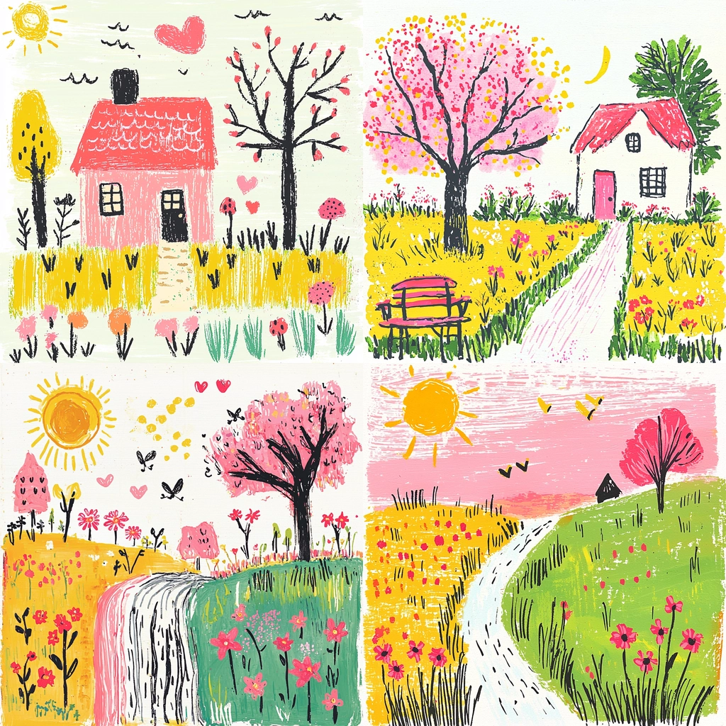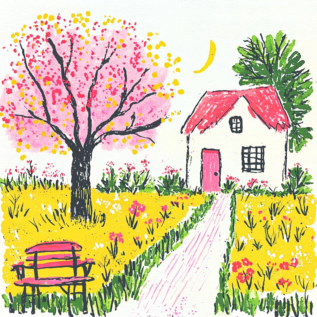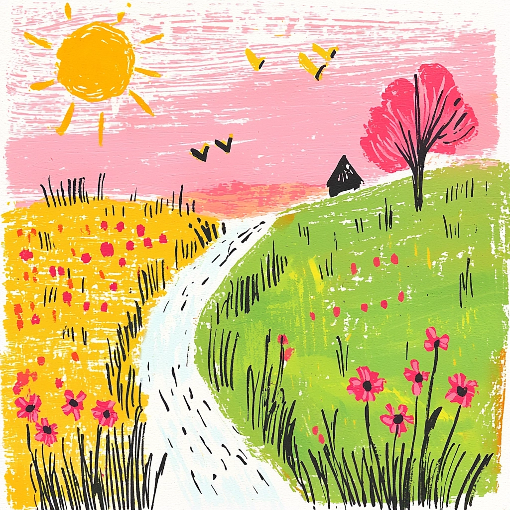 The lighting effects create radiant highlights, emphasizing the pastel hues. The color characteristics incorporate warm tones with dynamic contrasts between pink and yellow, enhancing the vibrancy. Texture is expressed through lively brush strokes creating a sense of movement.