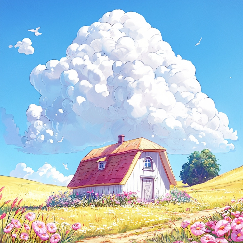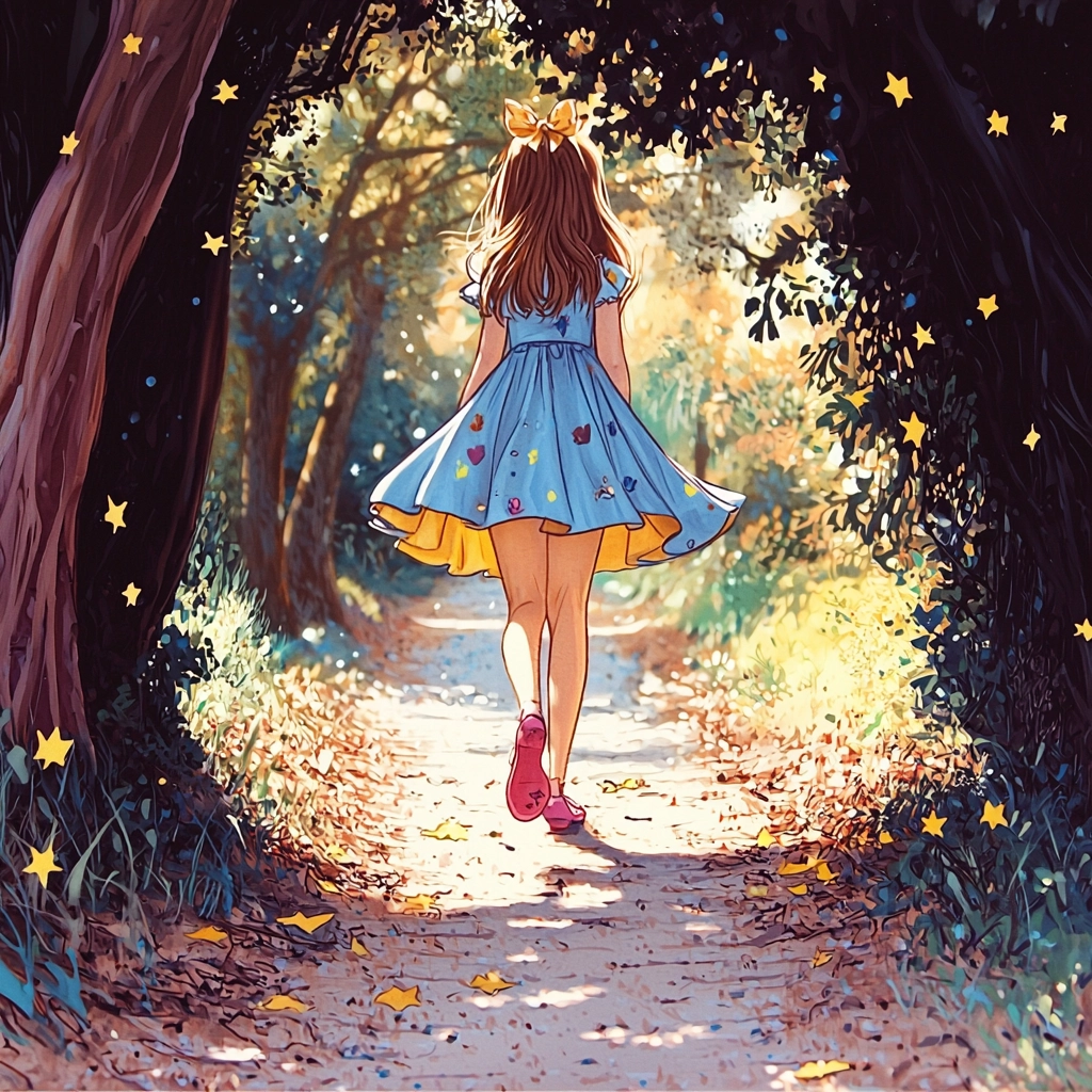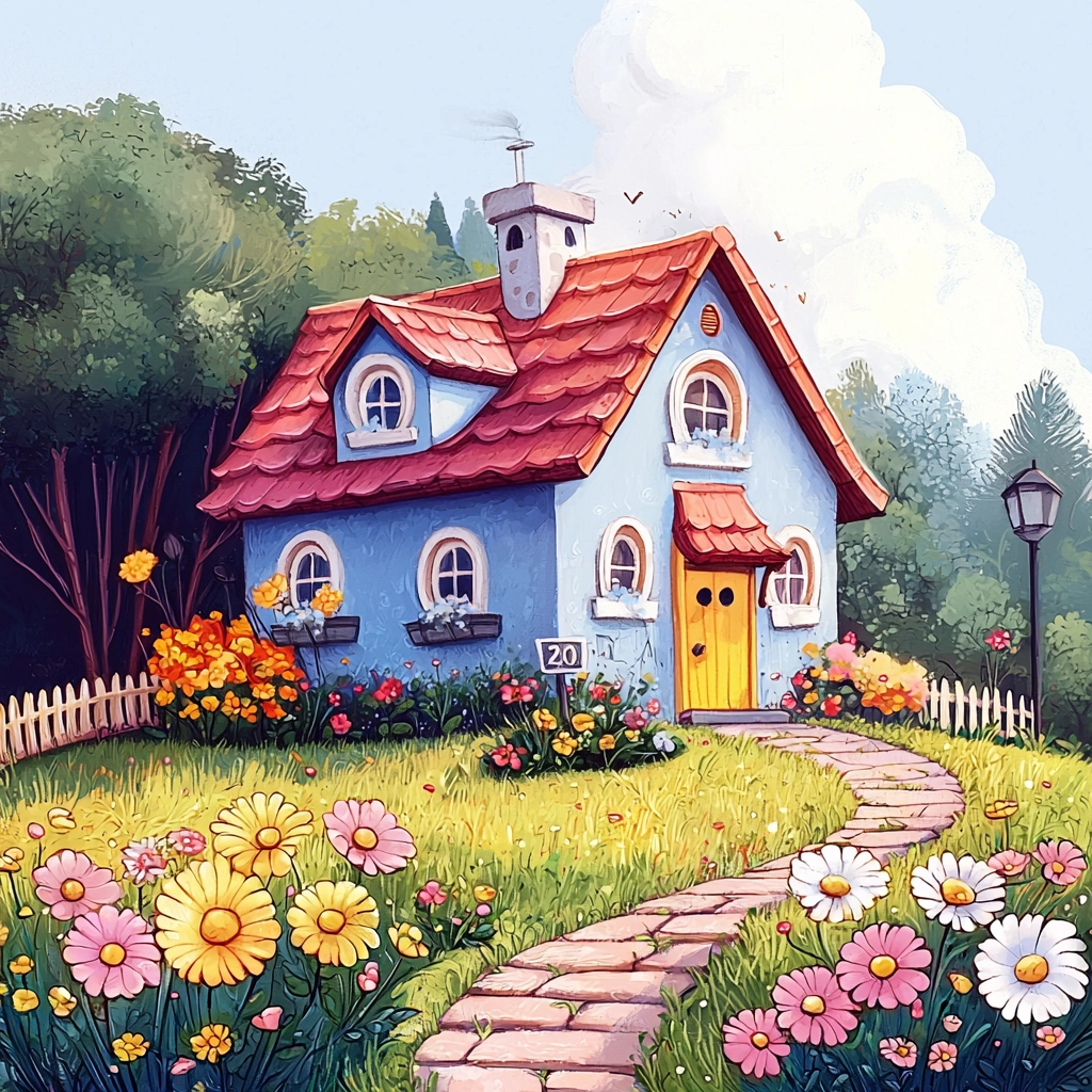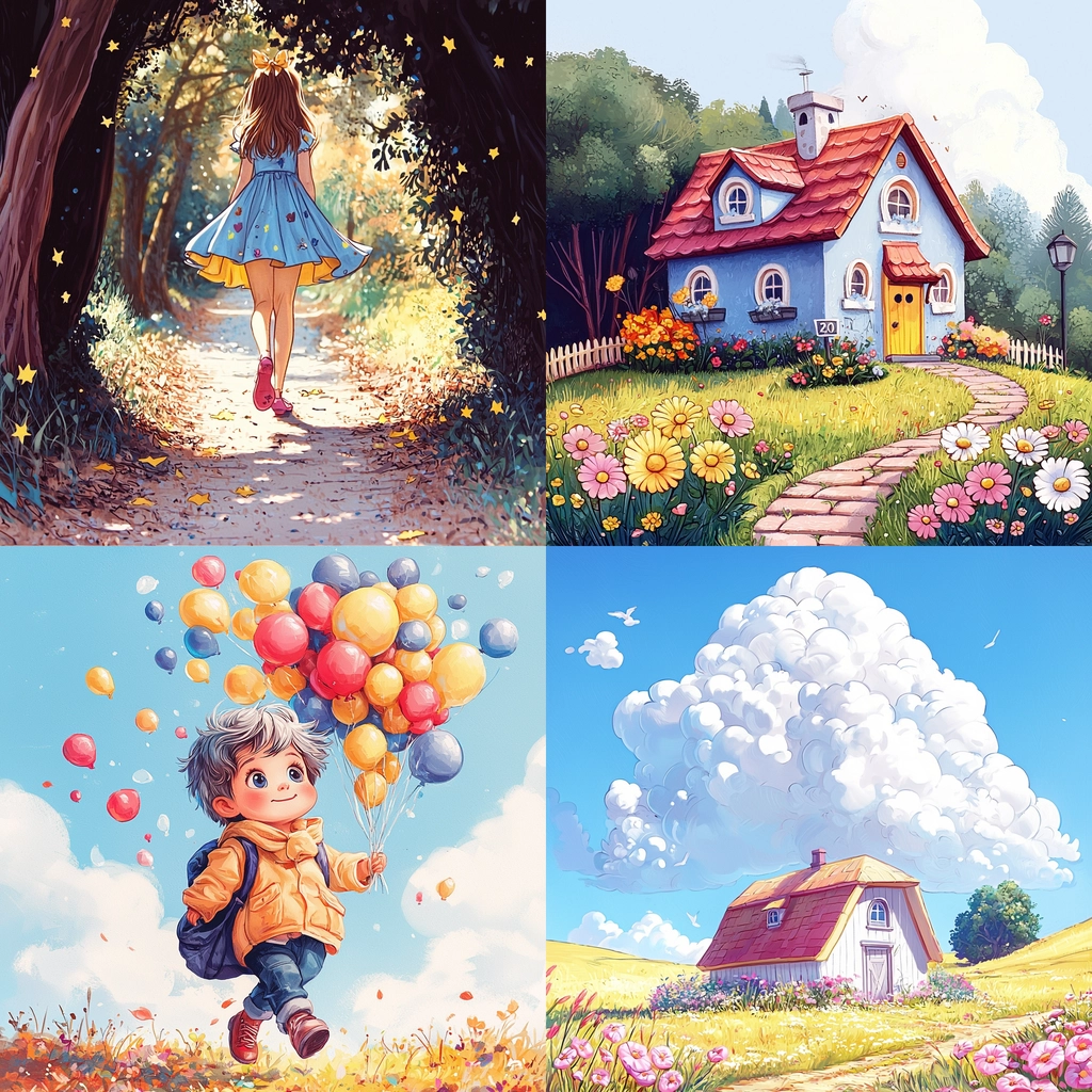 The environment is brightly lit, enhancing vibrant colors with a cheerful palette. Soft textures prevail, creating a smooth, comforting visual experience. Spatial depth is implied through layering, guiding the eye across each scene seamlessly.