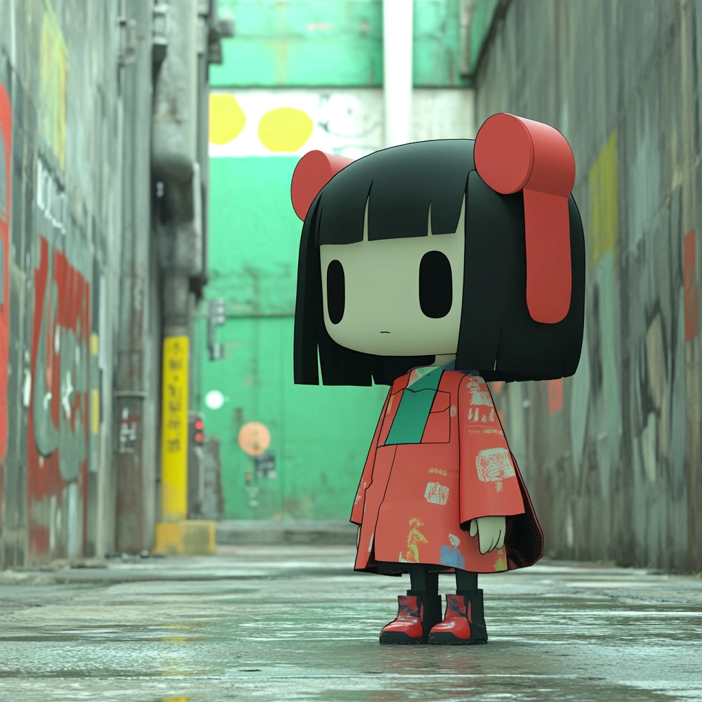 Strong, directional lighting highlights each element with precise shadows, enhancing depth. Colors are saturated, creating a playful, engaging palette that stands out against muted backgrounds. Space is well-defined, with clearly separated planes and textures that are smooth and inviting.