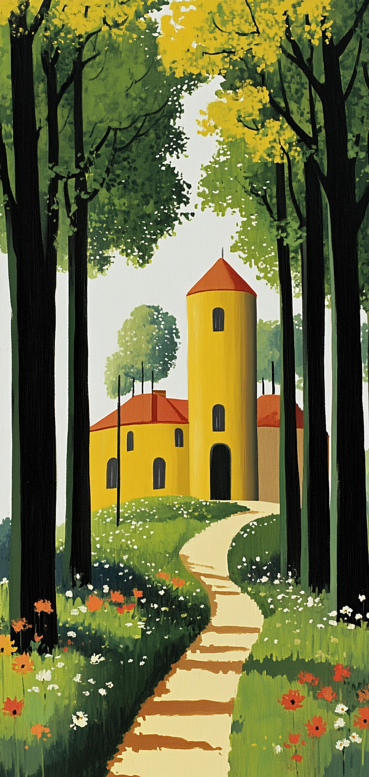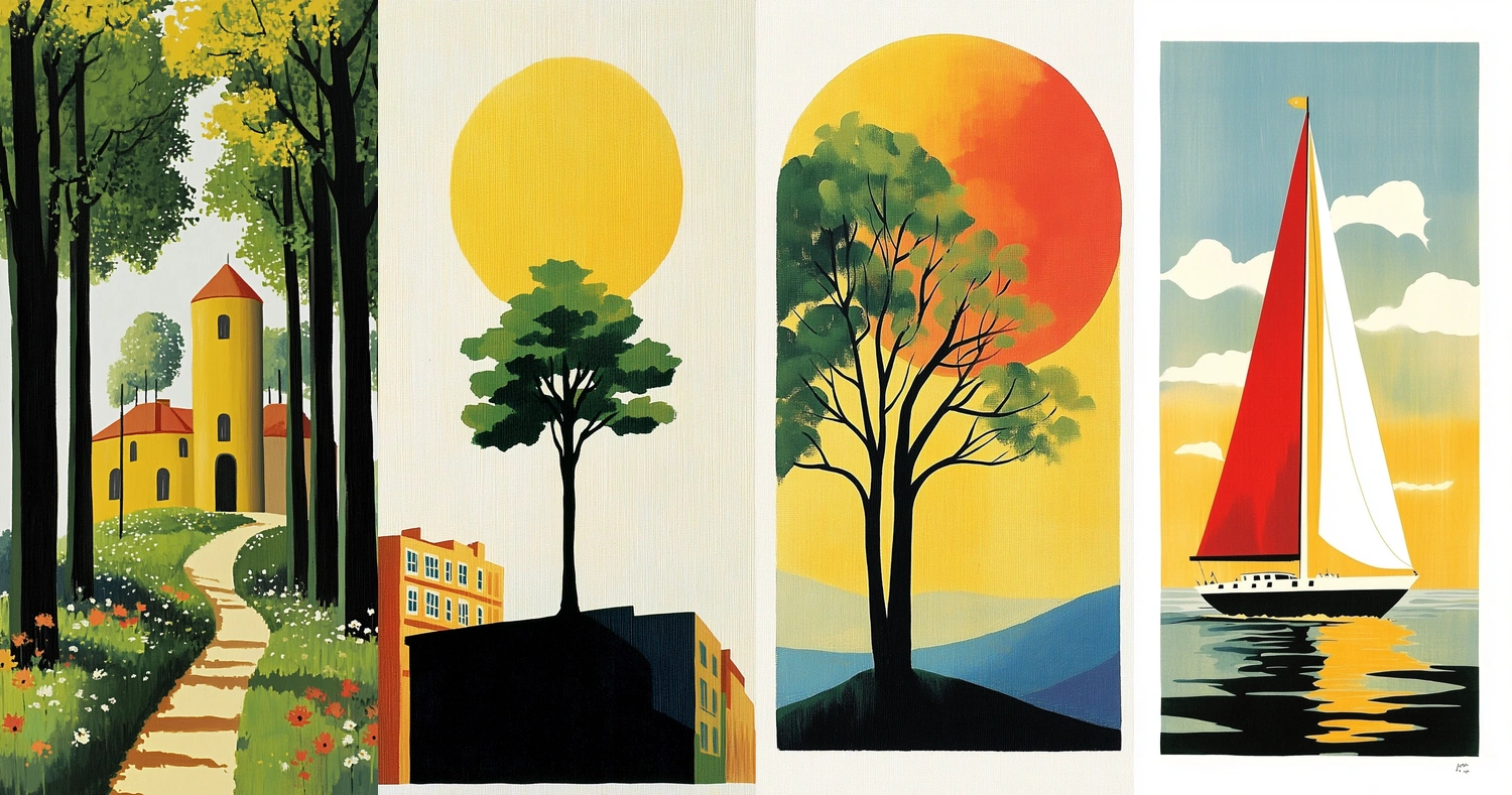 Using distinct lighting effects, the artwork presents bold silhouettes against vibrant suns. The brightness of colors like yellow and red is juxtaposed with darker, defined shapes, creating a strong visual impact through contrast and color harmony.