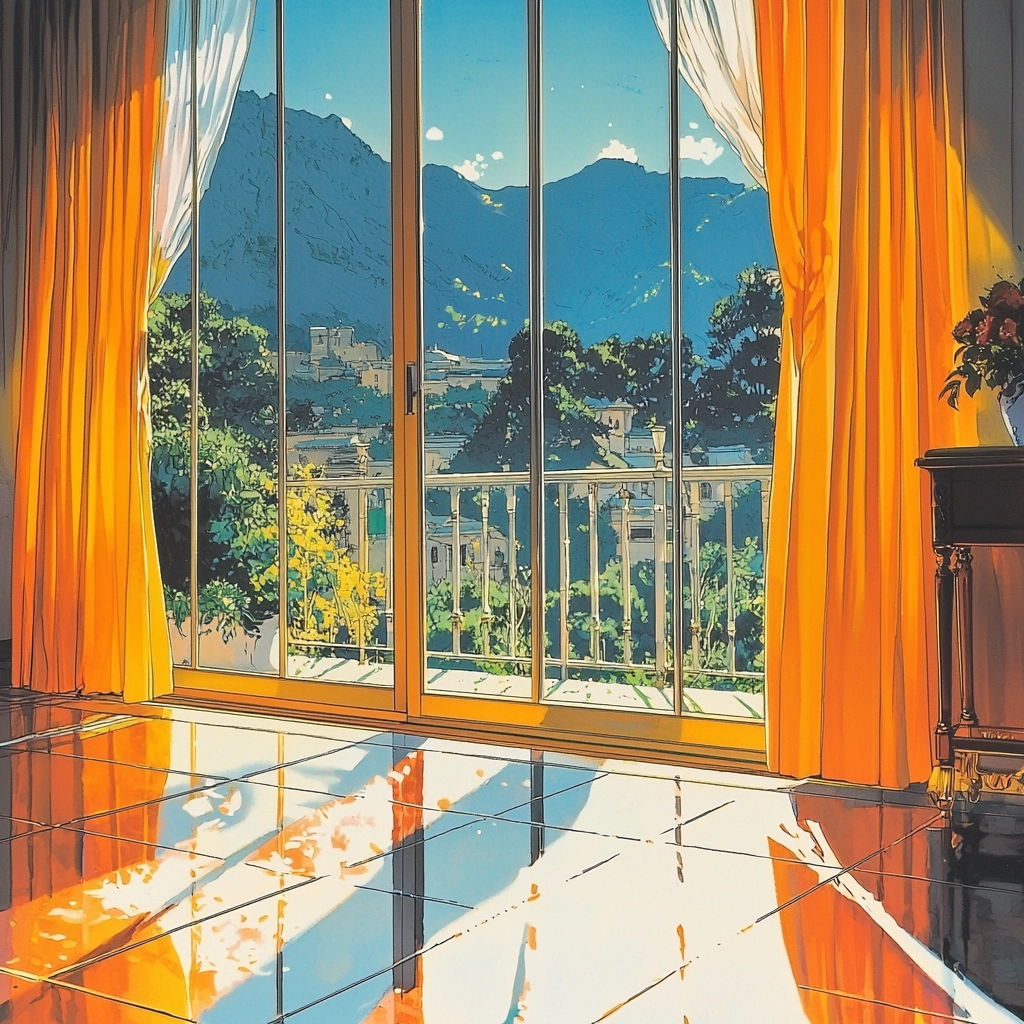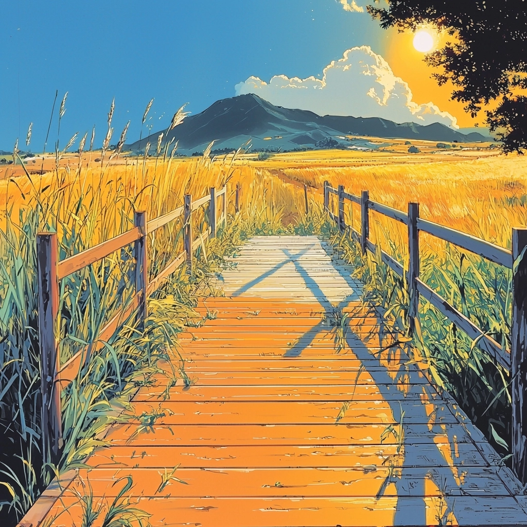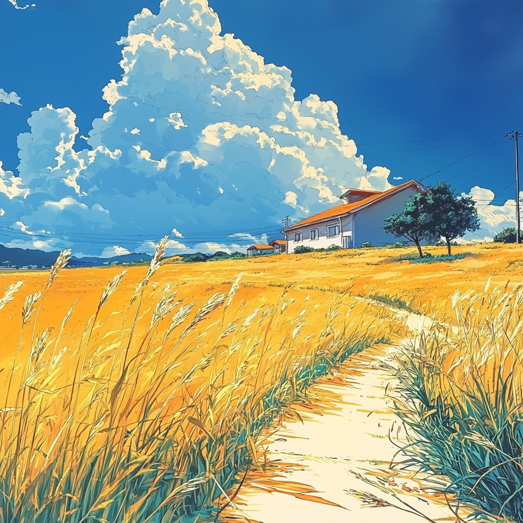 The lighting enhances the vivid yellow and orange hues, while the blue adds depth and contrast. The spatial arrangement creates a sense of distance, and the textures are depicted with clarity and precision.