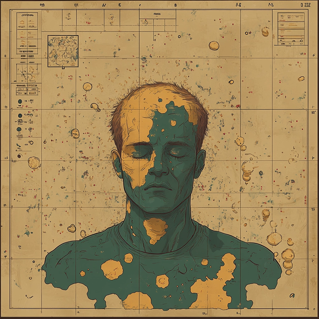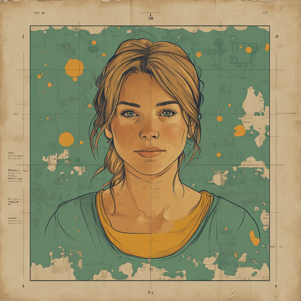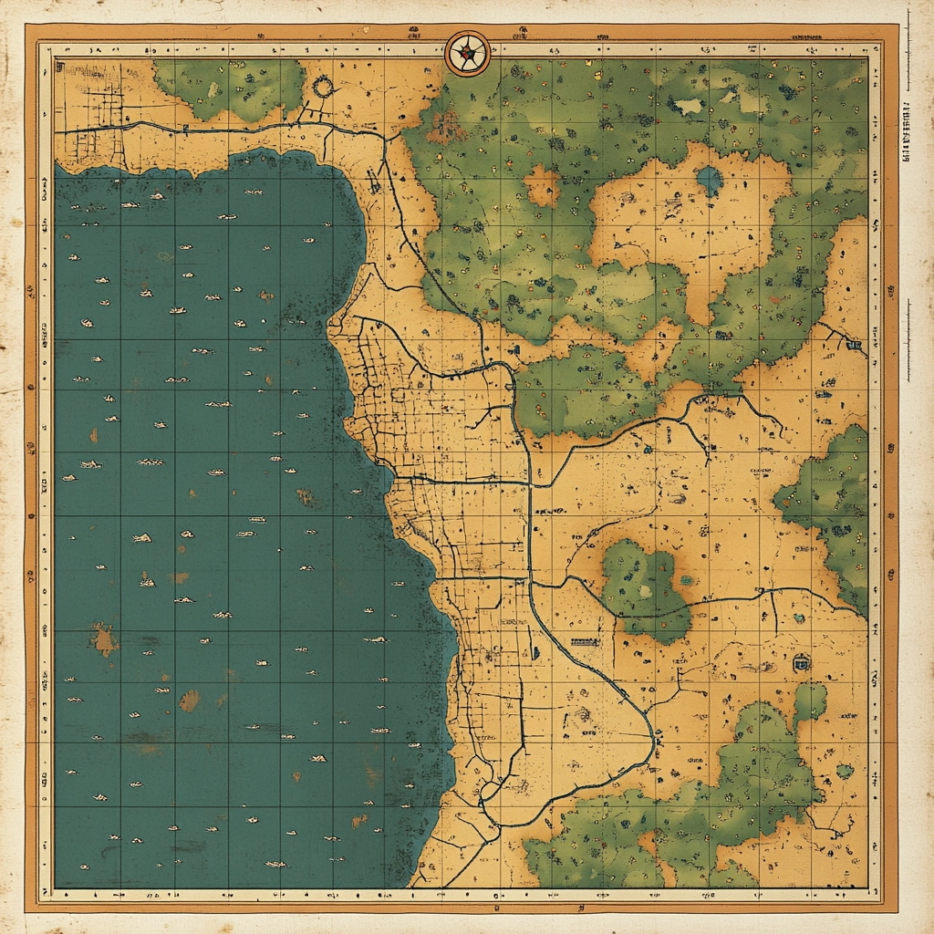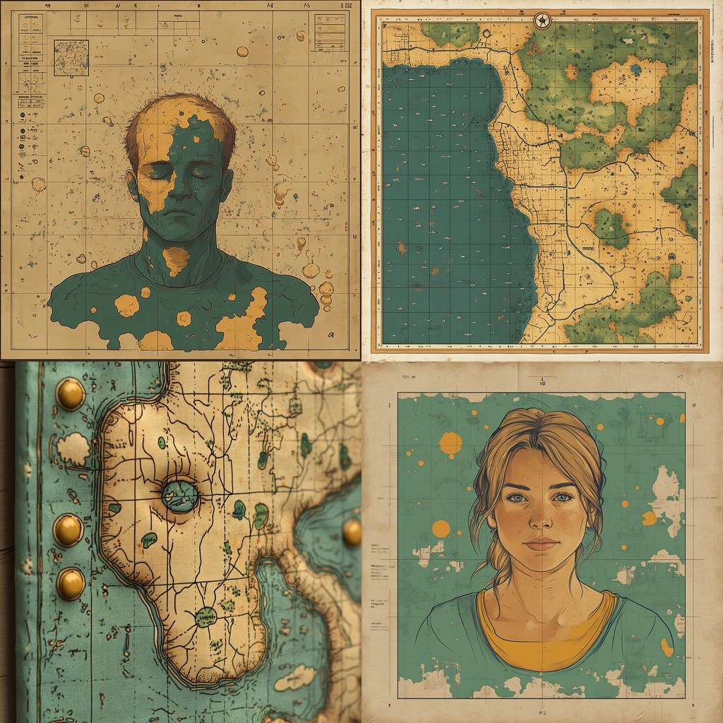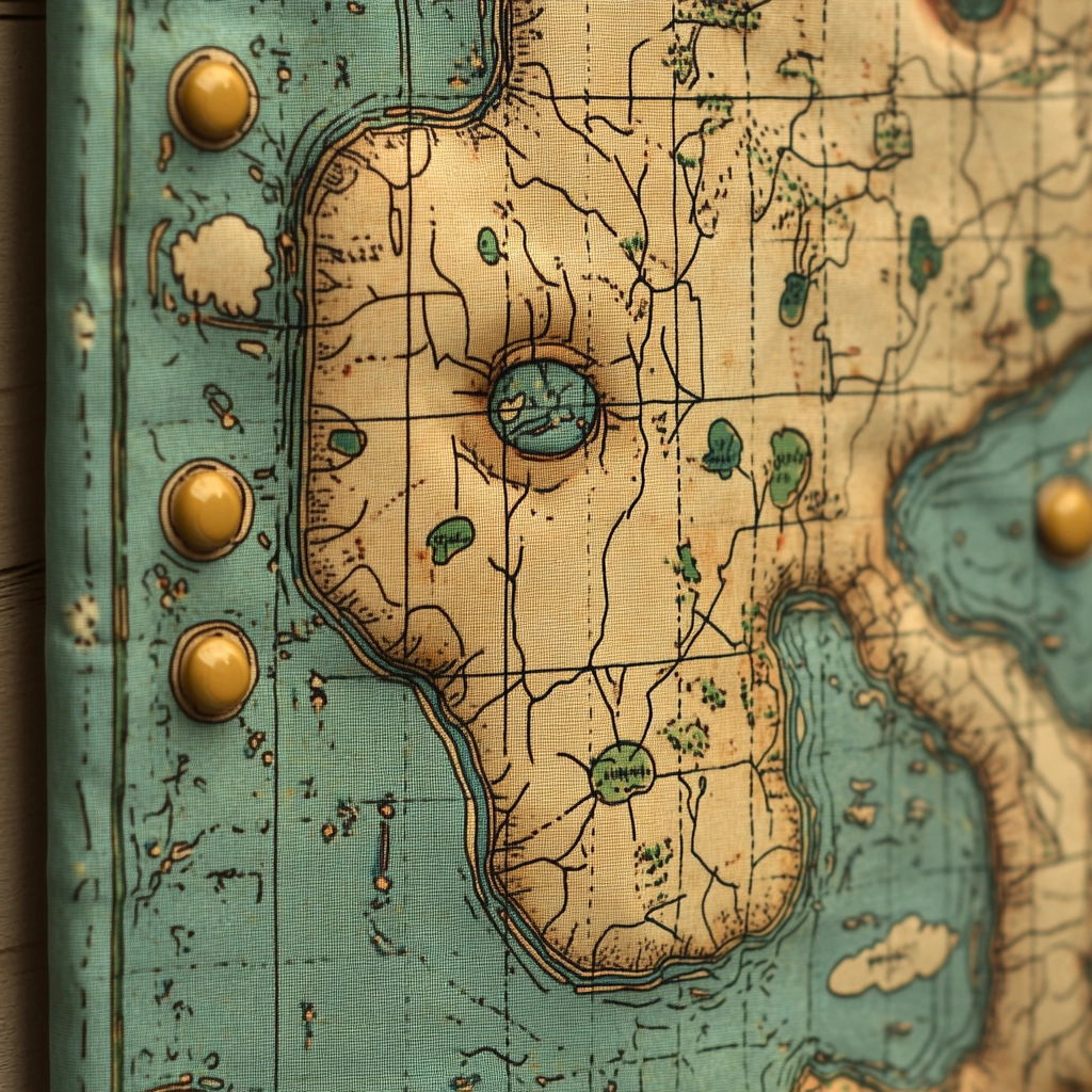 The lighting is even, highlighting the matte texture of the lines and forms. The colors have a muted quality, providing a sense of continuity across the spatial design. The textured surfaces resemble vintage cartographic elements with layered details.