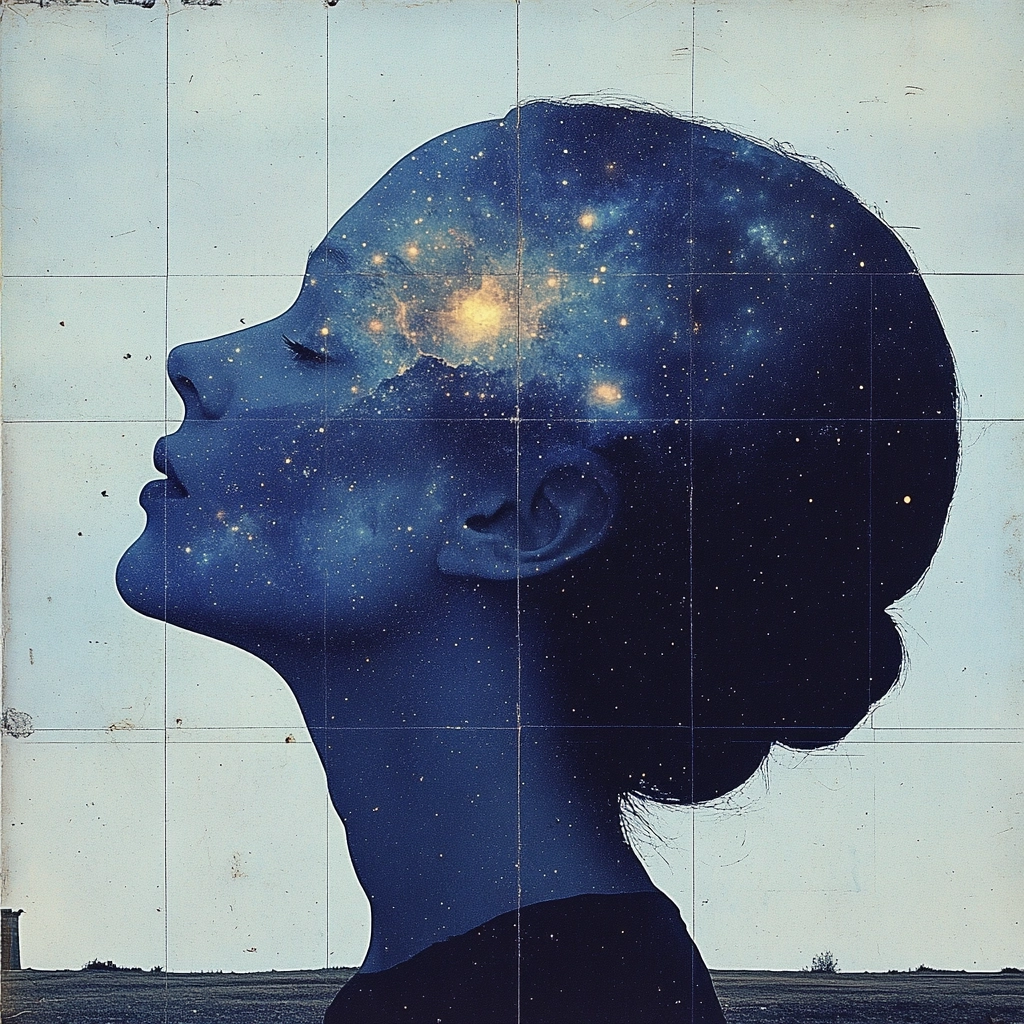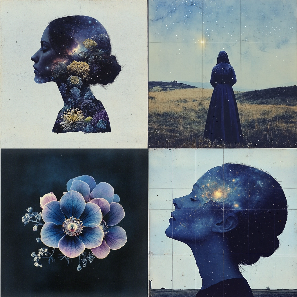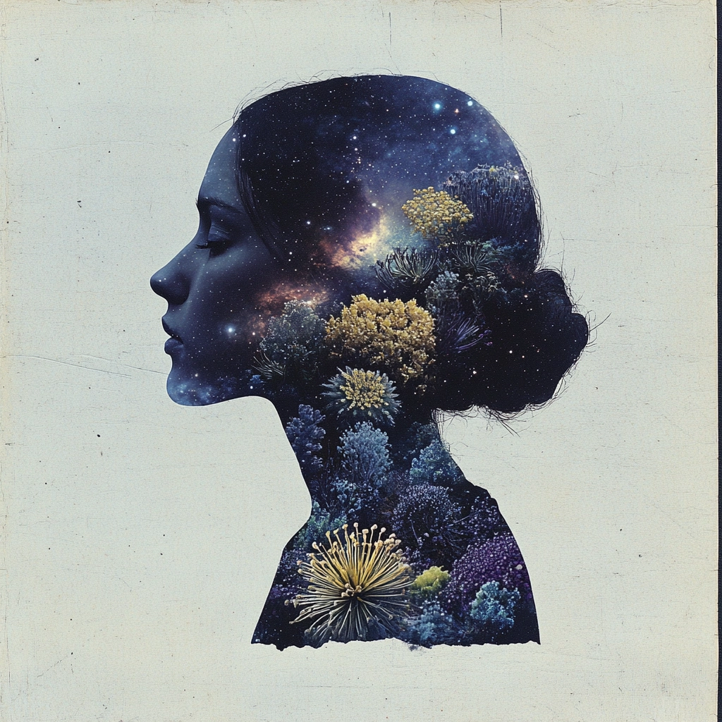 Intertwining of botanical elements and cosmic imagery within dark, moody frames.
