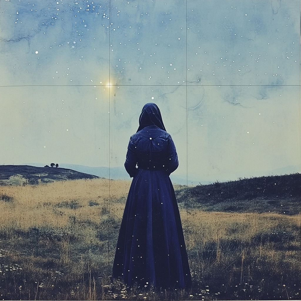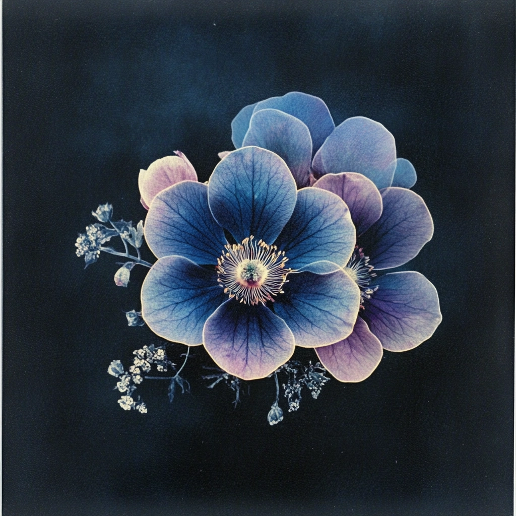 Lighting effects are subtle, creating a sense of depth and highlighting the interplay between light and shadow. Colors are rich and dark, emphasizing deep blues and purples, with nuanced gradients enhancing the visual experience. Spatial sense is layered and intricate, using textures to differentiate between organic and celestial elements.