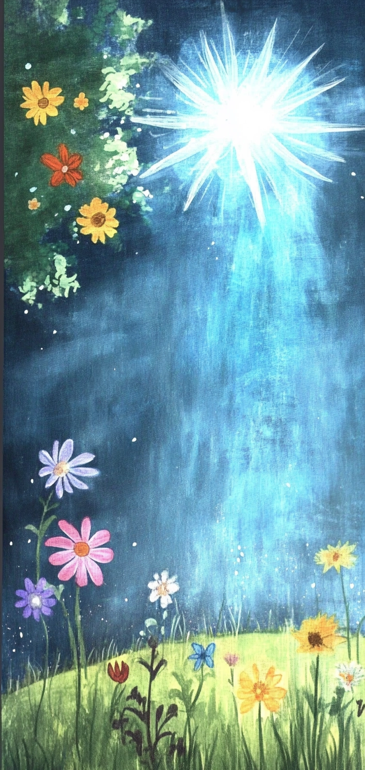 Intense light sources provide stark contrast against deep shades, creating a vivid sense of space. Textures are soft and smooth, enhancing the vibrant and mystical atmosphere.