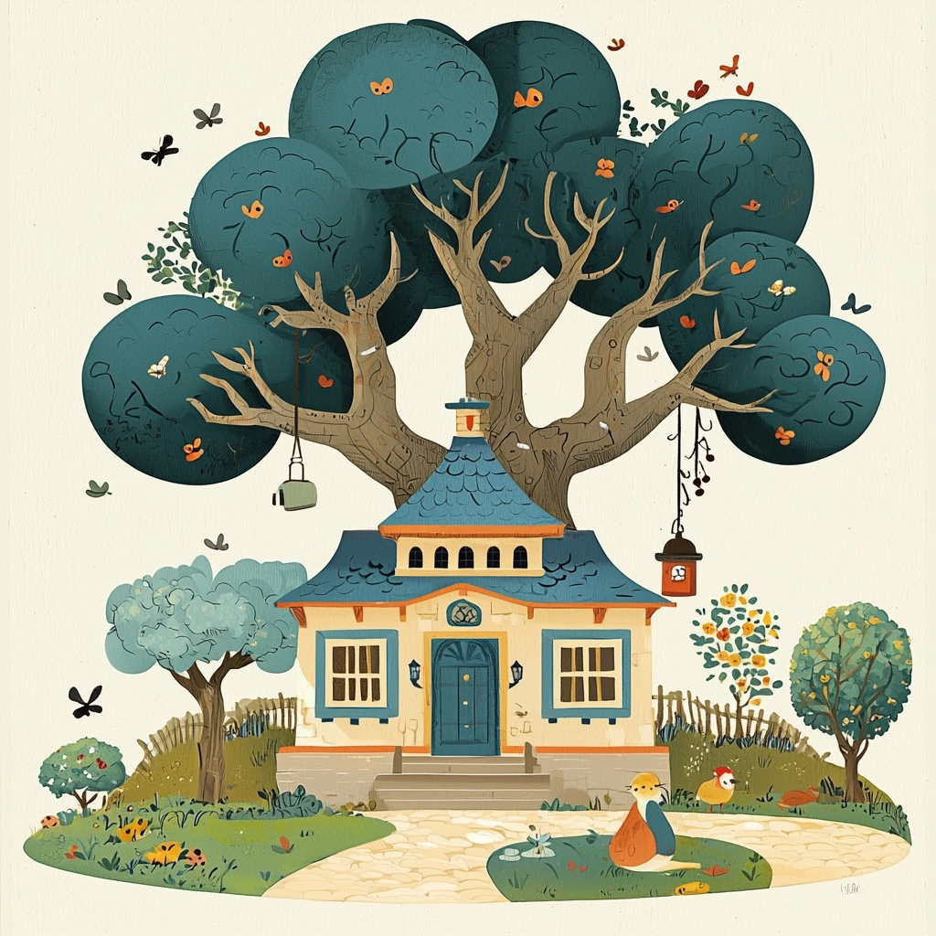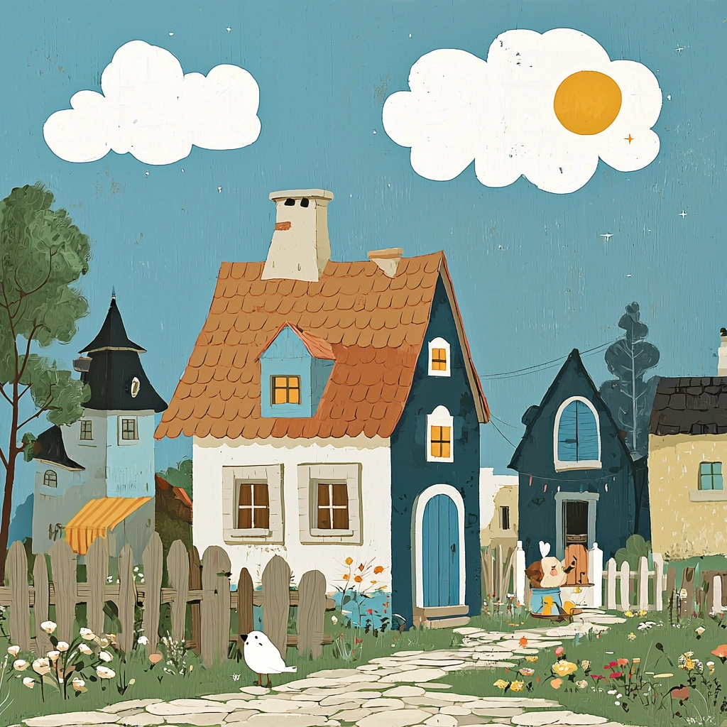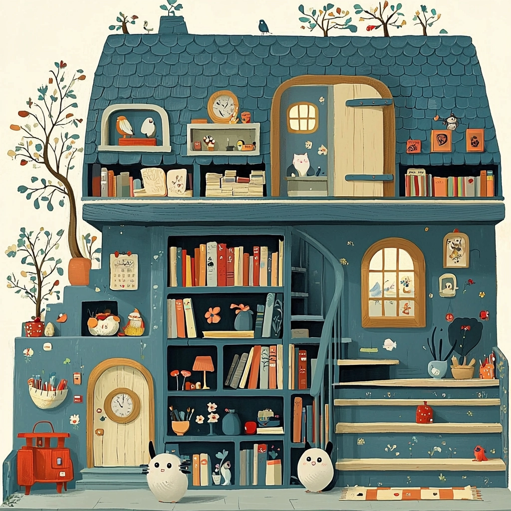 Soft lighting enhances calming hues, while detailed textures add depth. The balanced spatial design creates a picturesque and cozy scene, with smooth surfaces contrasting against intricate line work.