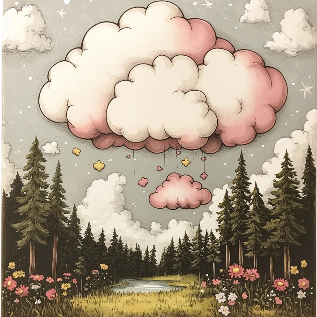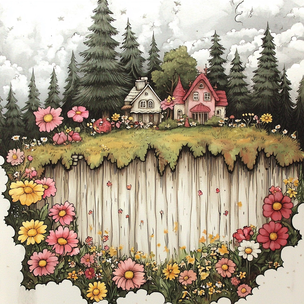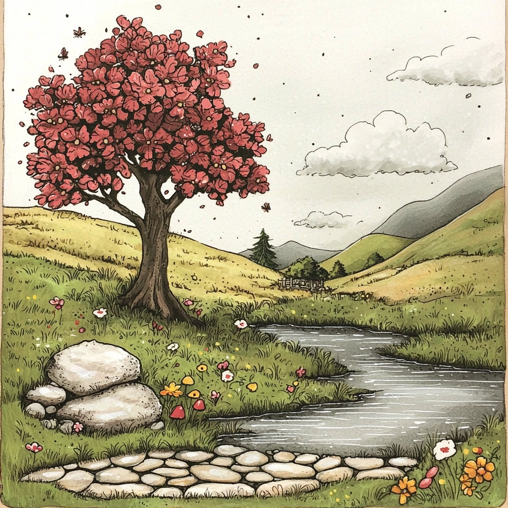 Soft lighting enhances detailed textures of nature, while gentle gradients in hues bring a vivid contrast between elements. A sense of depth is maintained through clear visual layers and delicate line work.