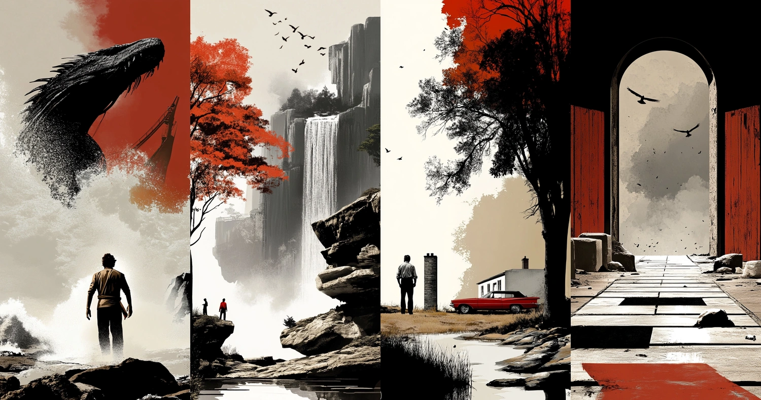 There is a strong sense of light and shadow interplay, with high contrast black and white leading to a heightened spatial awareness. Rich red accents provide bold texture and depth, offering a visceral visual sensation.