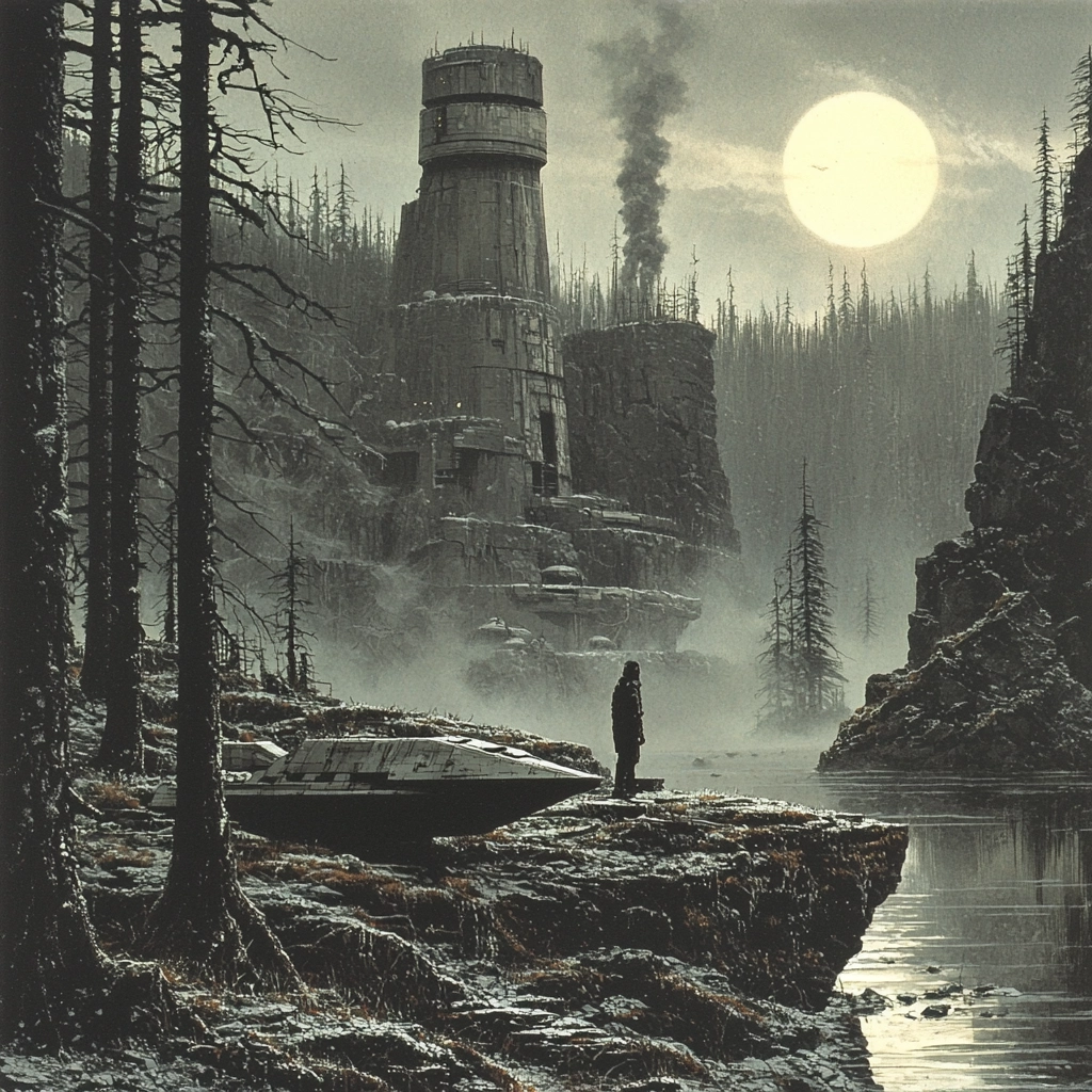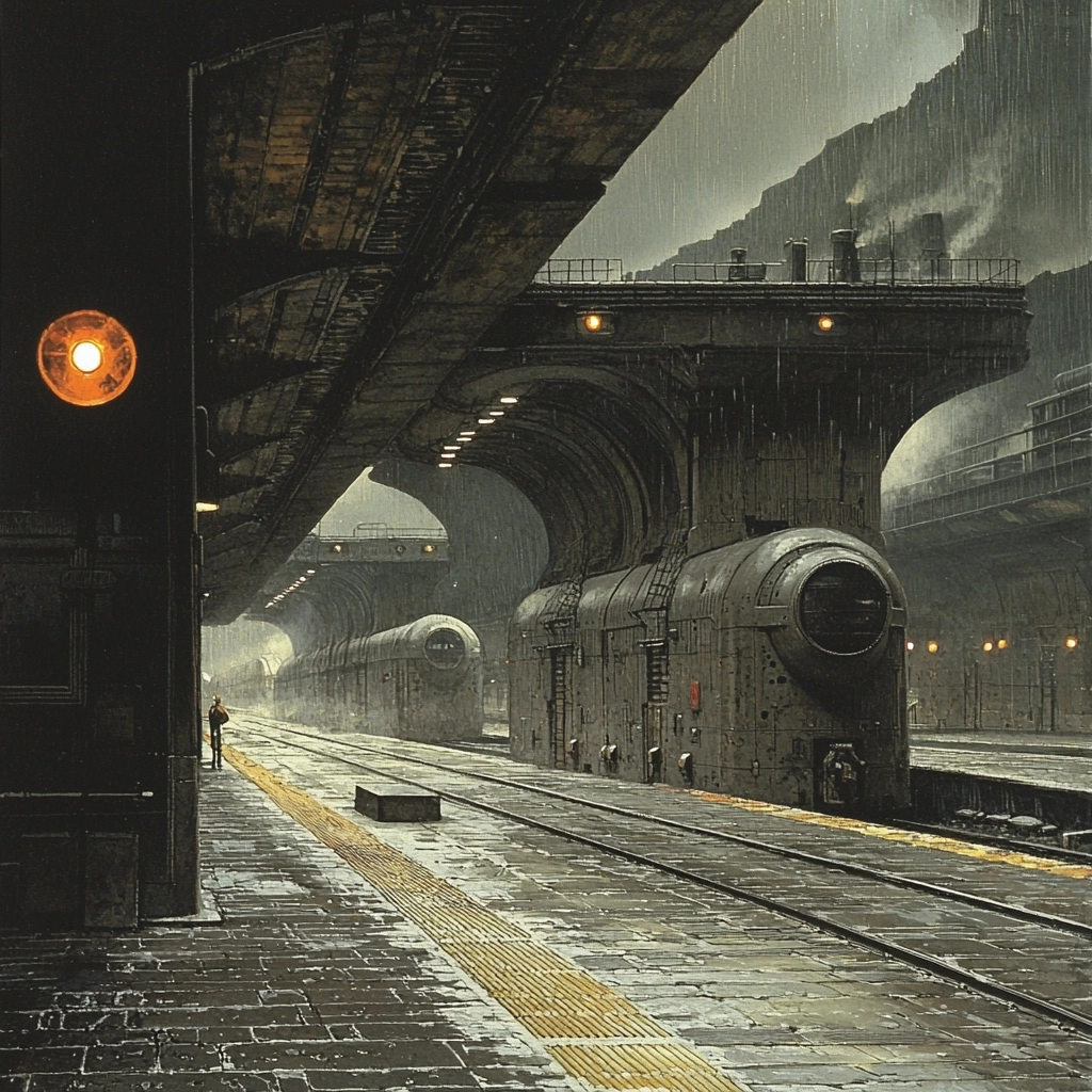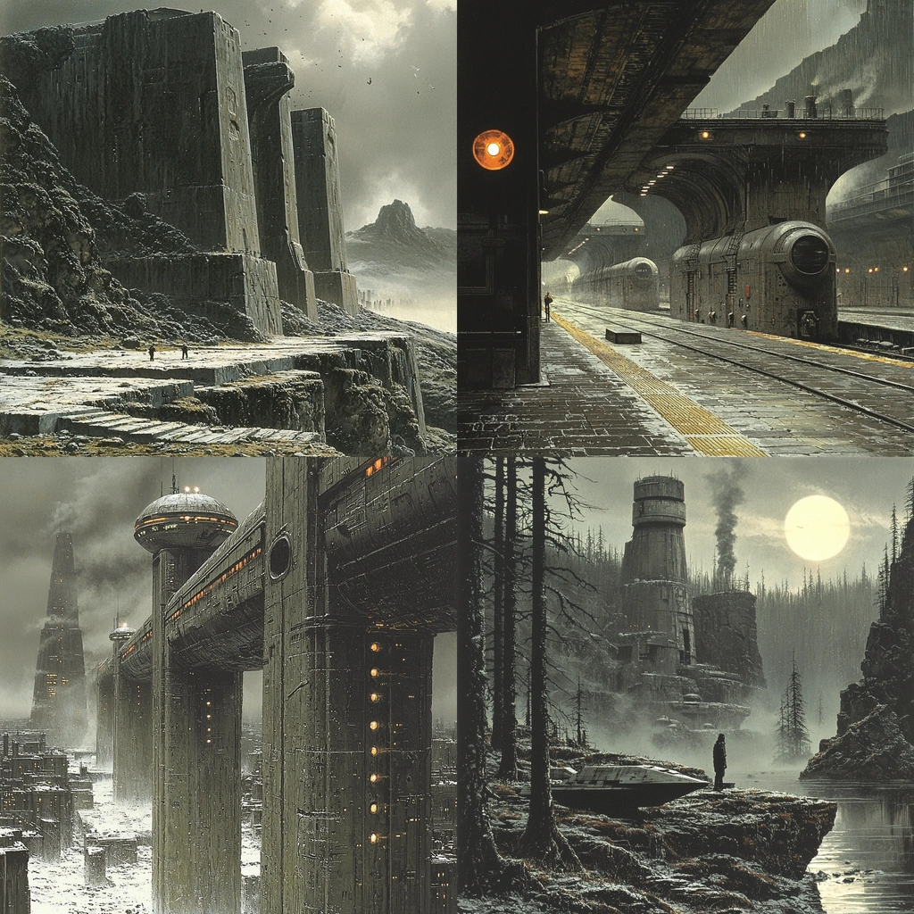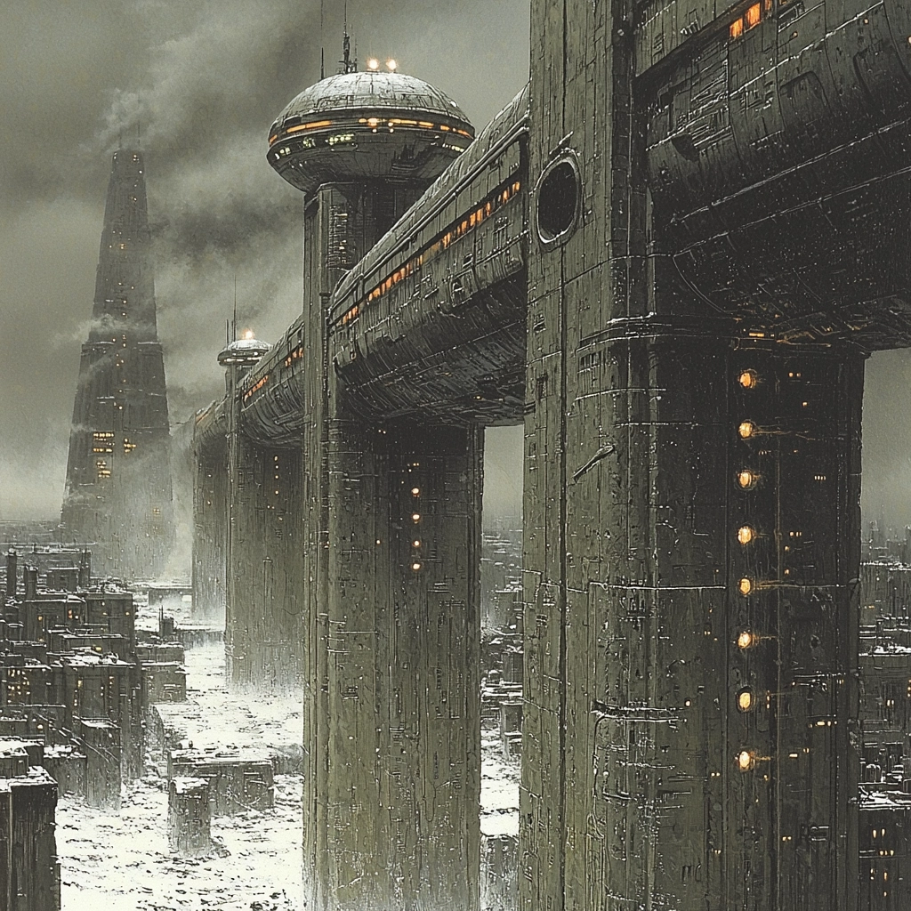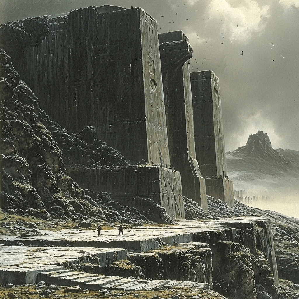 Muted lighting enhances the monumental architectural forms, with a spatial depth conveyed through precisely rendered textures. The use of gray and dark blue accentuates the solid yet desolate atmosphere.