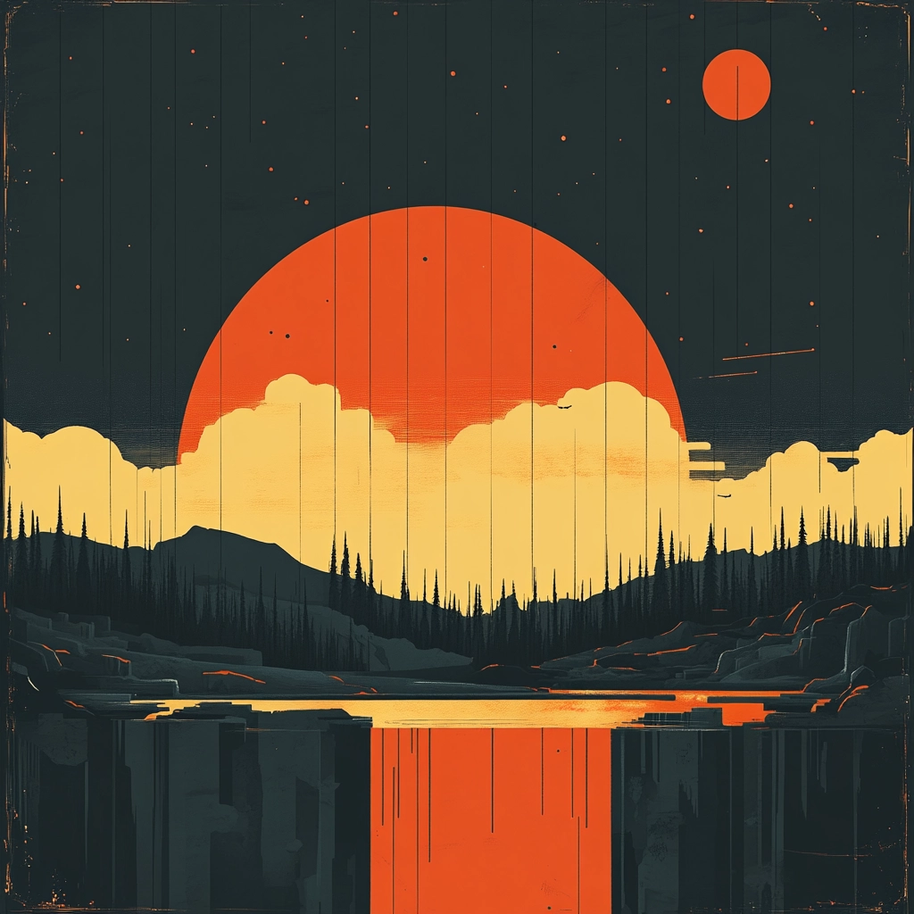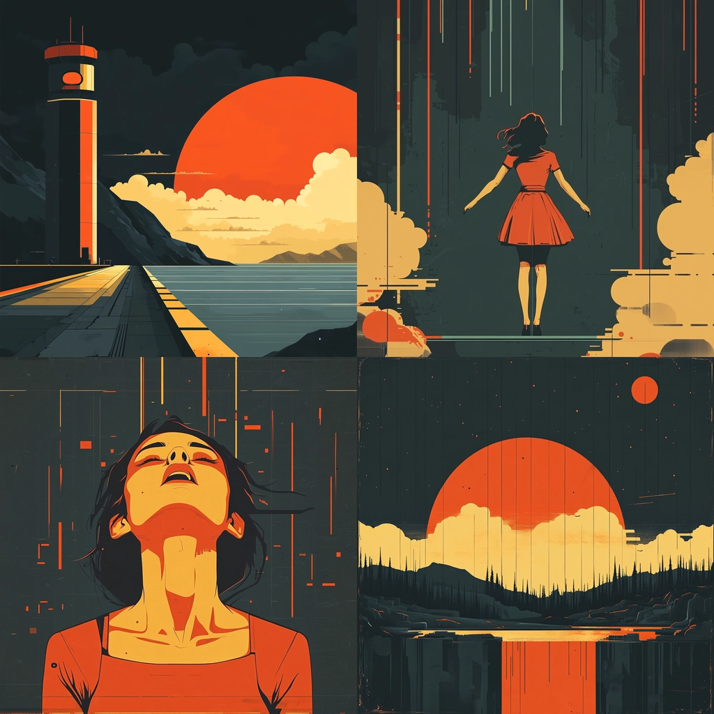 Bold compositions utilize warm color contrasts to evoke depth.
