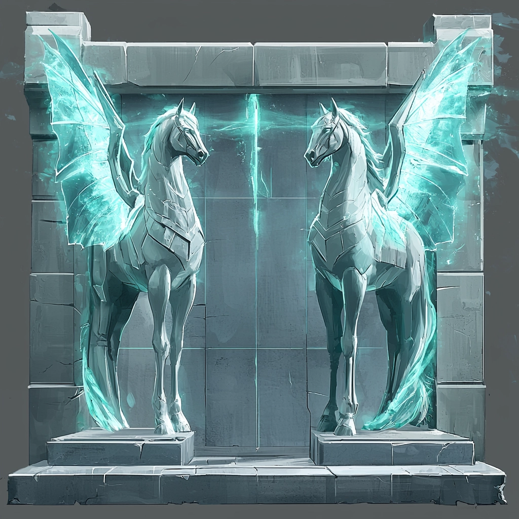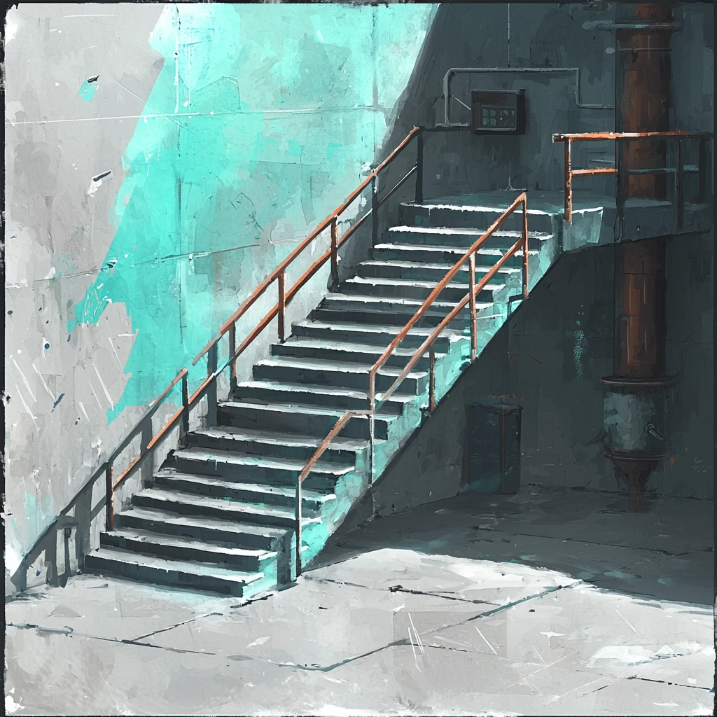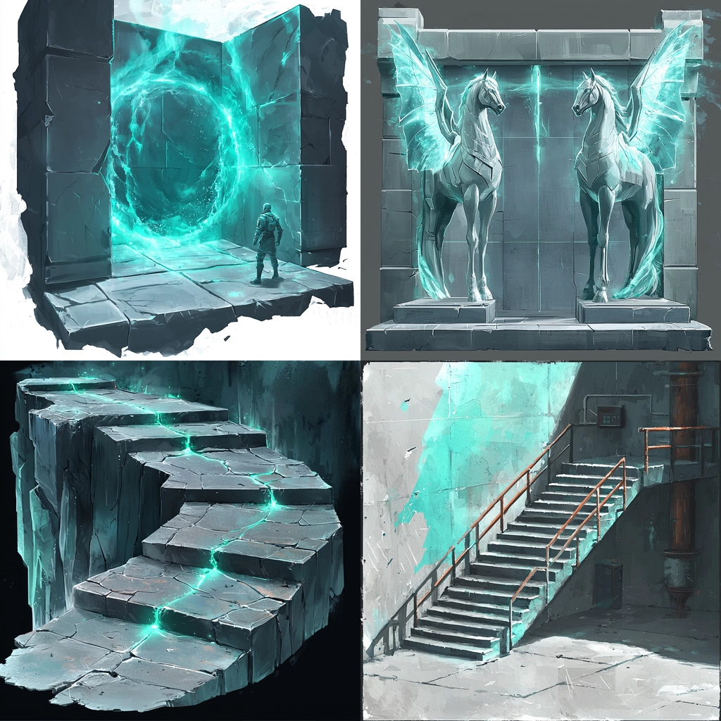 This style combines sharp stone textures with glowing cyan highlights and balanced light and shadow to create precise spatial depth and surface differentiation.
