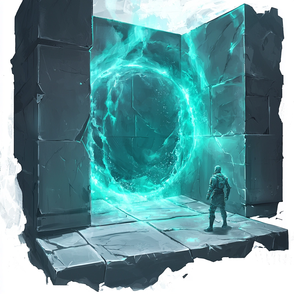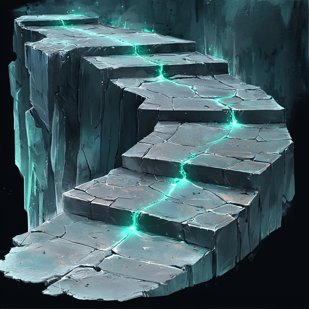 Lighting is used to emphasize edges and cracks through glowing cyan lines, creating high contrast with the matte gray stone surfaces; shadows are cast realistically to convey solid volume; texture expression varies from rough fractured stone to smooth metallic surfaces, enhancing the sense of materiality; spatial sense is articulated by clear perspective and layered elements, reinforcing three-dimensional form.