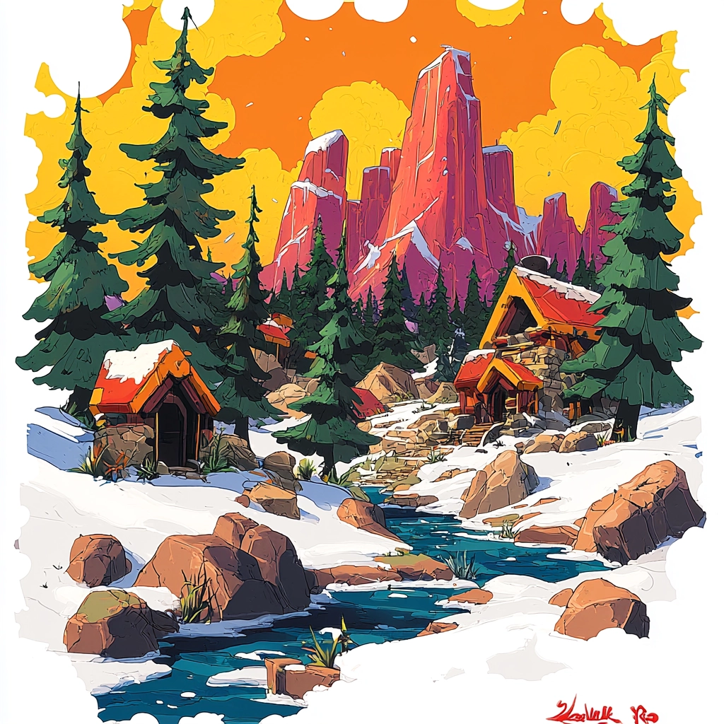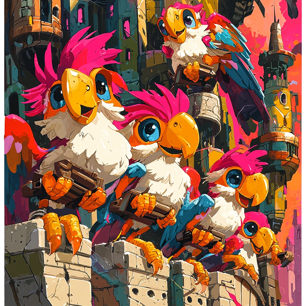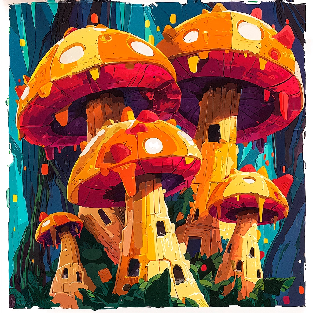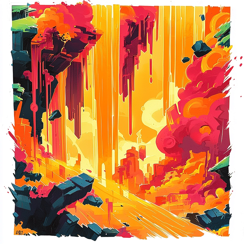 Utilizes bright and saturated pigments, incorporating consistent lighting that highlights textural contrasts and creates an illusion of depth. Composition balances chaotic and structured elements through skillful use of spatial dynamics.