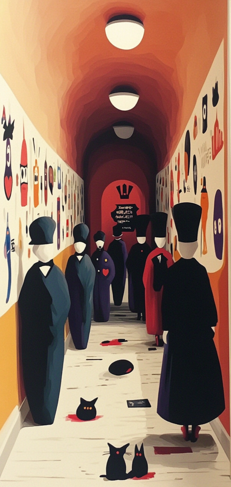 Lighting emphasizes bold outlines with flat, vivid colors. The composition is balanced with vertical symmetry, offering clean textures and minimalistic forms that add depth. Illumination is minimal but effective.