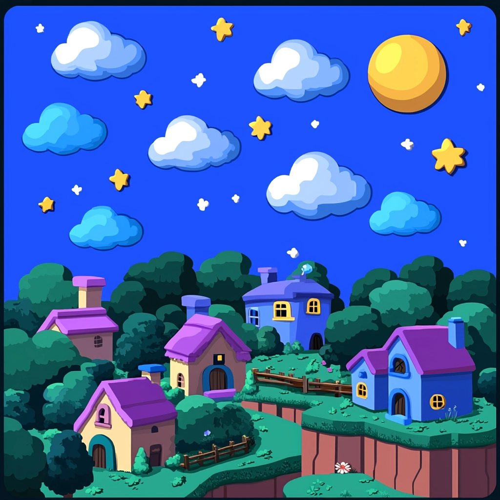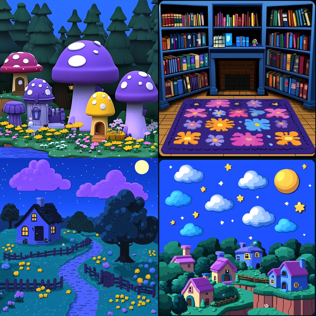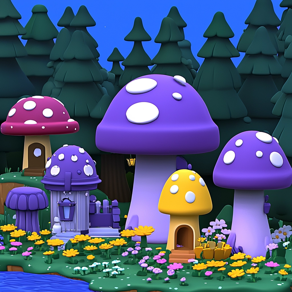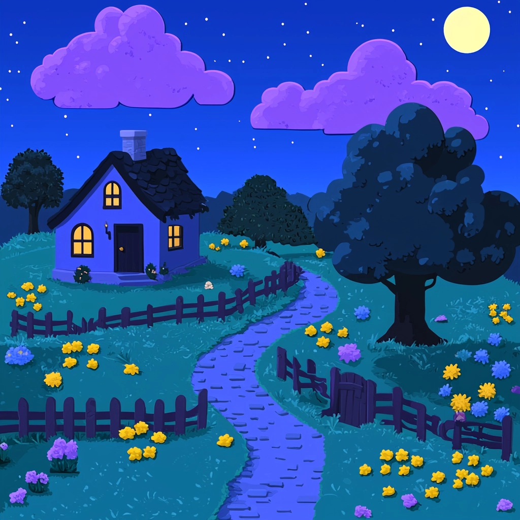 The artwork uses vibrant lighting and bold contrasts to highlight its elements, with the blue and purple tones giving a rich depth, enhancing the sense of a playful nighttime world. The textured forms are smooth, offering a polished and cohesive look.