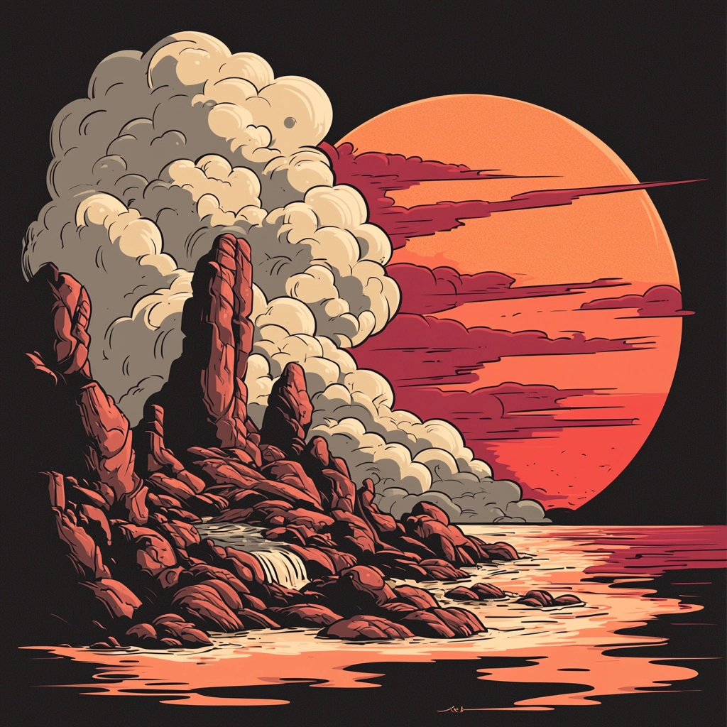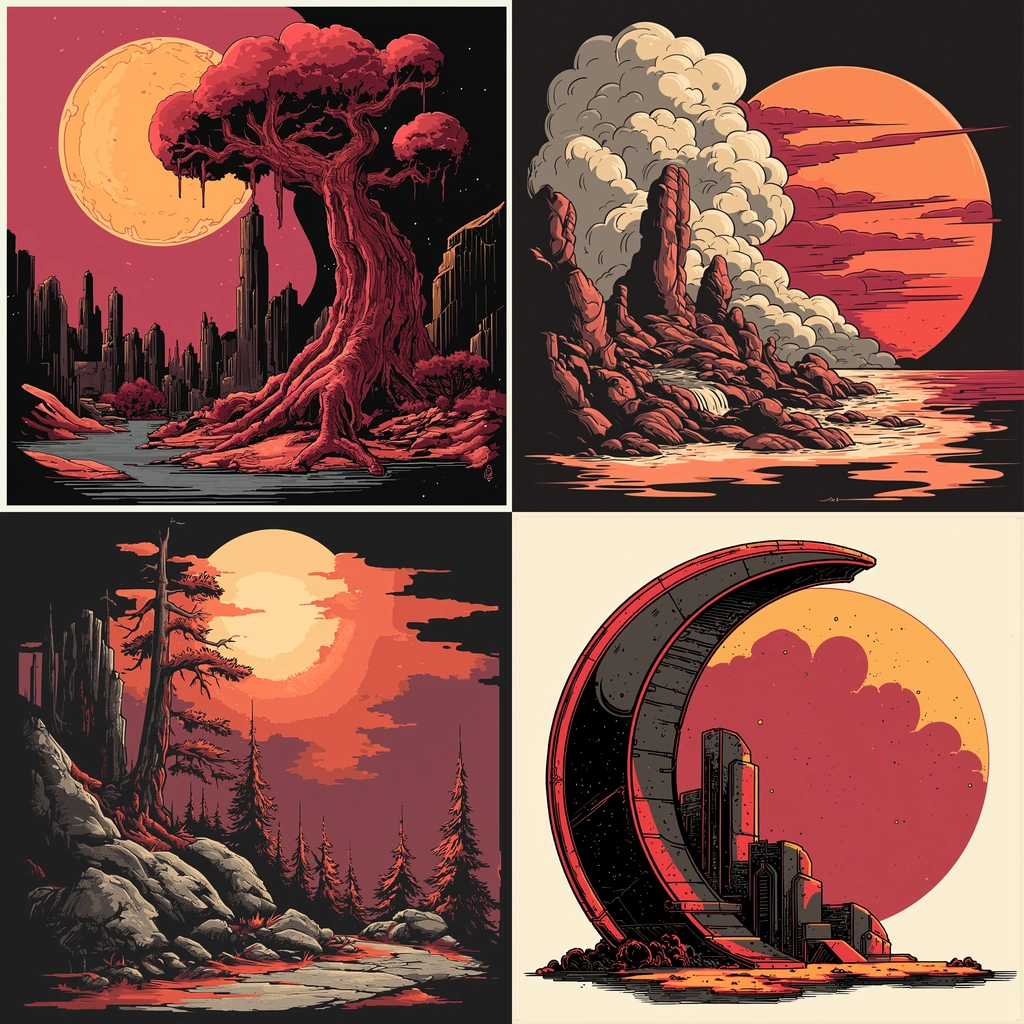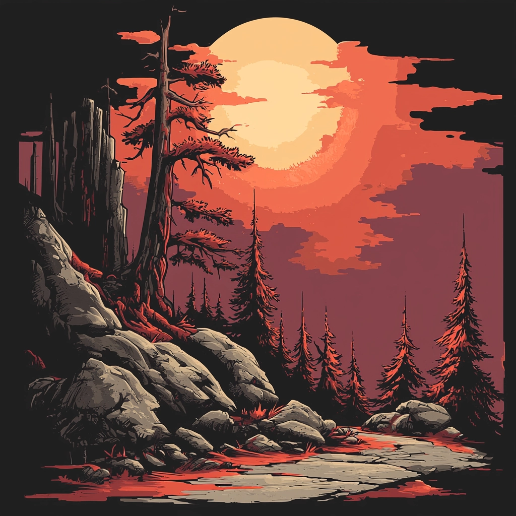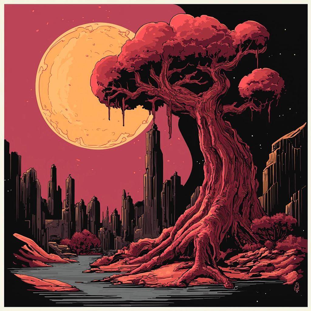 Featuring bold contrasts, this style merges vivid reds and oranges with deep blacks in a layered composition.