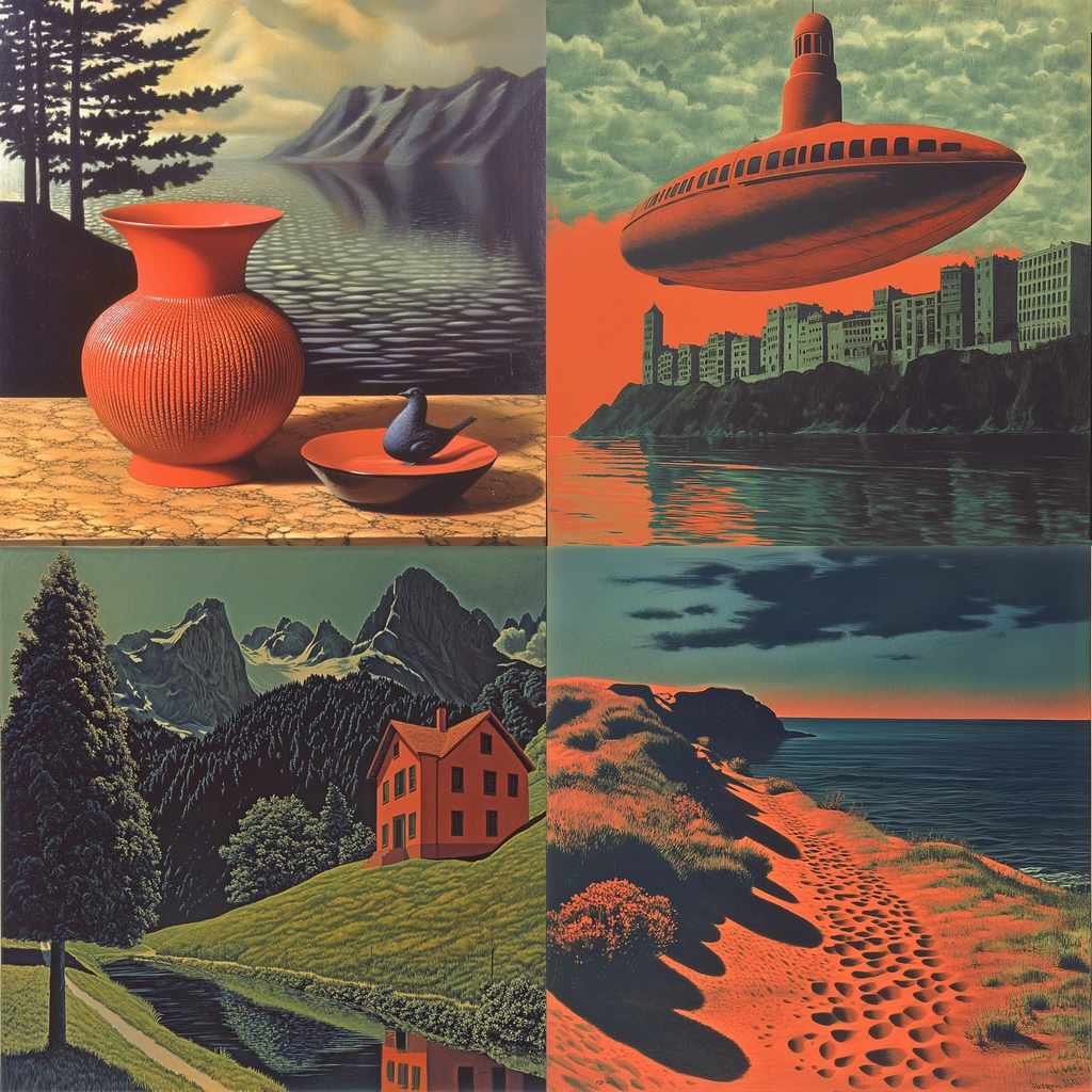Lighting creates depth and drama, silhouetting forms against vibrant backgrounds. Red imparts intensity, while green provides balance in color palettes. Deep textures enrich spatial dimensions, highlighting contour variations.