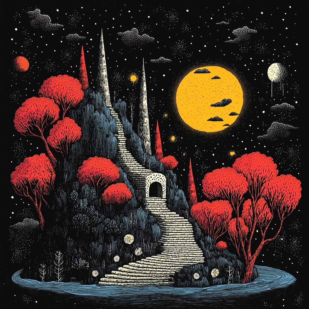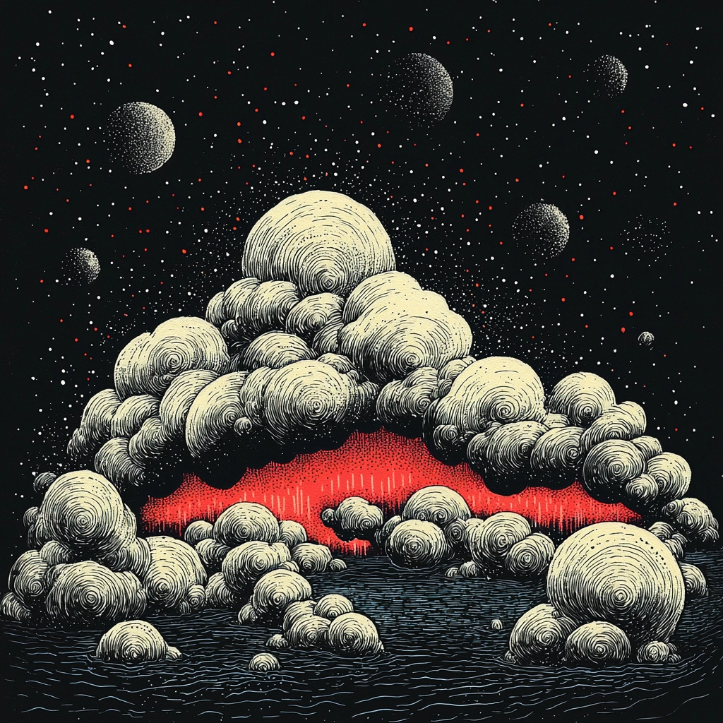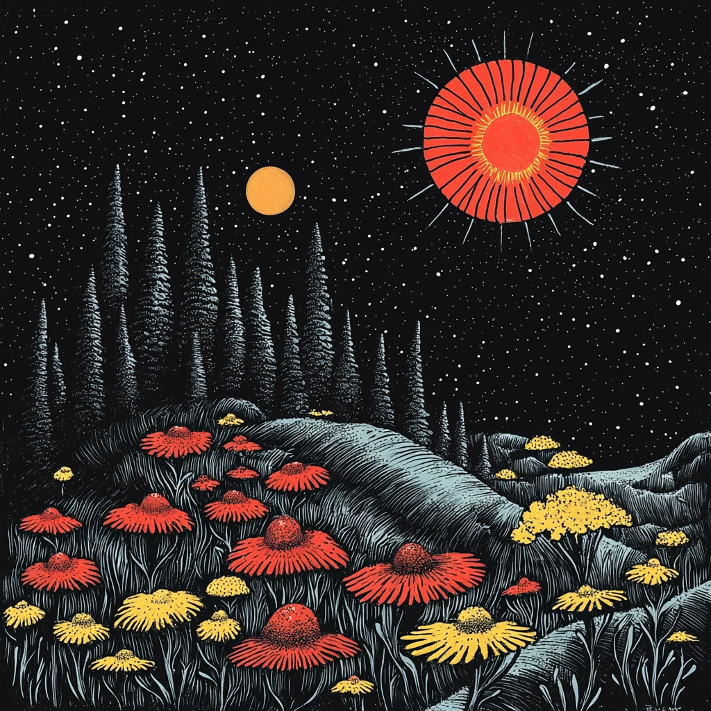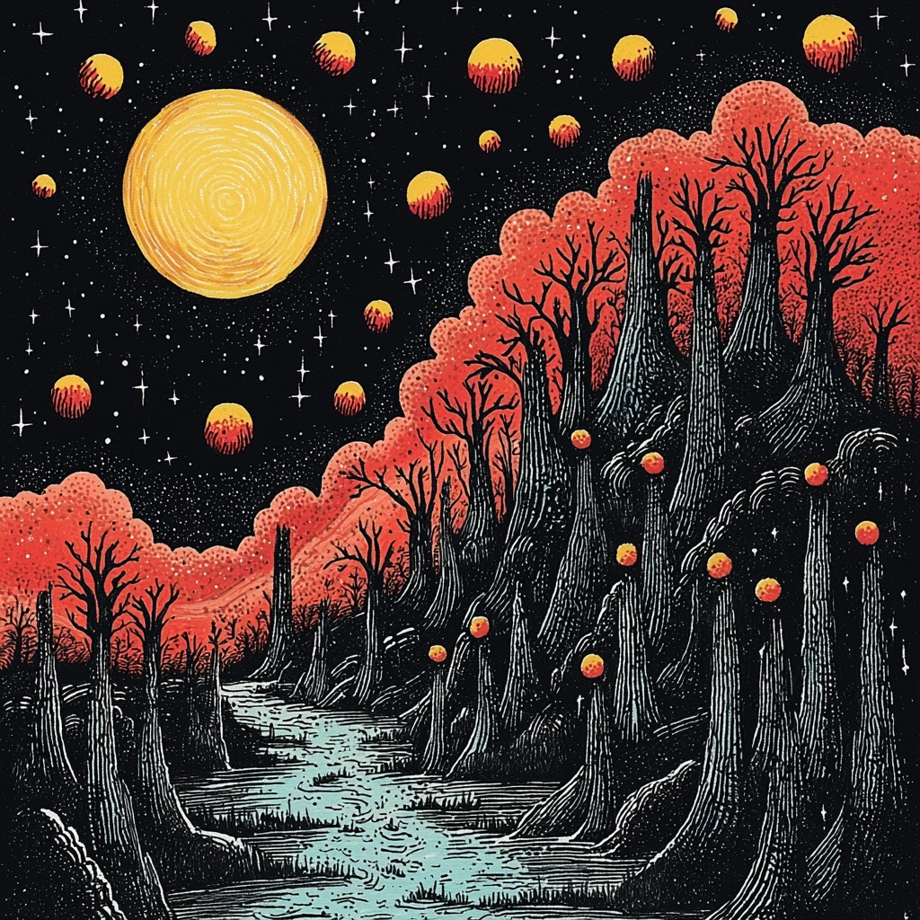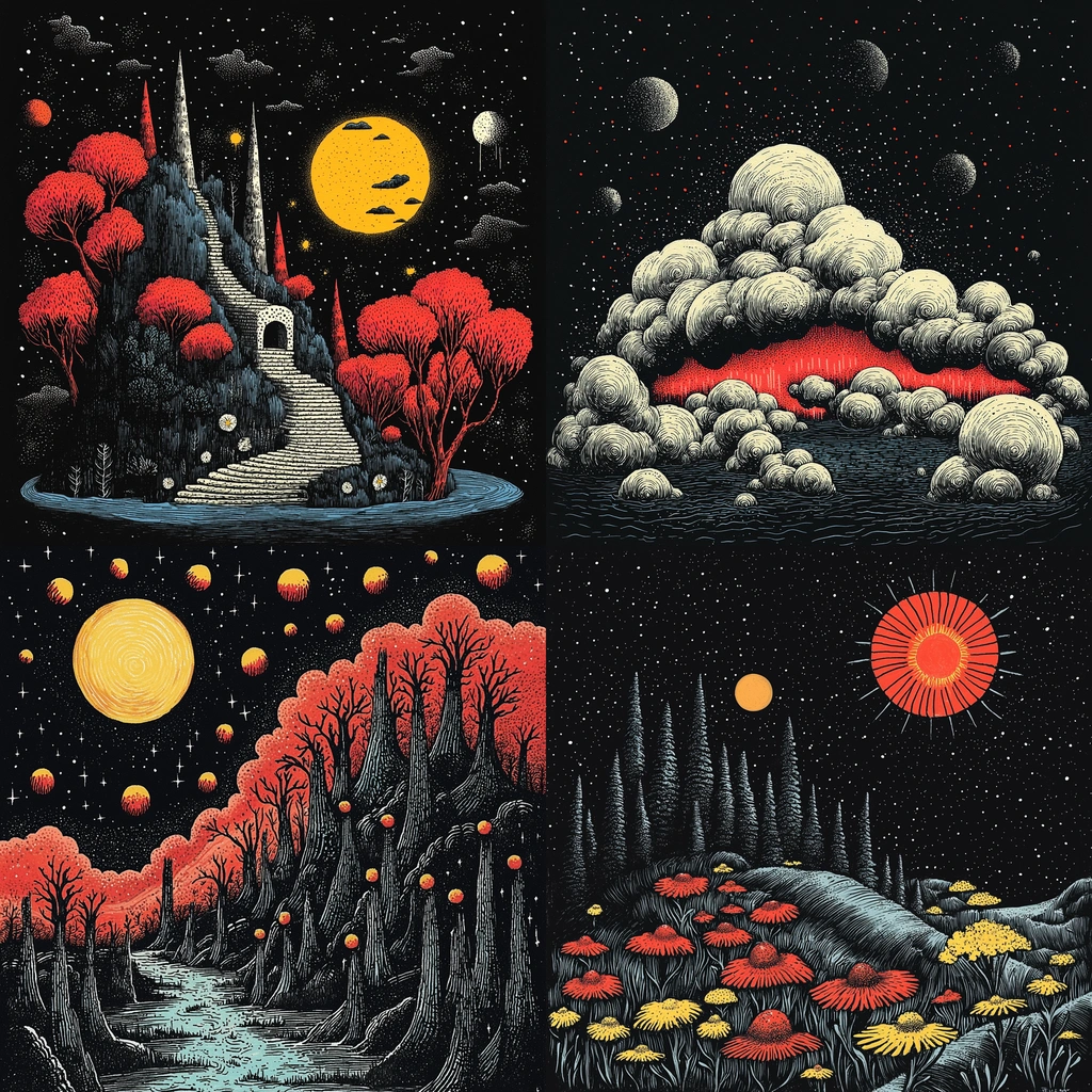 The use of dark backgrounds enhances vivid reds and yellows, creating sharp contrasts that intensify the light source presence. Textures mimic celestial and natural formations, conveying depth and complexity with meticulous detailing.
