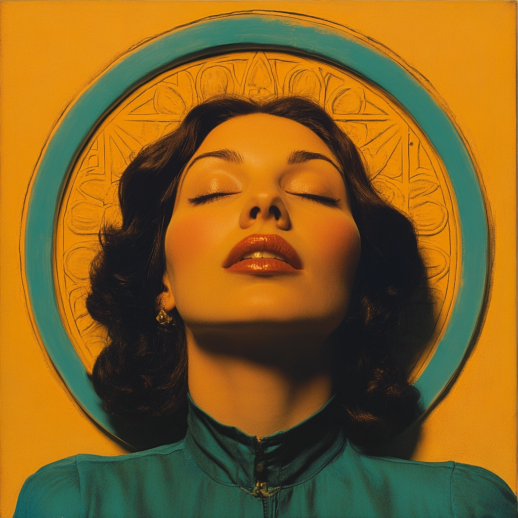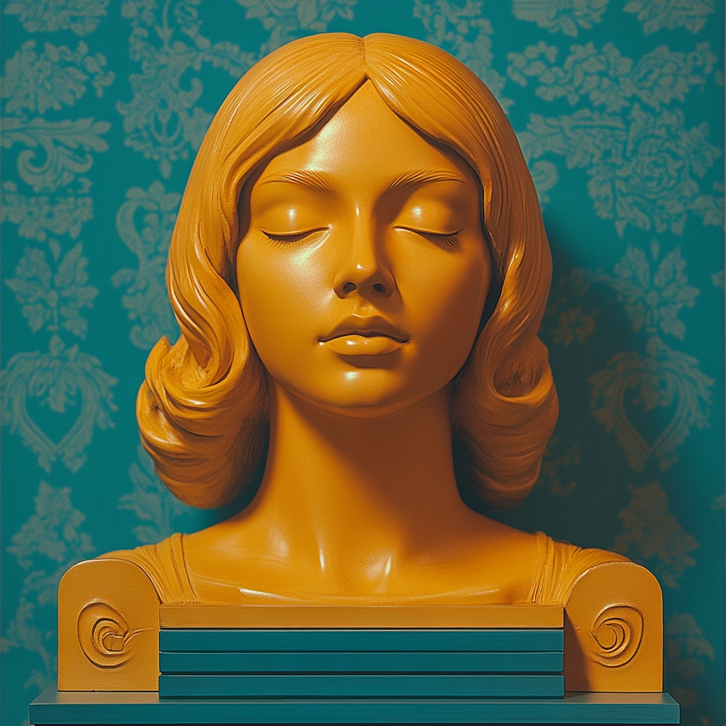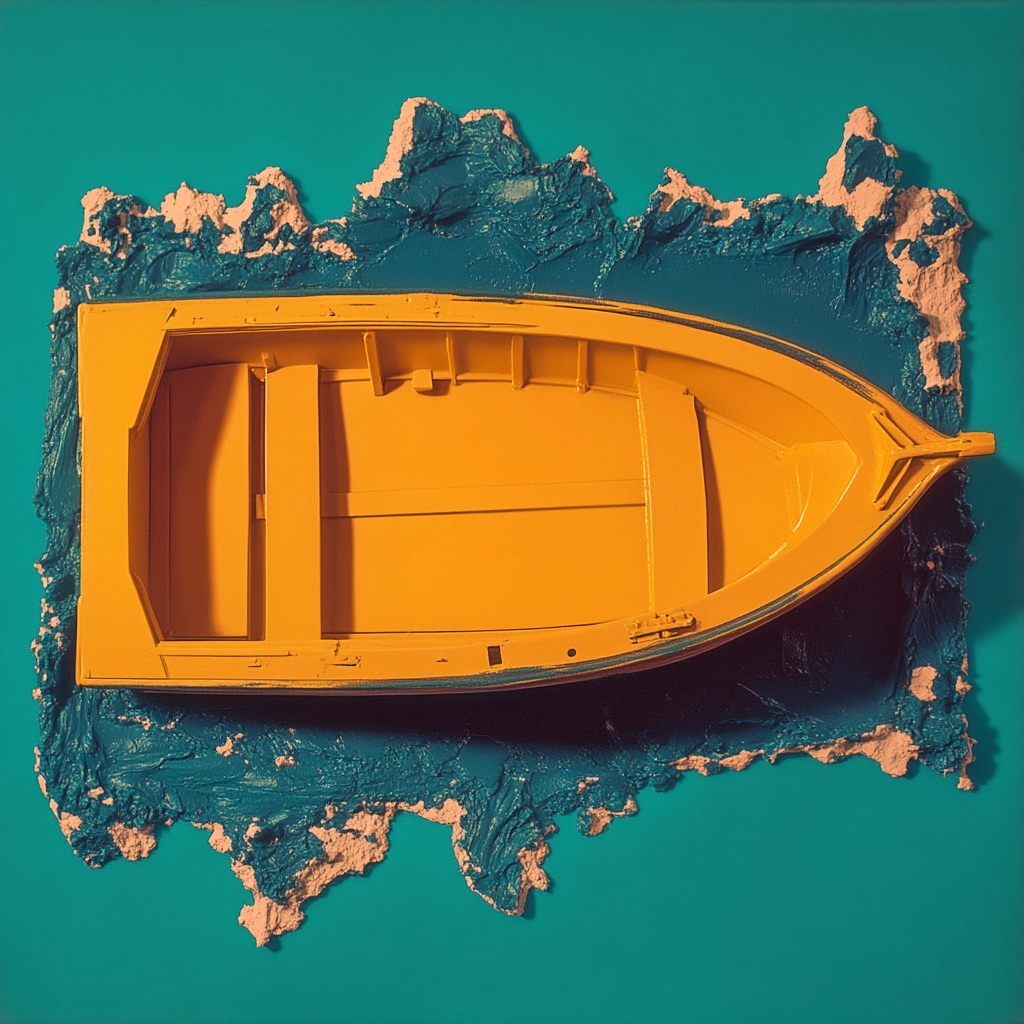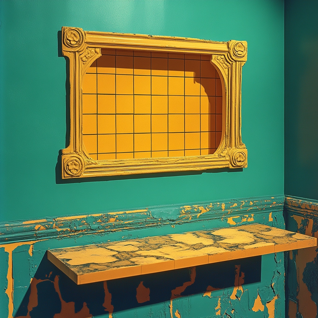 The composition employs bold lighting to enhance textures. Turquoise and yellow dominate, highlighted by a textured blue background. The spatial arrangement creates distinct focal points through sharp contrasts.