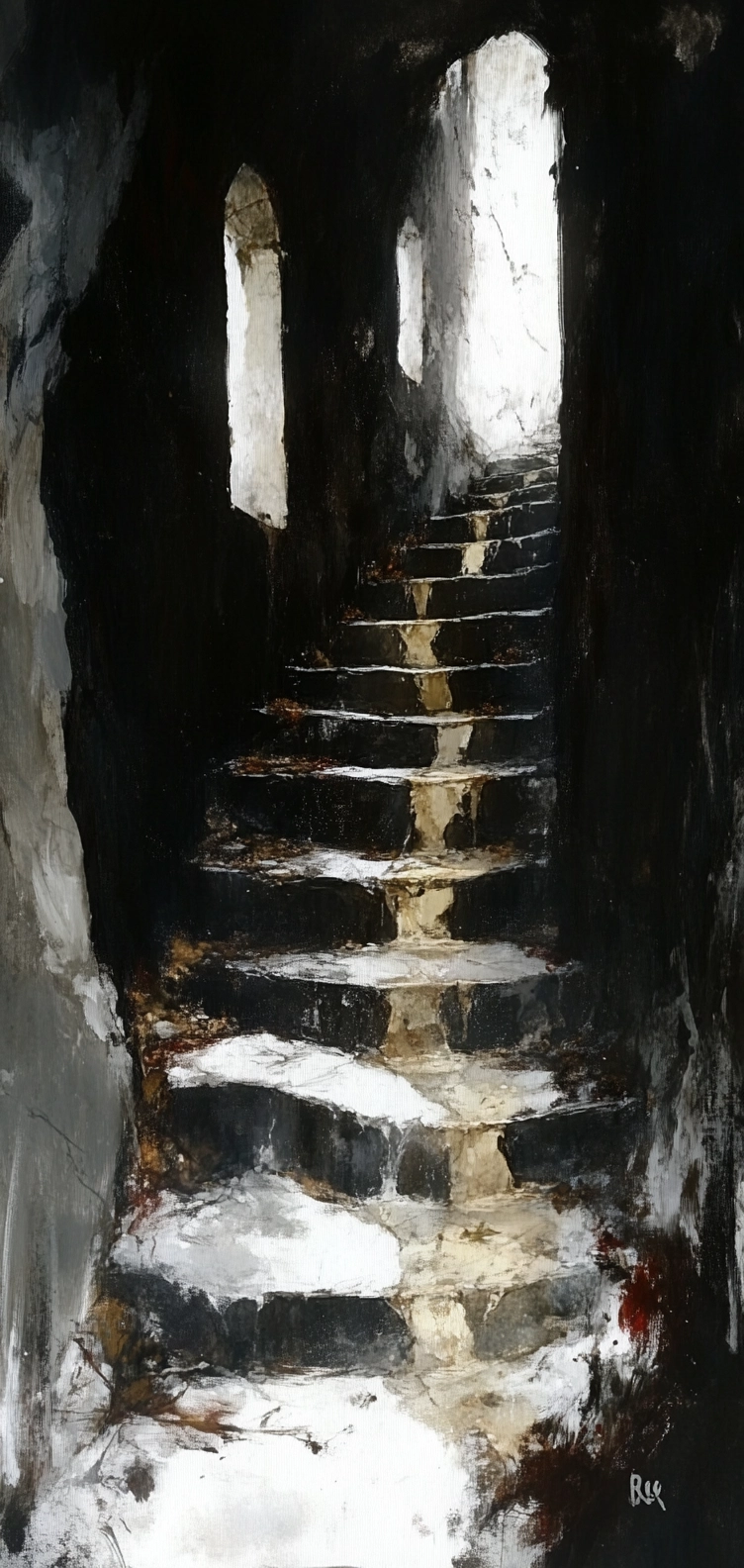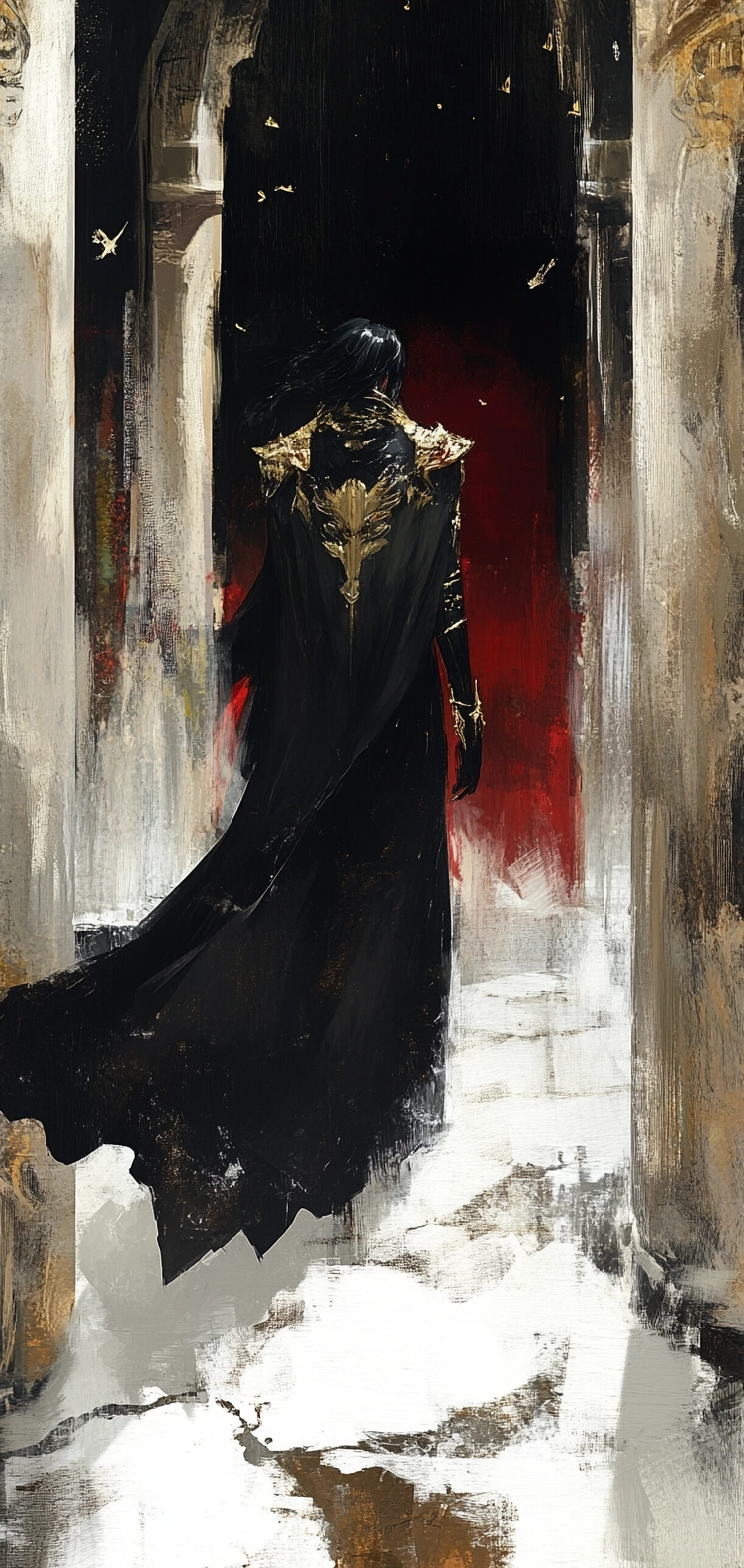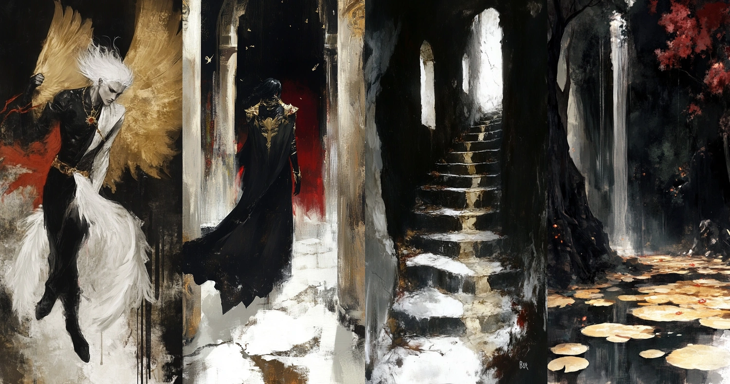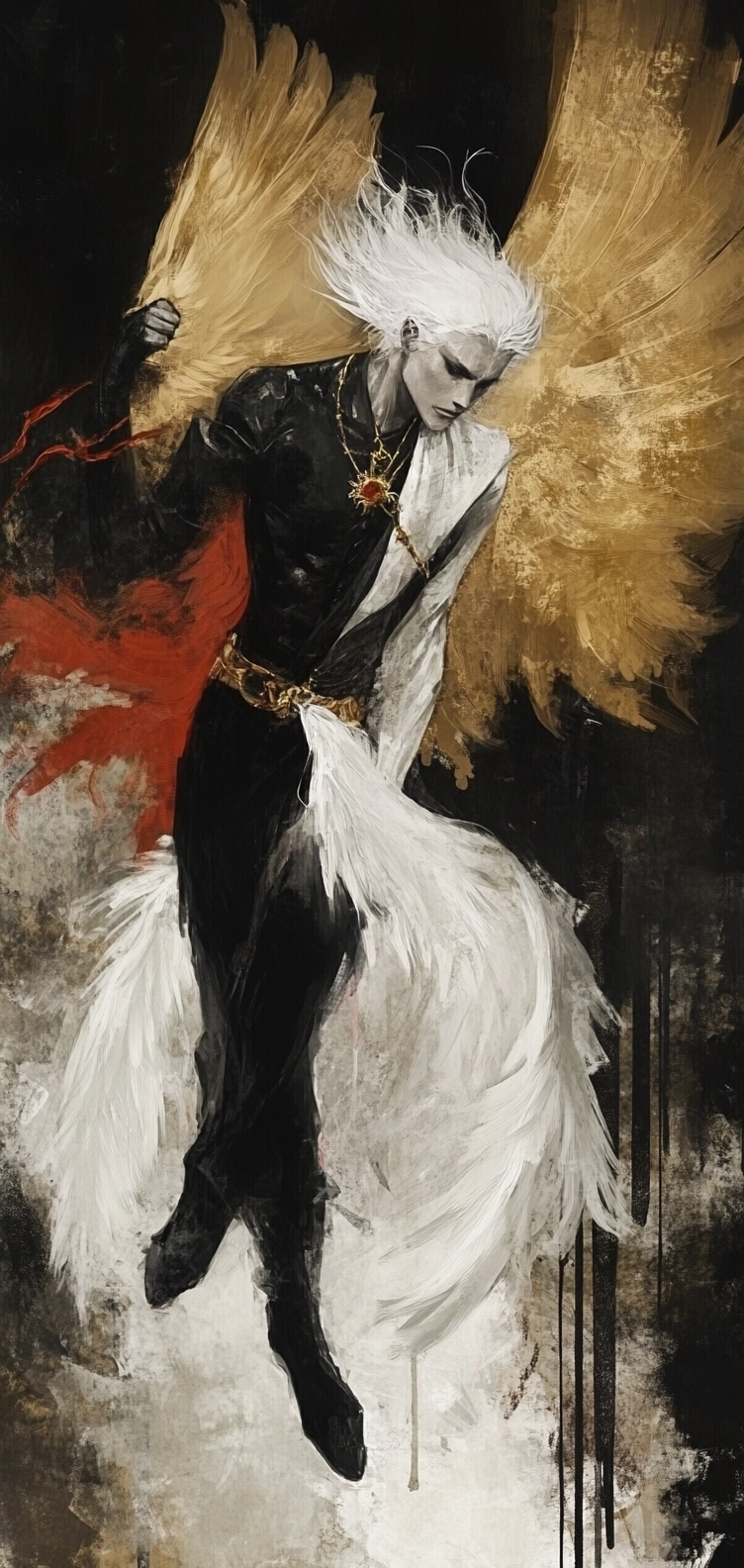 Intricate interplay between light and shadow enhances depth; gold contrasts with black and white, creating a dynamic visual tension; a tactile surface quality invites closer examination.
