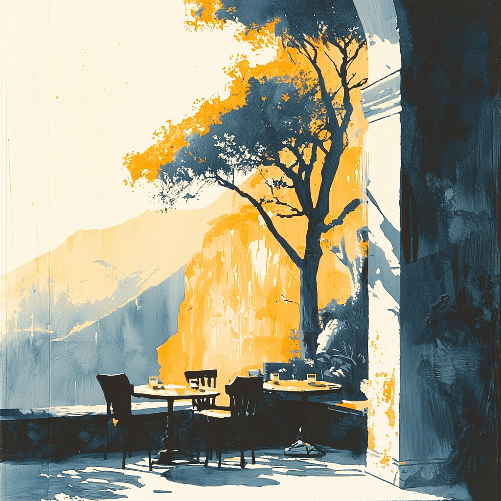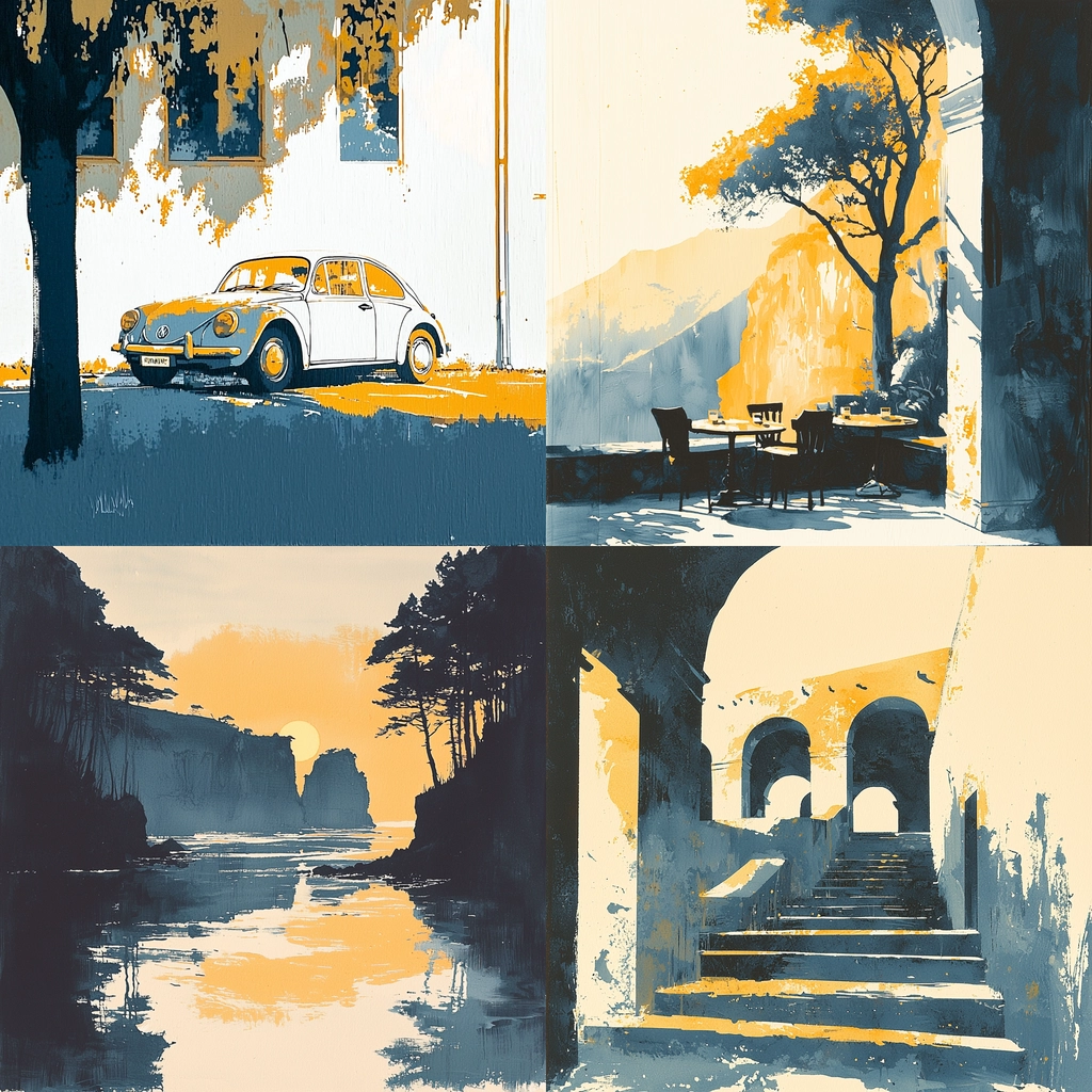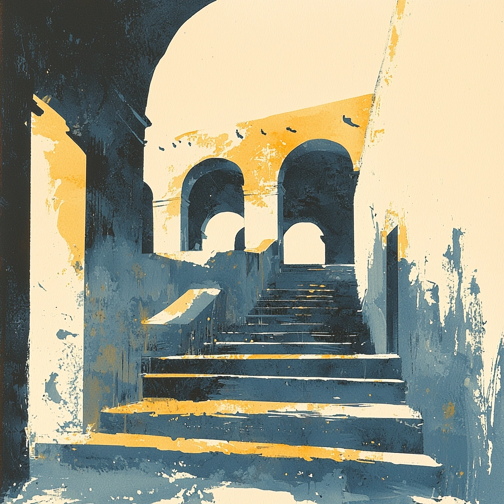 The lighting accents define structure clearly, allowing dark blues and golds to interact playfully across surfaces. The white backdrop offers an expansive sense of space, emphasizing crisp textures amidst calculated atmospheric depth.