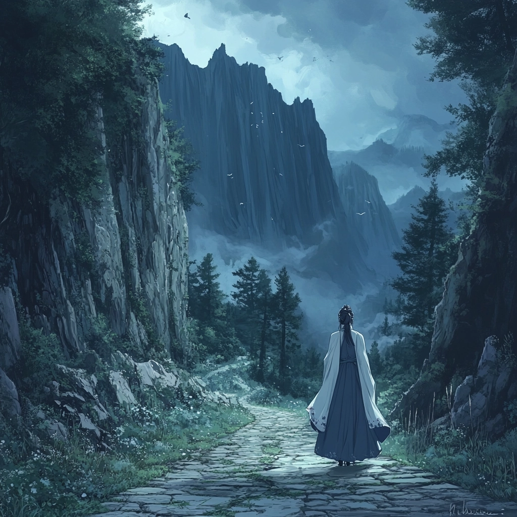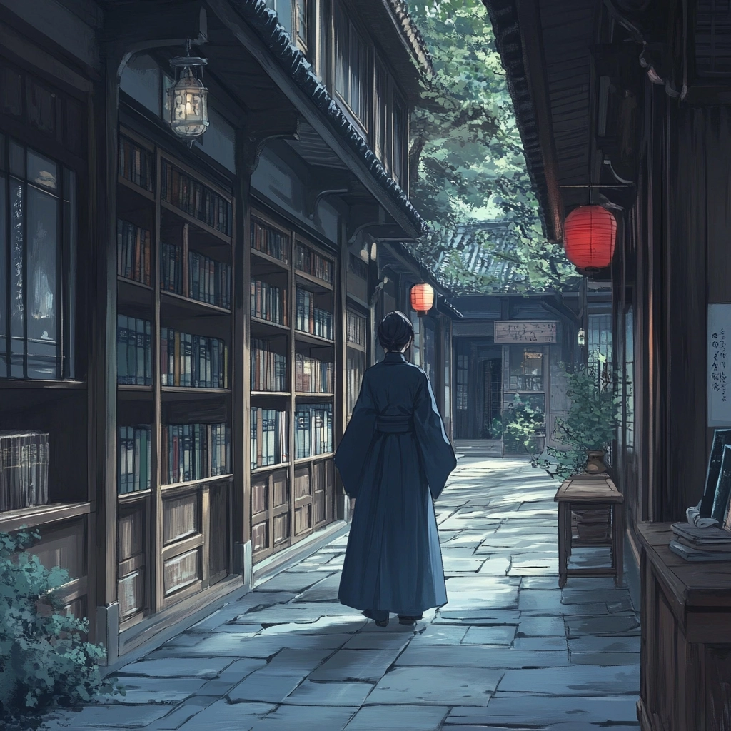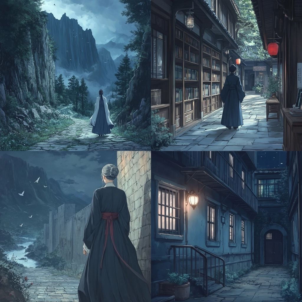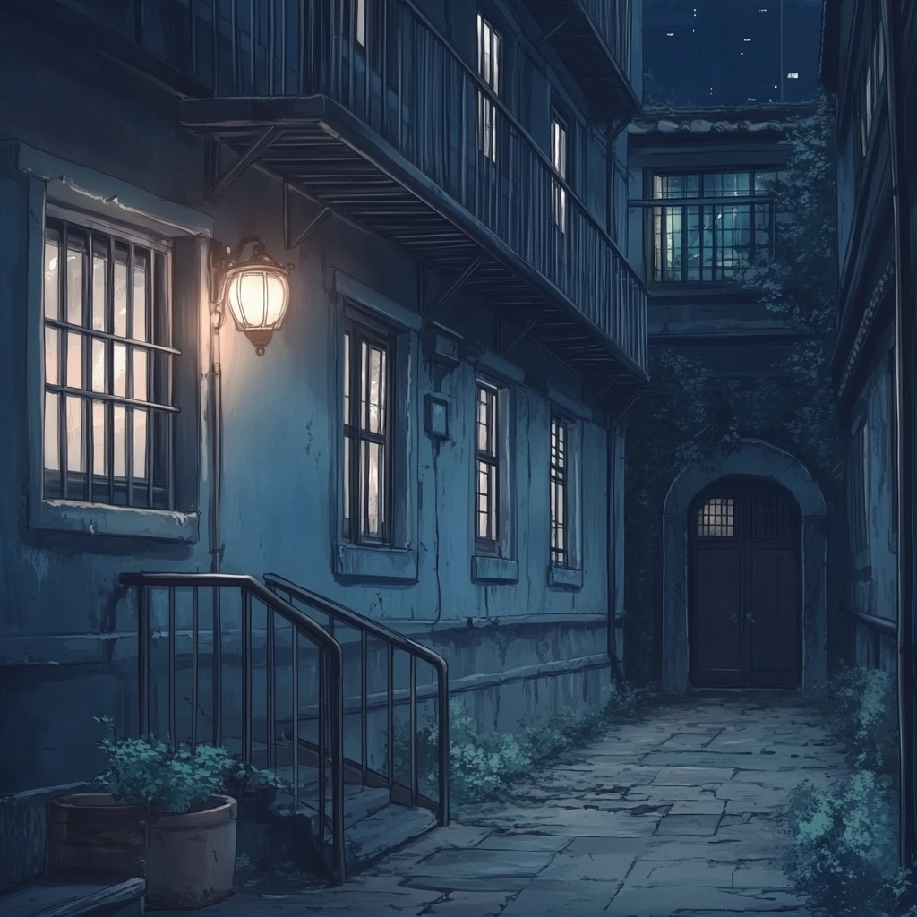 The scenes are heavily imbued with faint, cool blue tones and a distinct use of shadow to enhance depth. Textures are carefully rendered, focusing on details like stone and wood, creating a compelling spatial atmosphere where subtle light guides the narrative of each setting.
