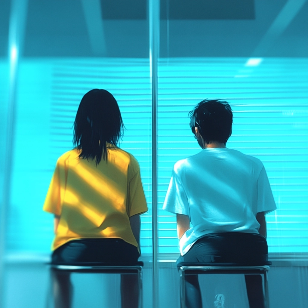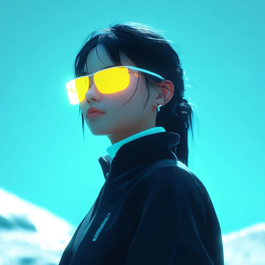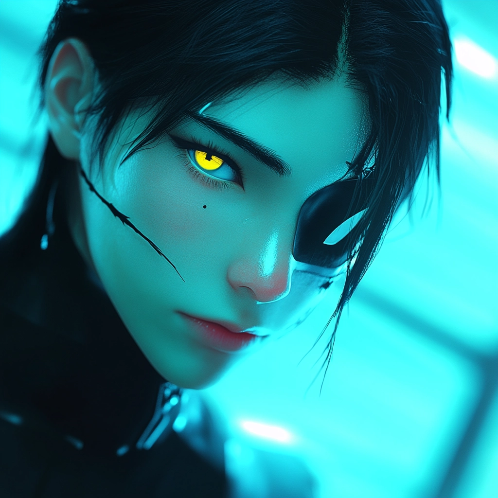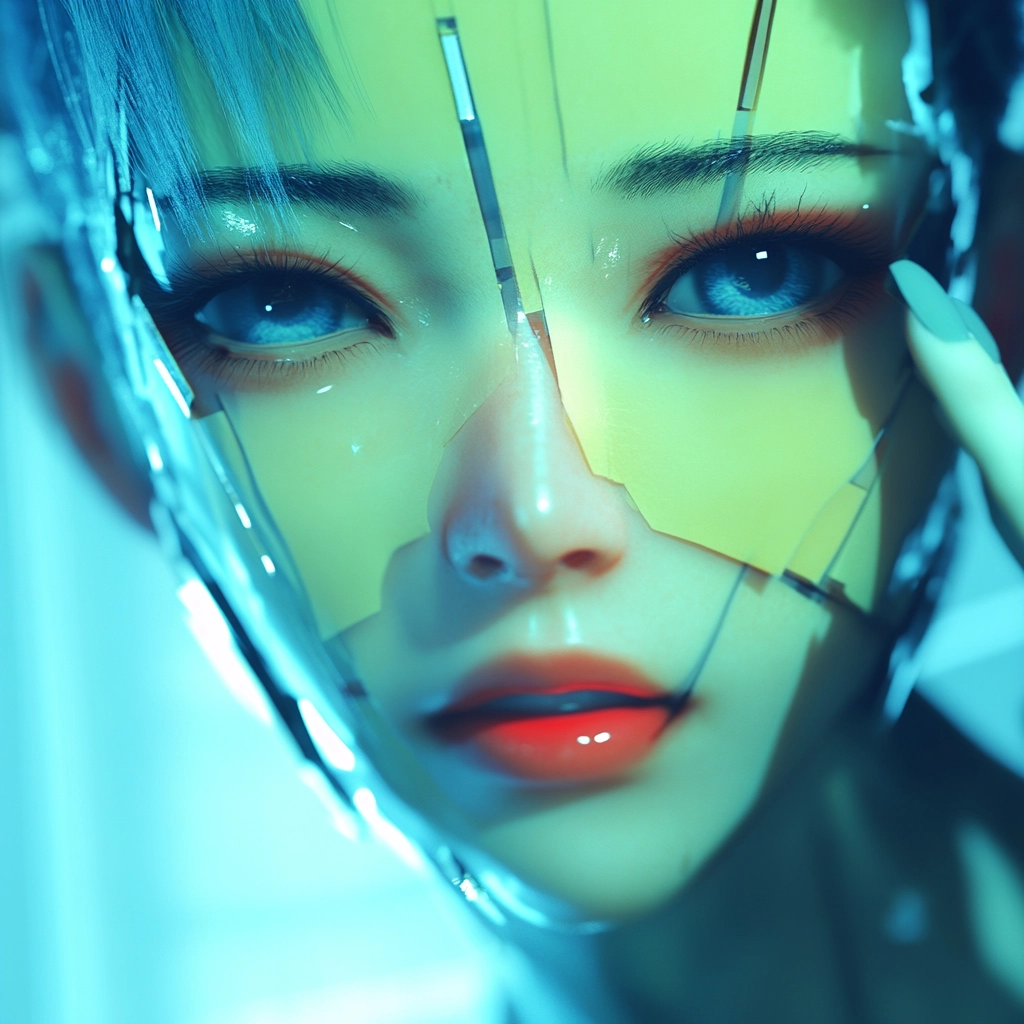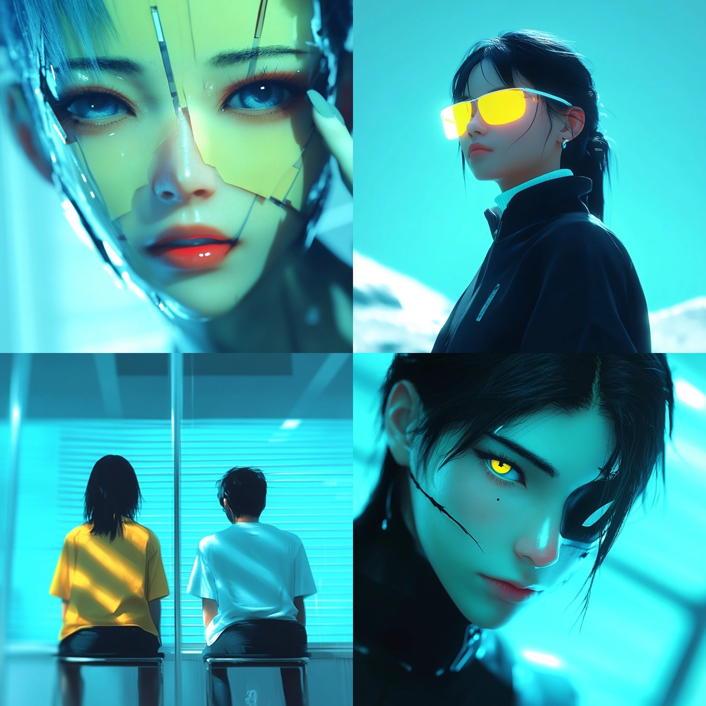 The composition employs cool tones with striking contrasts and cyan dominance.