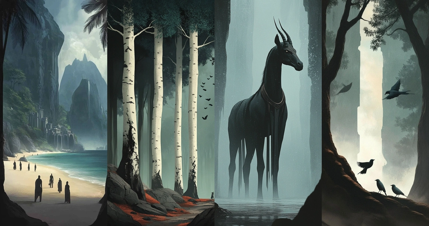 A collection of cool-hued landscapes rendered with detailed textures and varied light effects.