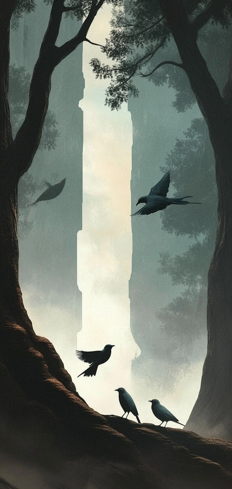 The piece features intricate lighting effects that create depth and highlight detailed textures. Cool colors dominate the palette, evoking an overall sense of calm. There is a strong spatial sense, with foreground and background elements meticulously balanced. Shadows and light are used to articulate the form and texture of natural elements.